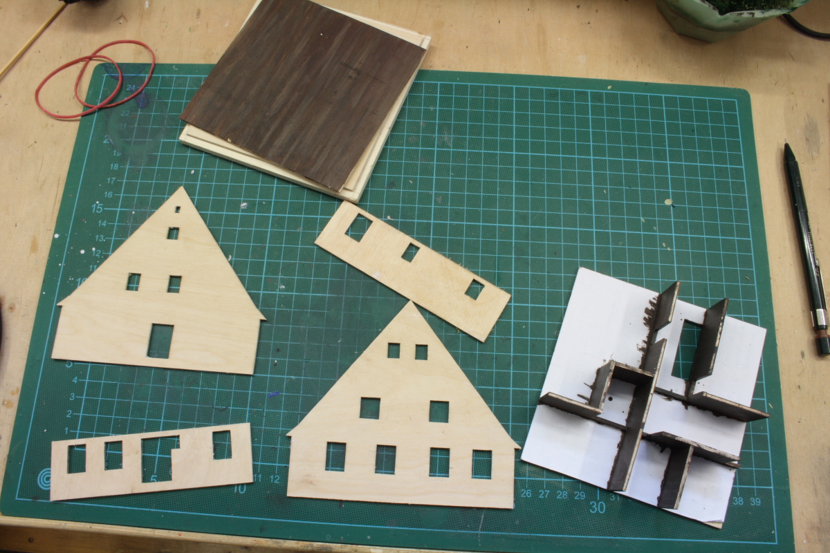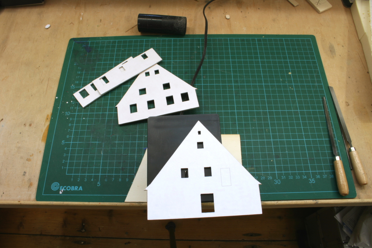 Für die Sperrholzwände habe ich einfache Zeichnungen in Coreldraw angefertigt, dabei die Materialstärke bzw. spätere Zugabe durch das Fachwerk von den Abmessungen abgezogen, die Zeichnungen auf Holz geklebt, mit der Böhler-Kreissäge ausgesägt und dann mit der Ministichsäge des gleichen Herstellers Tür- und Fensteröffnungen ausgeschnitten:
