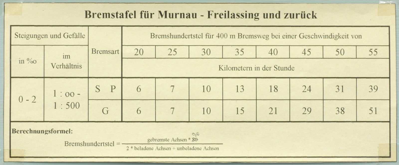 Die Bremshundertstel: 60 mal 8 gebremste Achsen / (2 mal 6 beladene Achsen +10 unbeladene Achsen) = 480 / 22 = 21 Bremshundertstel bedeuteten keine Einschränkung der Vmax von 35 km/h.