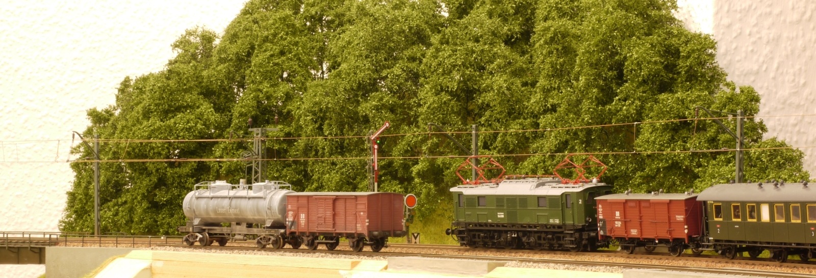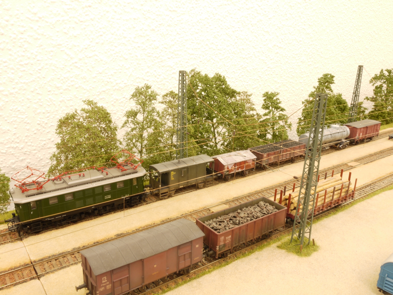 (12) Alle G10 auf diesem Bild stammen von Märklin, wobei die beiden hinteren ein neues Fahrgestell von Fleischmann bekommen haben, weil das vorhandene dieser Ex-Handbremswagen von Märklin so absolut grottig war. Der vordere der beiden hat ein umgearbeitetes Bremserhaus von Piko bekommen und ist damit wieder ein Handbremswagen.