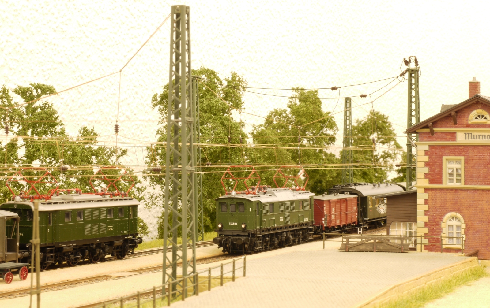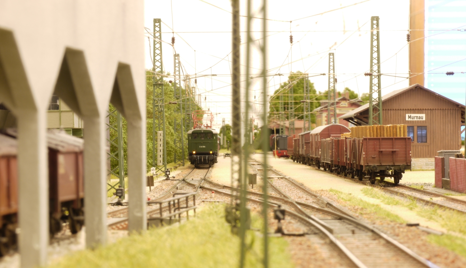 Im Vordergrund auf Gleis 1 sind drei Wagen zu sehen, die erst am nächsten Tag mit Ng 8014 Murnau wieder verlassen. Der italienische F-Wagen hatte Obst für eine kleine Konservenfabrik in Murnau gebracht. Der Besitzer der Fabrik hofft inständig darauf, dass die Streckenverlängerung nach Griesen eines Tages kommt, denn dort wäre Platz für ein neues großzügiges Gelände, sogar mit einem eigenen Gleisanschluss. Der Ommpu 49 der Saar-Bahn ist mit Schrott beladen worden und der R 10 dahinter ist mit den ganz besonderen Murnauer Lärchenholzstämmen, die nicht oft, aber manchmal doch, andernorts gefragt sind.