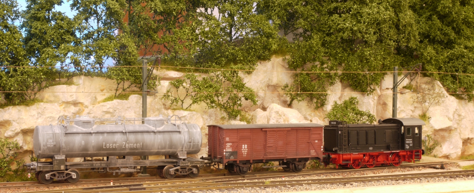(1) Der G 09 ist leer und wird im Werk mit Zementsäcken beladen, wobei dieser ex-USATC-Wagen maximal 12 t laden kann. Die Doppeleinheit KK 15 bringt ca. 30 t Gips als Zuschlagstoff für die Zementherstellung. Die Übergabe bringt 30 Bremshundertstel mit; es darf also die allgemeine Höchstgeschwindigkeit für Güterzüge von 35 km/h gefahren werden.