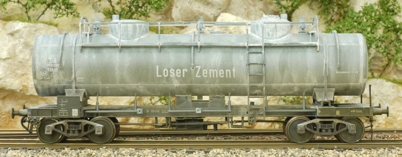 (11) Der KKd 49 (ex USATC) stammt von Klein, der Kessel ist aber wie bei seinem Vorbild um 200 mm höher gesetzt worden, um den Entladeeinrichtungen unter dem nun dreigeteilten Kessel genügend Raum zu bieten. Ich habe zwei Quellen benutzt, einmal "Stefan Carstens - Hans Ulrich Diener - Gedeckte Wagen - Sonderbauarten" und "Gerd Wolff - Die vierachsigen Selbstentladewagen - Die Staubbehälterwagen" vom EK-Verlag, wo auch das Entstehen der Druckluftentladung auch am Beispiel der KKd 49 kurz erklärt wird. Die Entladeeinrichtung ist aus Drähten und Röhrchen zusammengelötet. Für die Erhöhung des Kessels habe ich erst einmal das Blech, welches ursprünglich der Obergurt des Hauptquerträgers war, so viel dünner gefeilt, dass es einem Blech ähnlich sieht. Die neue Zwischenlage besteht aus einem Hohlträger, den ich aus Polystyrol nachgebildet habe. In Wagenmitte gab es eine Verbindung zwischen Kessel und dem Untergestellbalken. Diese wurde wurde entsprechend den Fotos und der neuen Kesselhöhe adaptiert. Was fehlt, sind die Spritzschutzbleche über den mittleren Radsätzen. Logischerweise müssten über den Endradsätzen auch welche gewesen sein. Darüber habe ich nichts in Erfahrung bringen können. Deswegen habe ich sie ganz weggelassen.