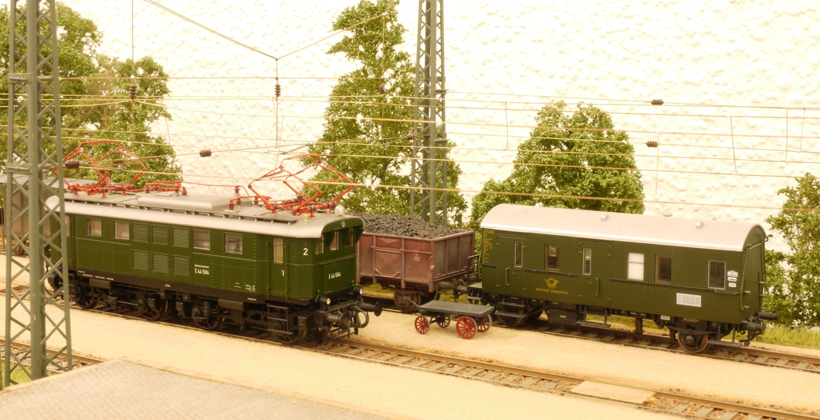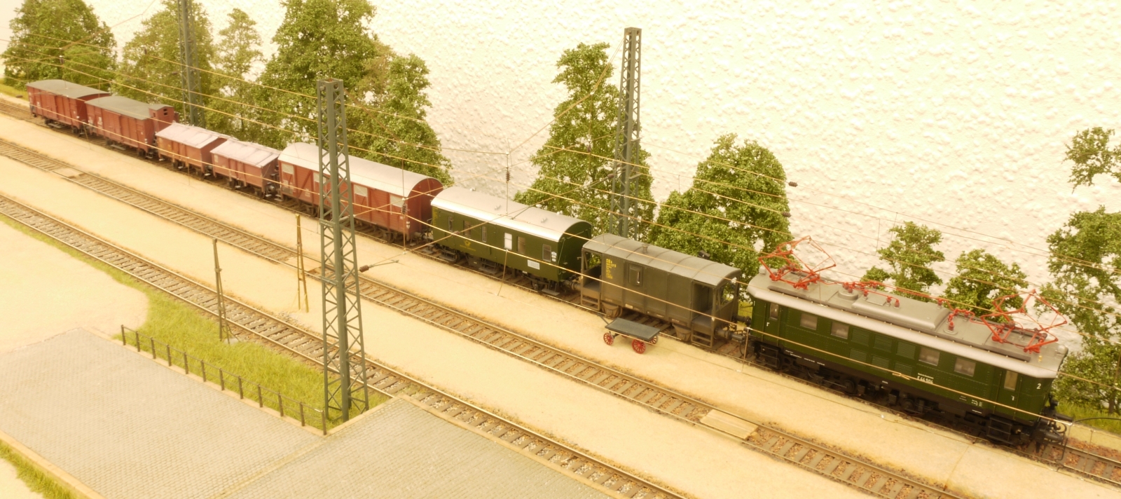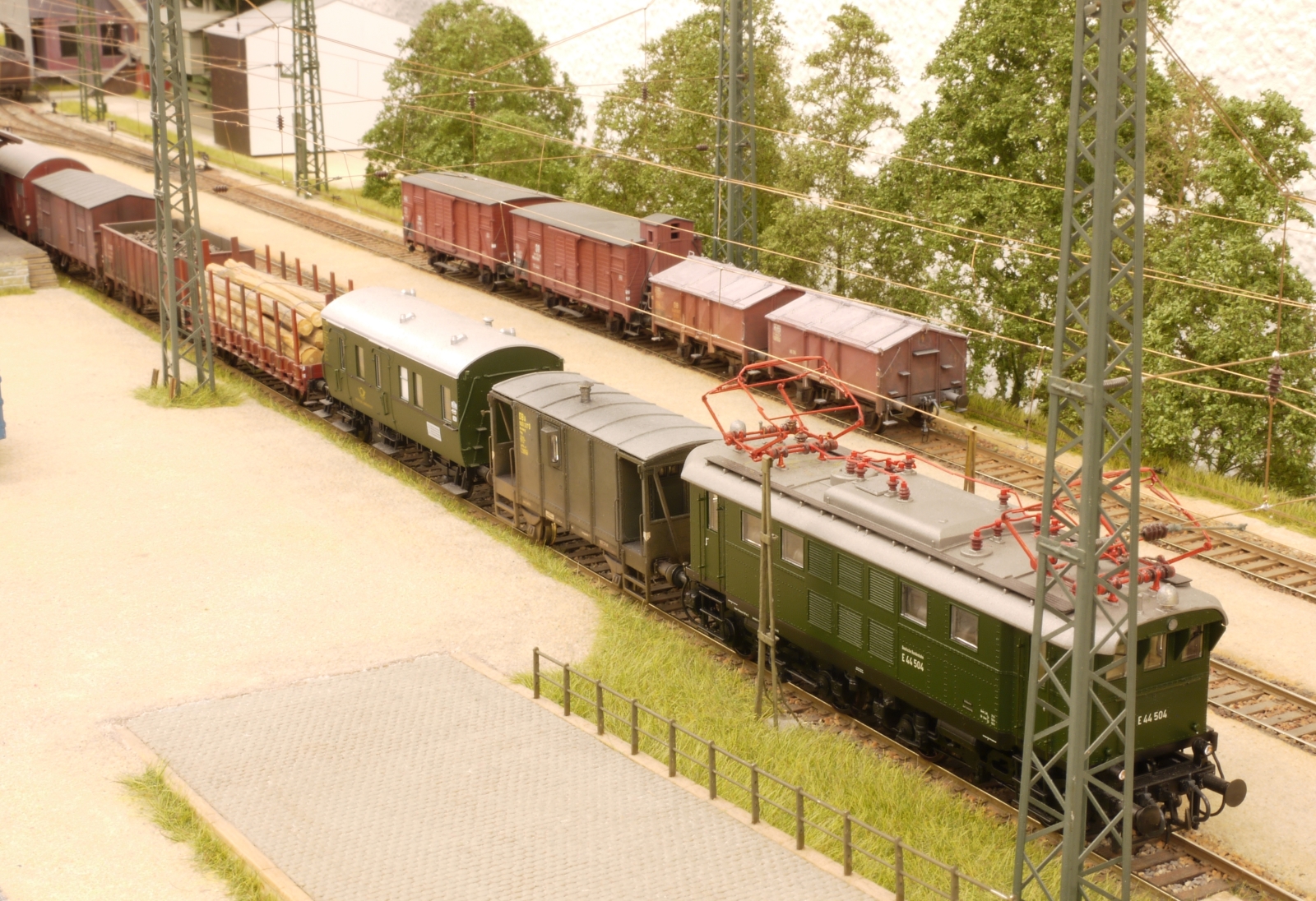 (26) Doch vorher gibt es noch eine Kreuzung. P 4025 mit E44 508 und dem Milchkurswagen an der Spitze naht zur Einfahrt in Gleis 2.