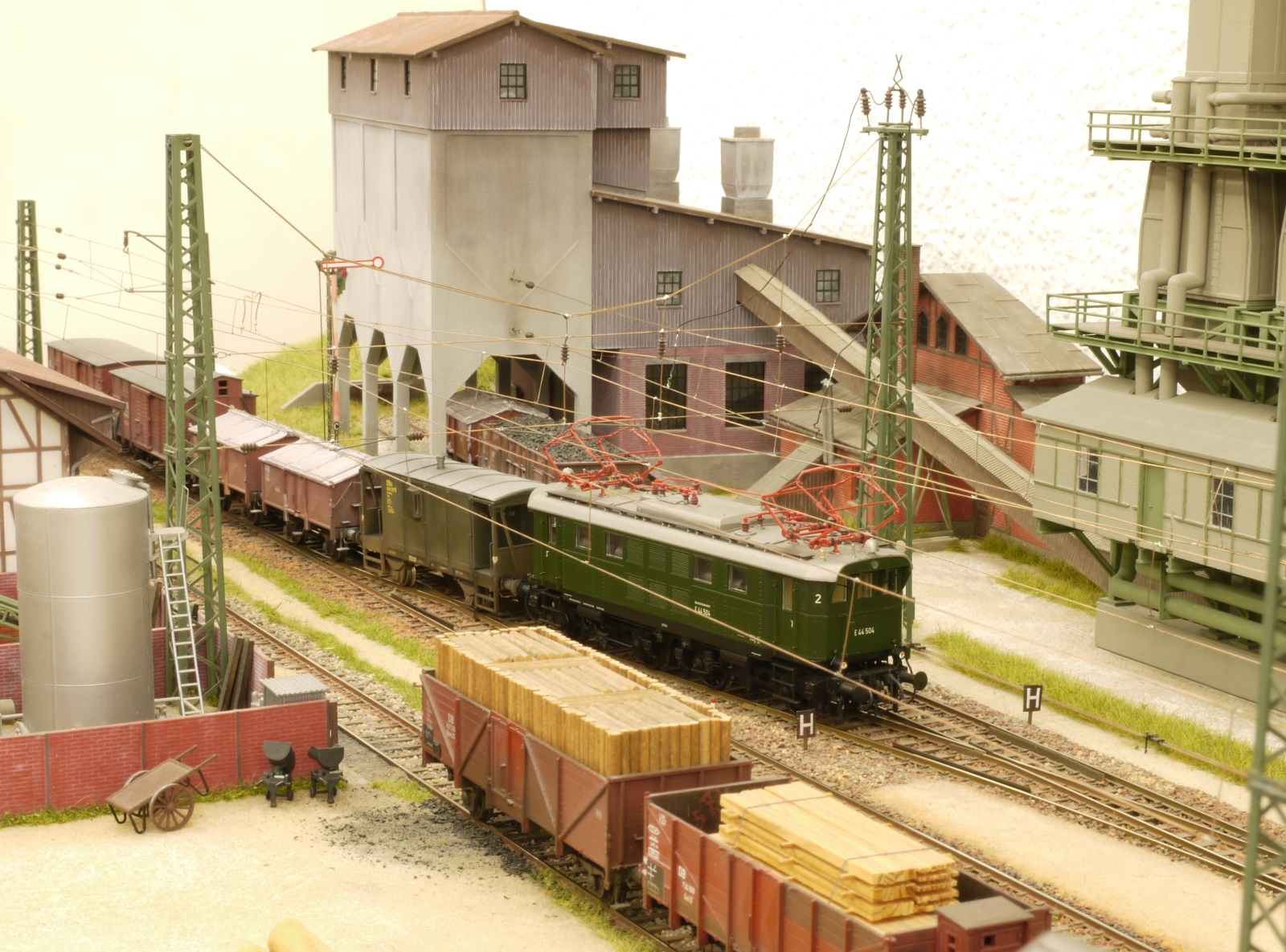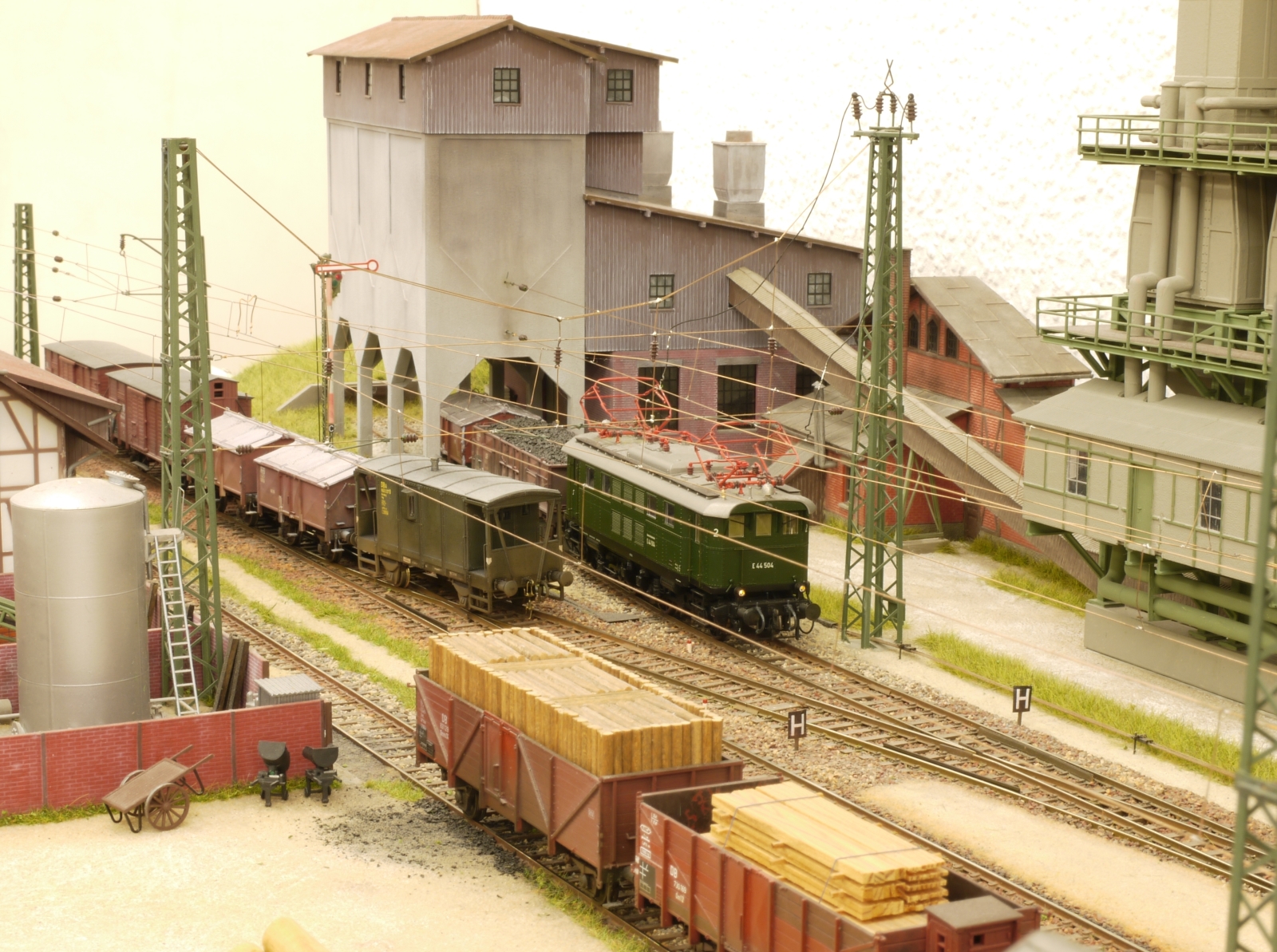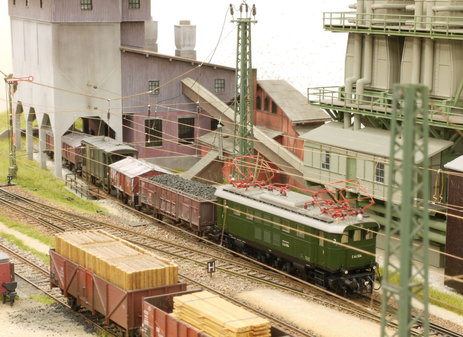 (4) Lok umlaufbedingt nun E44 504, Pwg 09 wie gehabt, ein leerer K-15-Leitungswagen und ein mit Koks beladener Omm-39-Leitungswagen, beide für das Kalkwerk. Dann folgen noch zwei leere Wagen für das Zementwerk, ein Kkd 49 und ein G 10.