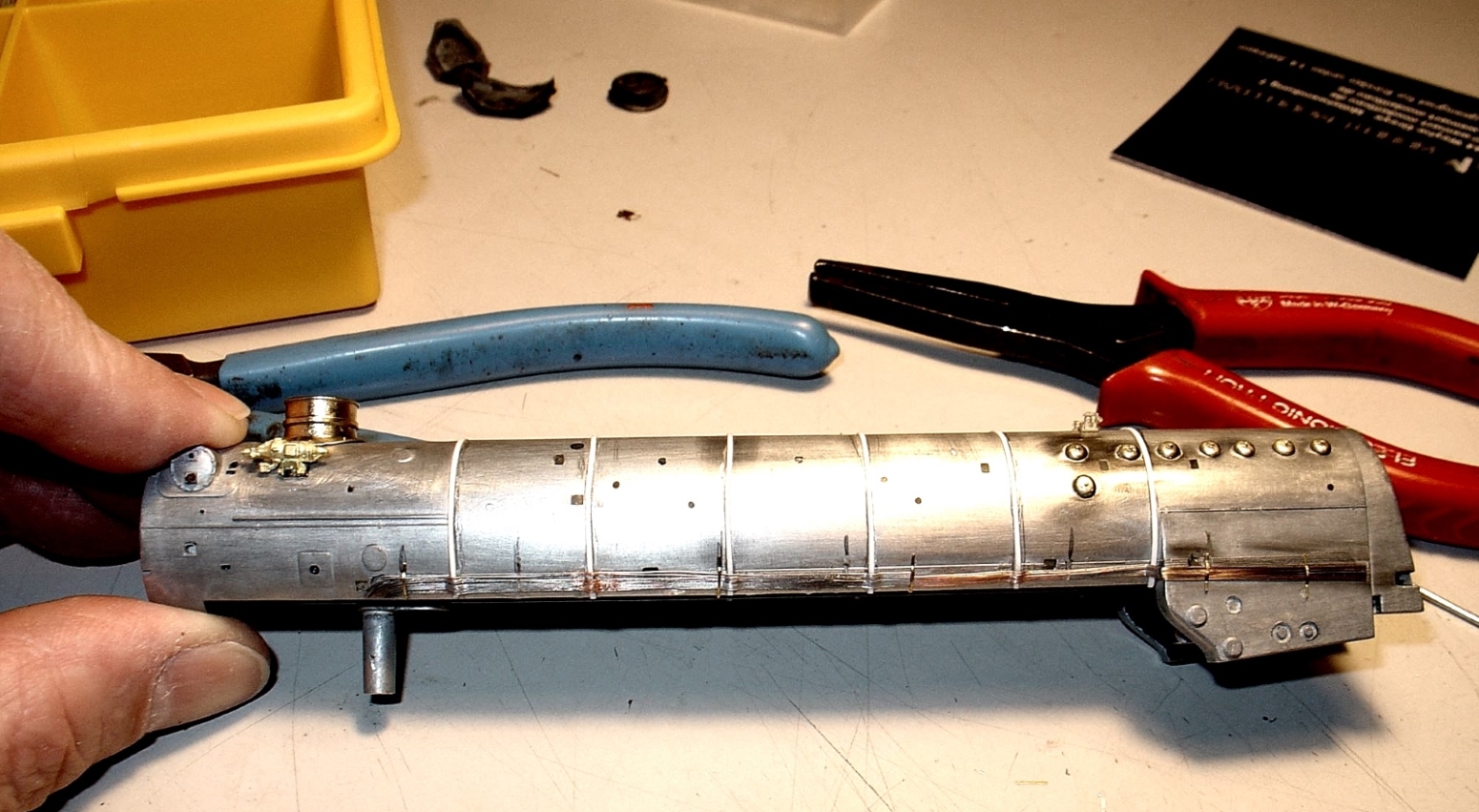 Im ersten Schritt stand die Demontage des Modells auf dem Plan. Das ging noch relativ einfach, endete aber mit dem ersten Schreck. Der Kessel des Modells besteht aus Metall. Bei der Lok sollten die Dome getauscht werden und ich hatte doch die Hoffnung, dass die angegossenen Dome von innen hohl wären. War aber nichts.