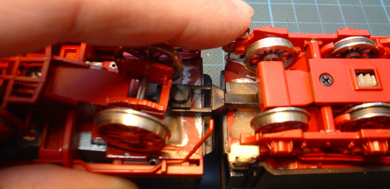 Eigentlich ein guter und gangbarer Weg. Ich habe zunächst einen anderen Weg gewählt. Eine feste Lok-/Tender Kupplung, die noch mit einer Feder unterstützt wird. Jeweils an Lok und Tender befinden sich plane Flächen, an der sich die einzelnen Teile ausrichten, was noch durch die Feder verstärkt wird. (Die Feder versteckt sich unter dem Nachlaufgestell)