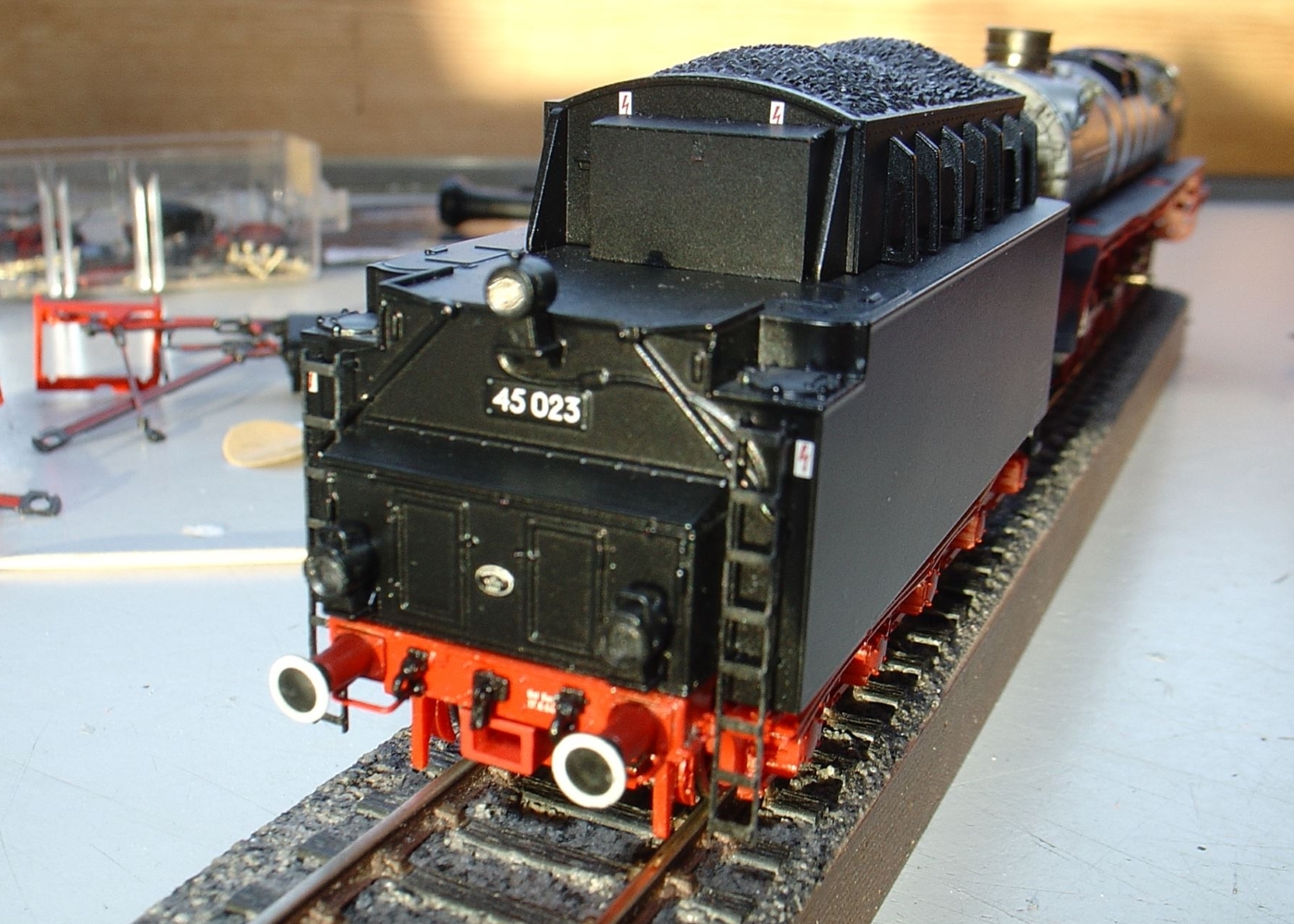 bedurfte auch ein paar Nacharbeiten. Zwar waren es im Vergleich zur Lok nur Kleinigkeiten, aber neue Tenderleitern, den Mechanismus zur Lukenöffnung und natürlich neue Lampen sollten es schon sein.