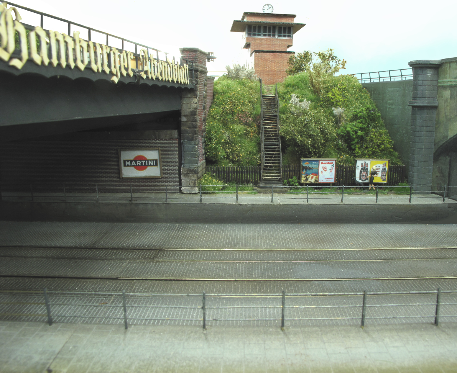 ...zeitgenössische Werbung an der reichlich windschiefen Treppe zum Stellwerk. Und dazu noch eine Blondine, die möglicherweise Gefallen am "kühlen Blonden" hat... ;)