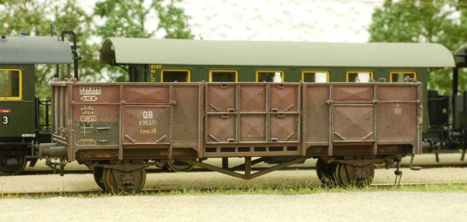 (7) Und so sieht er von innen aus. Man sollte es kaum glauben, aber es war mal ein altes Piko-Modell. Vom Aufbau wurde als erstes der Boden rausgesägt – der war eh viel zu hoch – und dann mit der dicken Schruppfeile die Seitenwände bearbeitet, so lange, bis sie mir zart genug erschienen. Das dauert zwar, führt aber letztlich zum Erfolg. Bevor ein neuer Boden eingeklebt wird, kann man noch die senkrechten Fugen der Klappen mit Hilfe eines dünnen Sägeblattes andeuten. Da, wo keine Fugen hin gehören, werden sie halt wieder zugespachtelt. Das Piko-Fahrgestell habe ich in der schon mal beschriebenen Weise [EMB-Forum - siehe hier] (Bild 3) verschmälert.