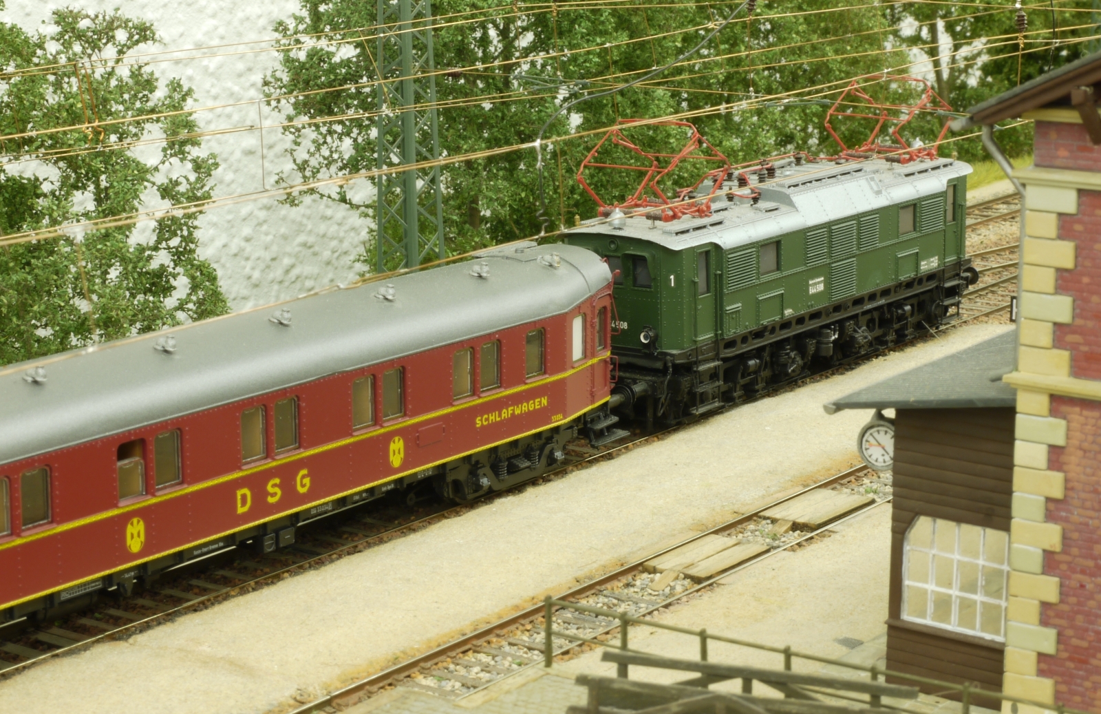 Das Letztere ist der eigentliche Grund für die modellbahnerische Zeitverkürzung, denn mit Maßstäblichkeit hat die Zeitverkürzung nichts zu tun. Bei mir passte 1:3 ganz gut. Damit dauert ein Betriebtag etwa 6 bis 7 Echtzeitstunden, was natürlich nur mit (durchaus beliebigen) Unterbrechungen zu schaffen ist. Aber anhand des momentanen Standortes der Fahrzeuge kann ich auch ohne Uhr in jedem Fall erkennen, was zuletzt gewesen ist.