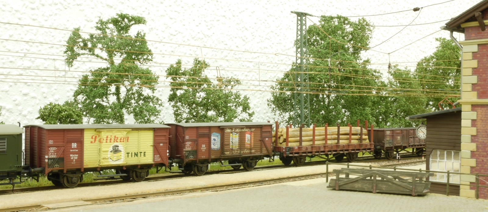 (14) Als Stückgutwagen sind zwei der fünf Werbe-Güterwagen, die im Jahre 1952 von der Firma „Deutsche Eisenbahn-Güterwagen-Reklame“ Fr. Albert Jentsch (alleiniger Lizenzträger für Güterwagen-Werbung) hergerichtet worden sind, „zufällig“ zusammengekommen. Ich vermute, das Ganze war ein Schuss in den Ofen, denn außer auf den Bildern in dem Werbeprospekt obiger Firma ist später nie ein Foto eines solchen Wagens aufgetaucht.