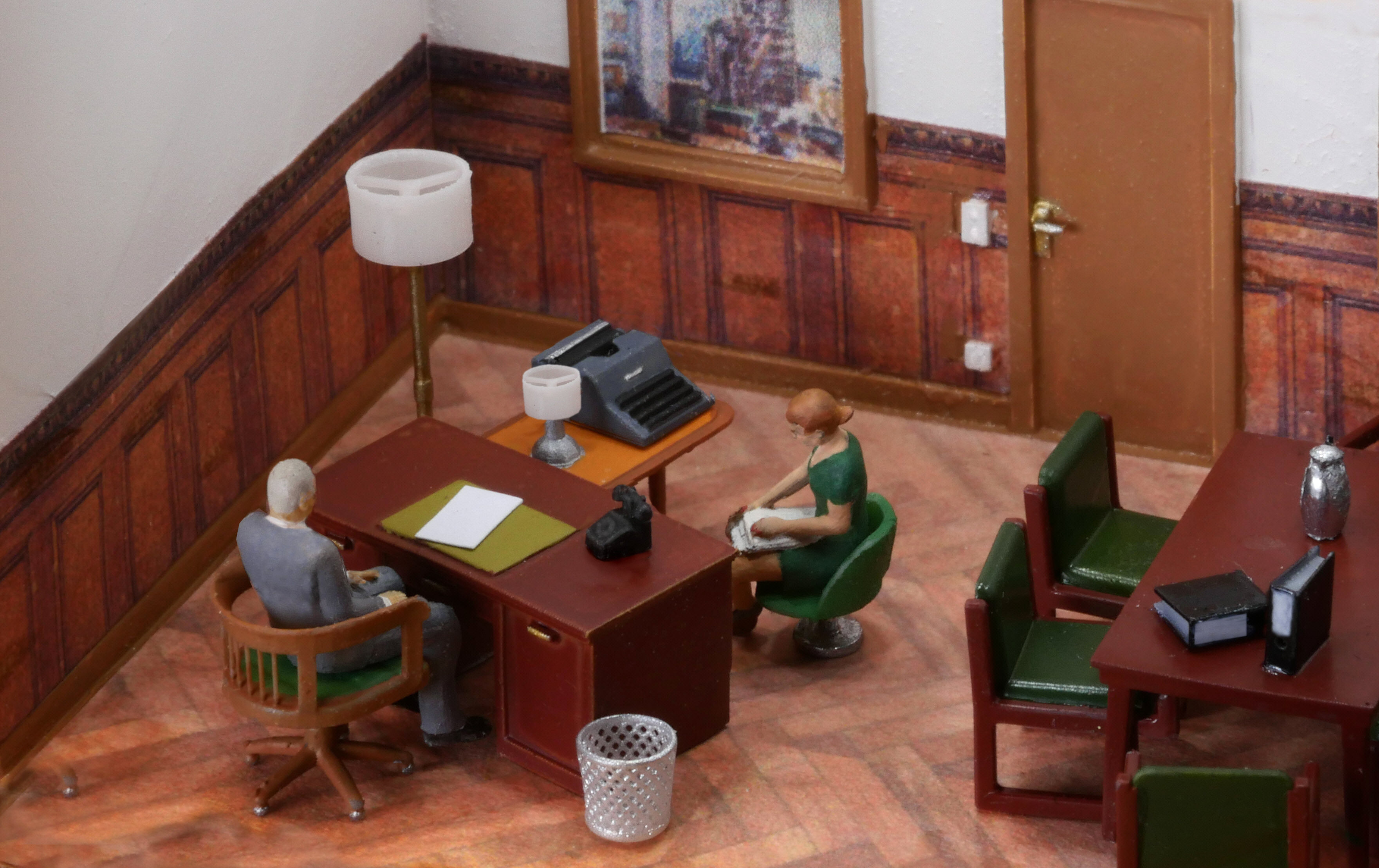 Just die Kästchen könnte man aber doch im gediegenen Stil der Schwerindustrie gestalten, mit Holzverkleidung, schwerem Parkett und Gemälden an der Wand. Noch ein CIWL-Tischchen und eine Schreibmaschine sowie die passenden Figuren dazu, dann wirkt das Ganze doch schon ganz passabel.