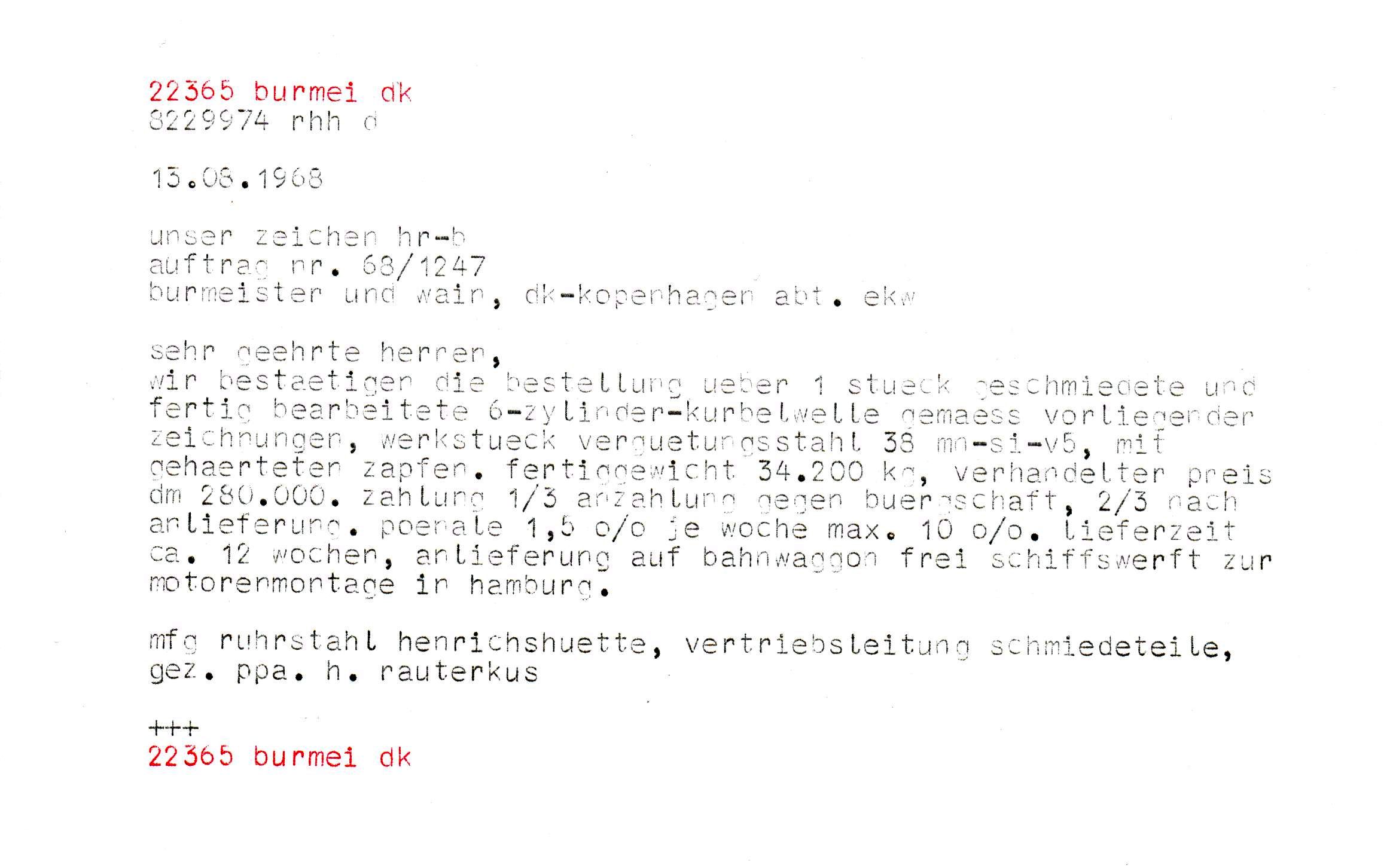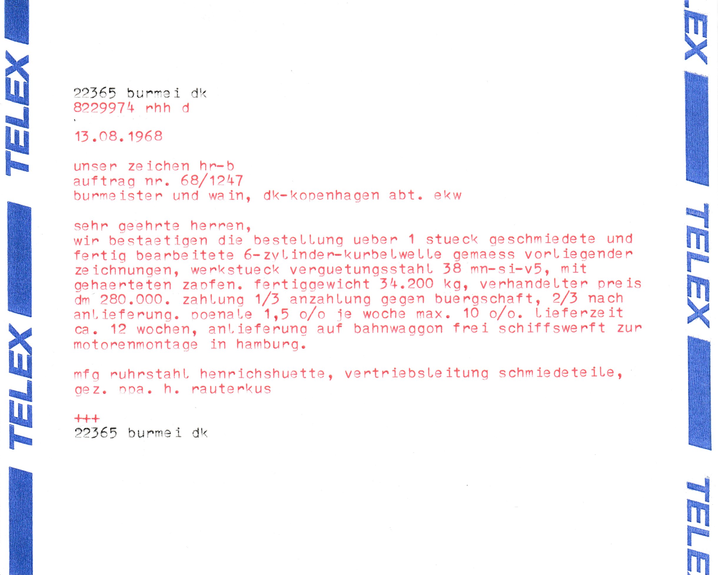 Fast hat er die Hoffnung aufgegeben, da rattert der Fernschreiber nebenan im Vorzimmer. Wie vor Wochen vereinbart, bestellt der treue dänische Kunde Burmeister&Wain aus Kopenhagen tatsächlich absprachegemäß noch eine Schiffskurbelwelle für eine 6-Zylinder-Dieselmaschine. Geht doch, auf die Jungs aus dem Norden kann man sich verlassen! Hugo steckt sich erstmal eine gute Zigarre an und diktiert seiner Sekretärin flott ein Antwort-Telex mit der Auftragsbestätigung.