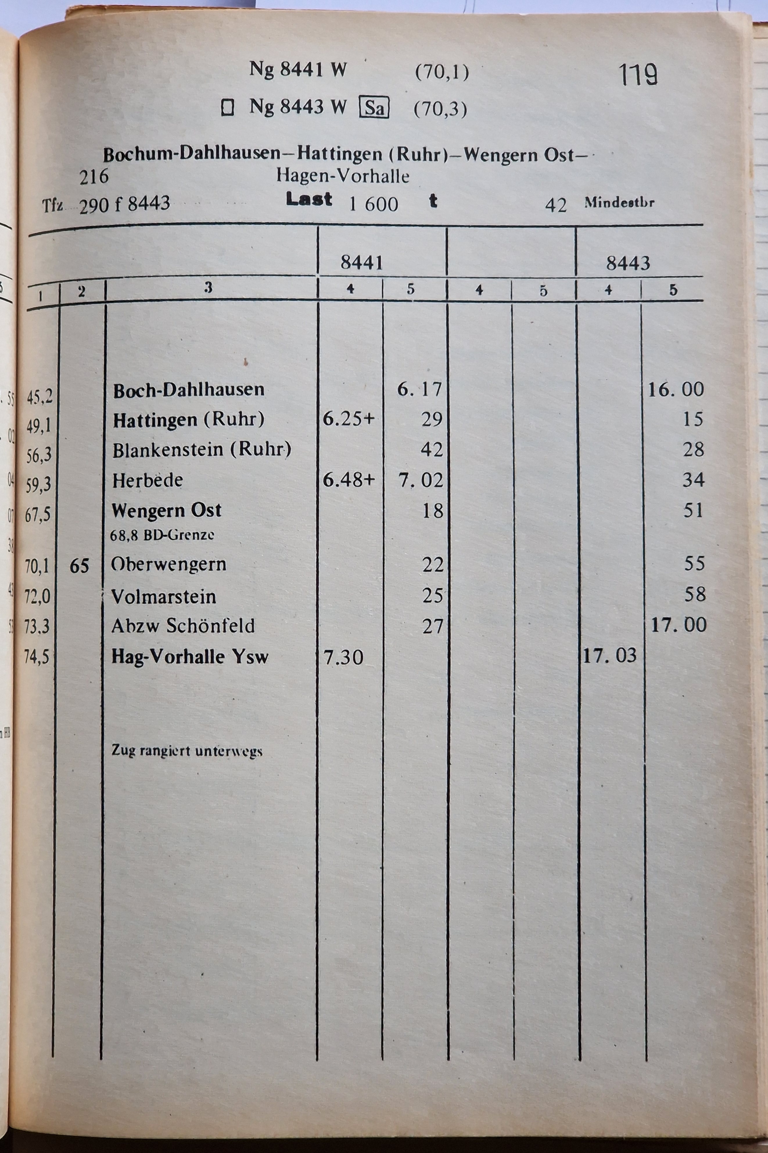 Die Übergabe wird dann im DB-Bahnhof Hattingen in den Ng 8443 von Bochum-Dahlhausen zum Rangierbahnhof Hagen-Vorhalle eingereiht, der auf dem Weg dorthin an der Hütte vorbeifährt: