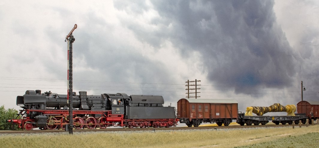 Vor- und Hauptsignal geben dem herannahenden Güterzug, dessen 50er durch eine 50.40 Bauart Franco-Crosti abgelöst wurde, freie Fahrt. Sie schnaubt mächtig, sie schleppt mal wieder schwere Last. Willi schaut auf die vorbeirollenden Waggons: keine Bremse glüht, keine Ladung verrutscht, keine schlechten Geräusche. Und auch der letzte Waggon ist dran. Also schnell Weitermeldung zum Block Lemförde, Signale auf "Halt" hebeln und dann die Schranken öffnen, damit Heinrich nach Hause fahren kann.