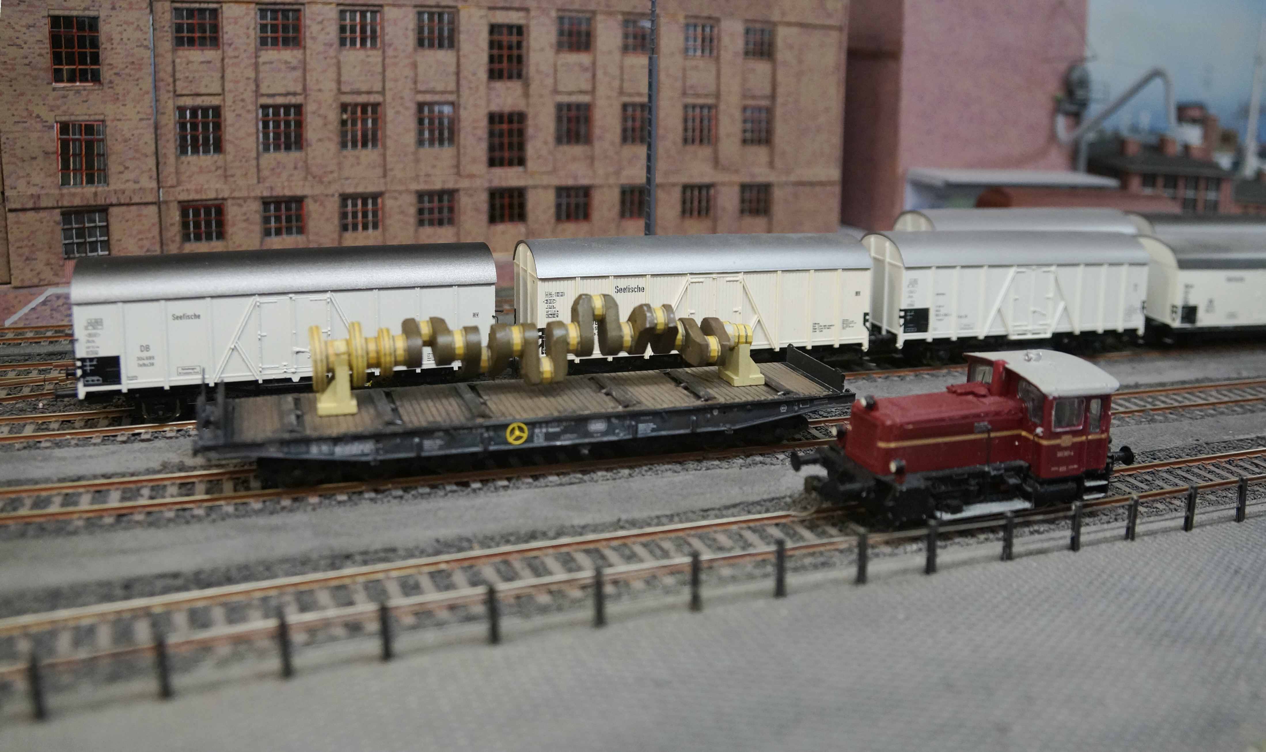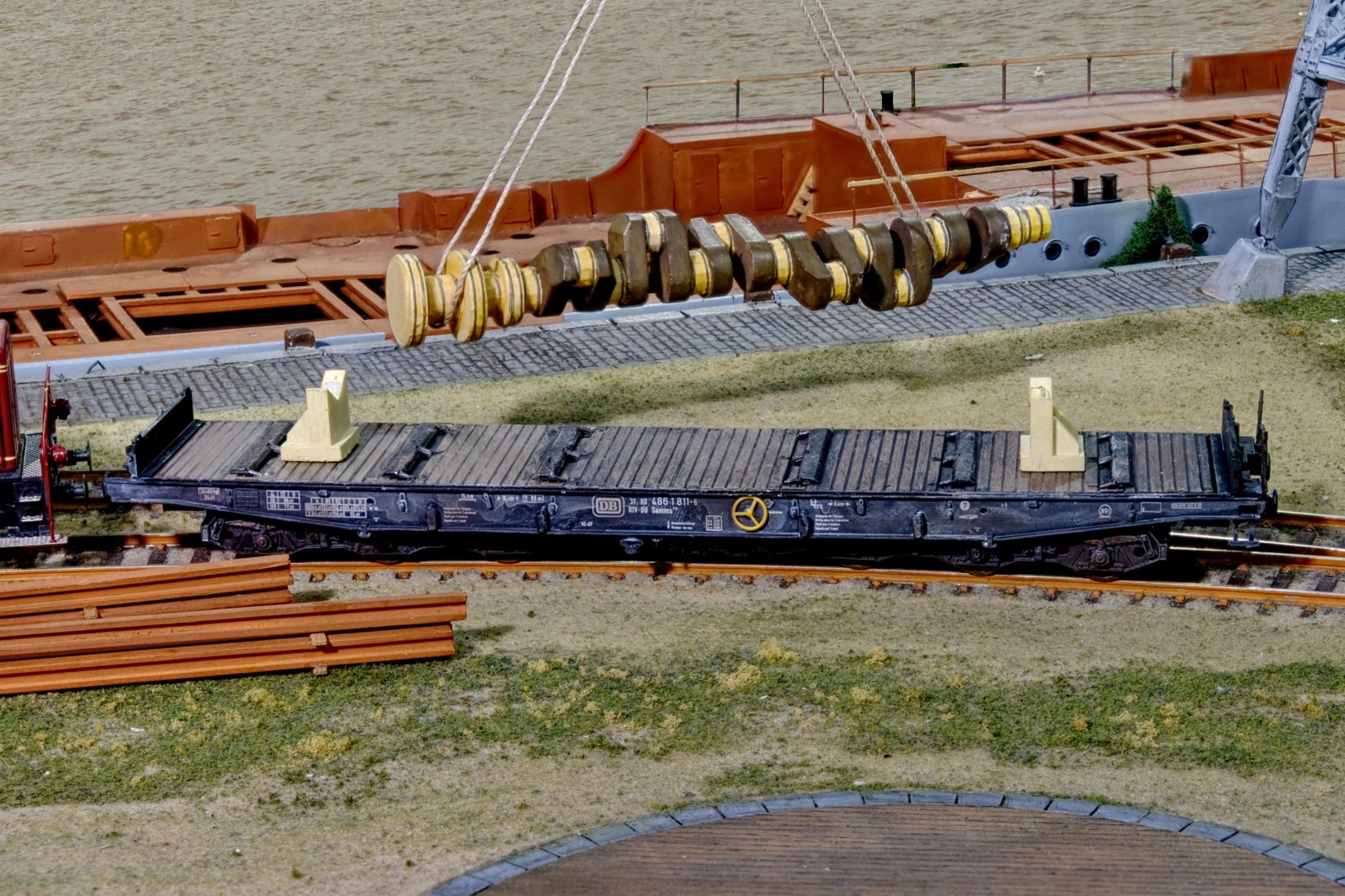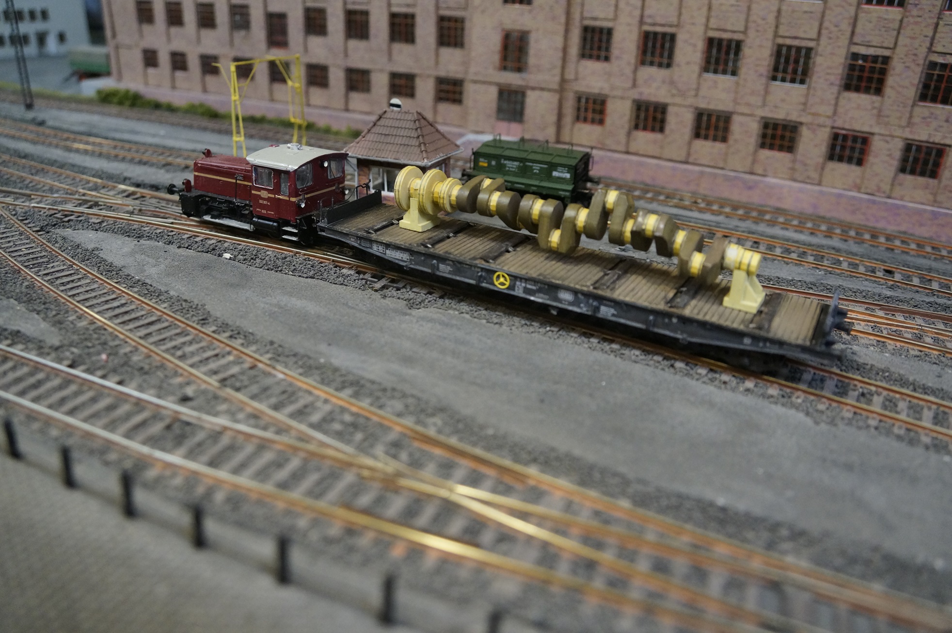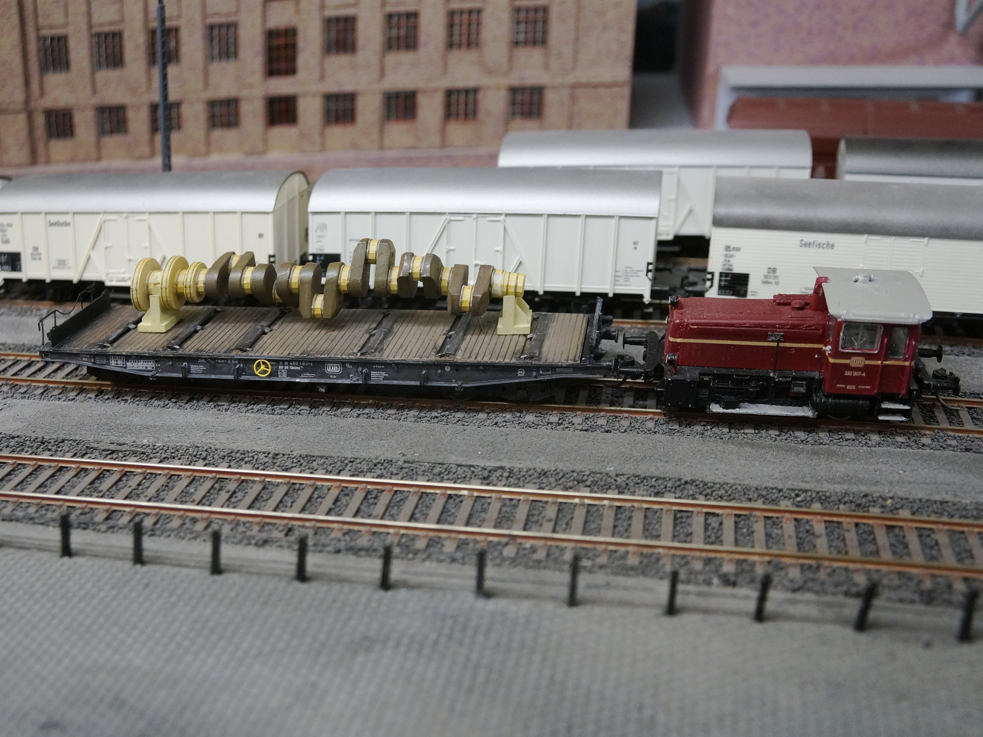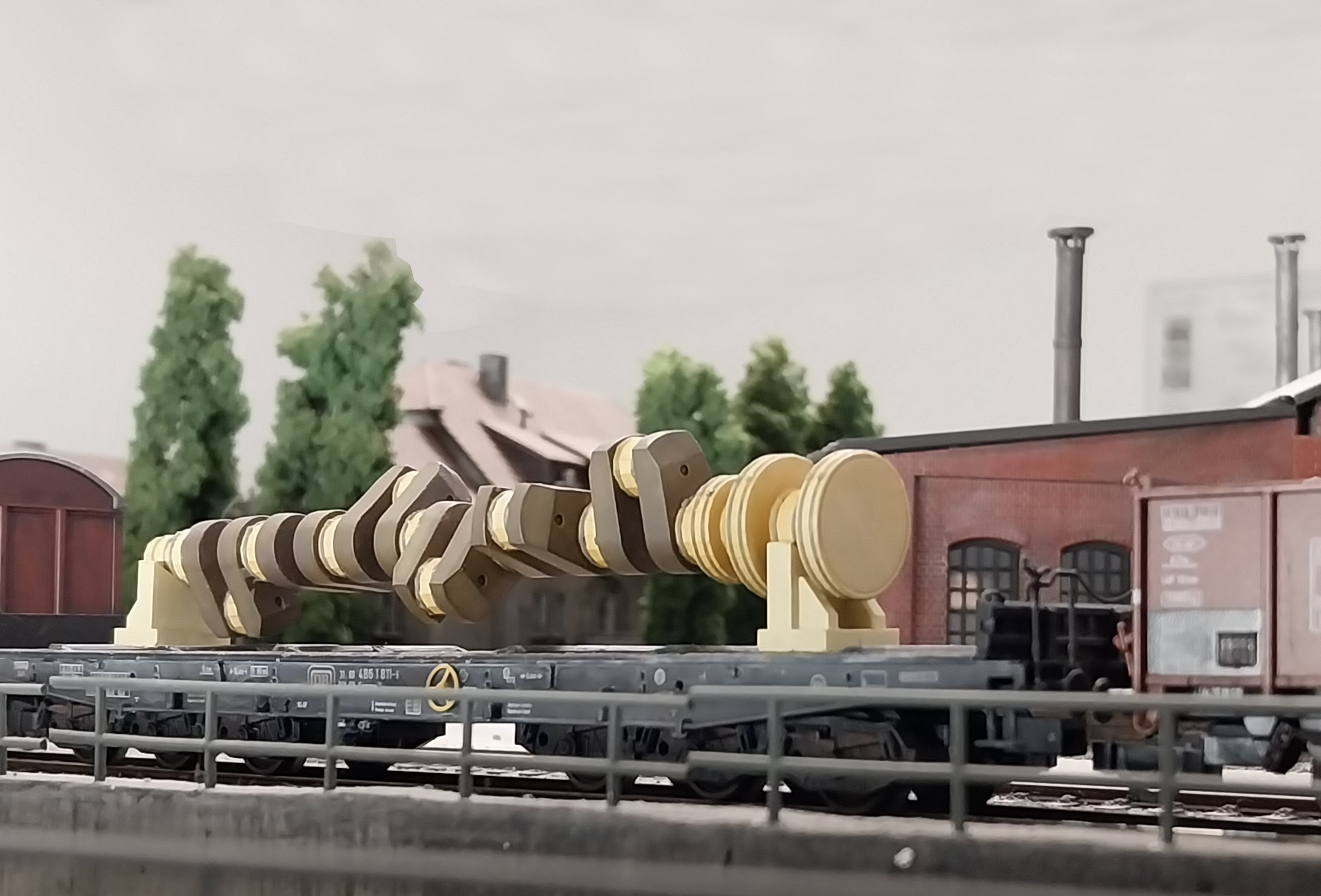 Fangen wir mit der Masse der Welle an: anhand des Volumens und des spezifischen Gewichts mag die Welle runde 35 Tonnen plus Verpackung wiegen. Da wird’s mit 4-achsigen Wagen schon eng. Also mussten Schwerlastwagen ran. Das wunderschöne Fleischmannmodell (Tieflader) hatte ein zu kurzes Bett, wie aufwändige Vorversuche ergaben: