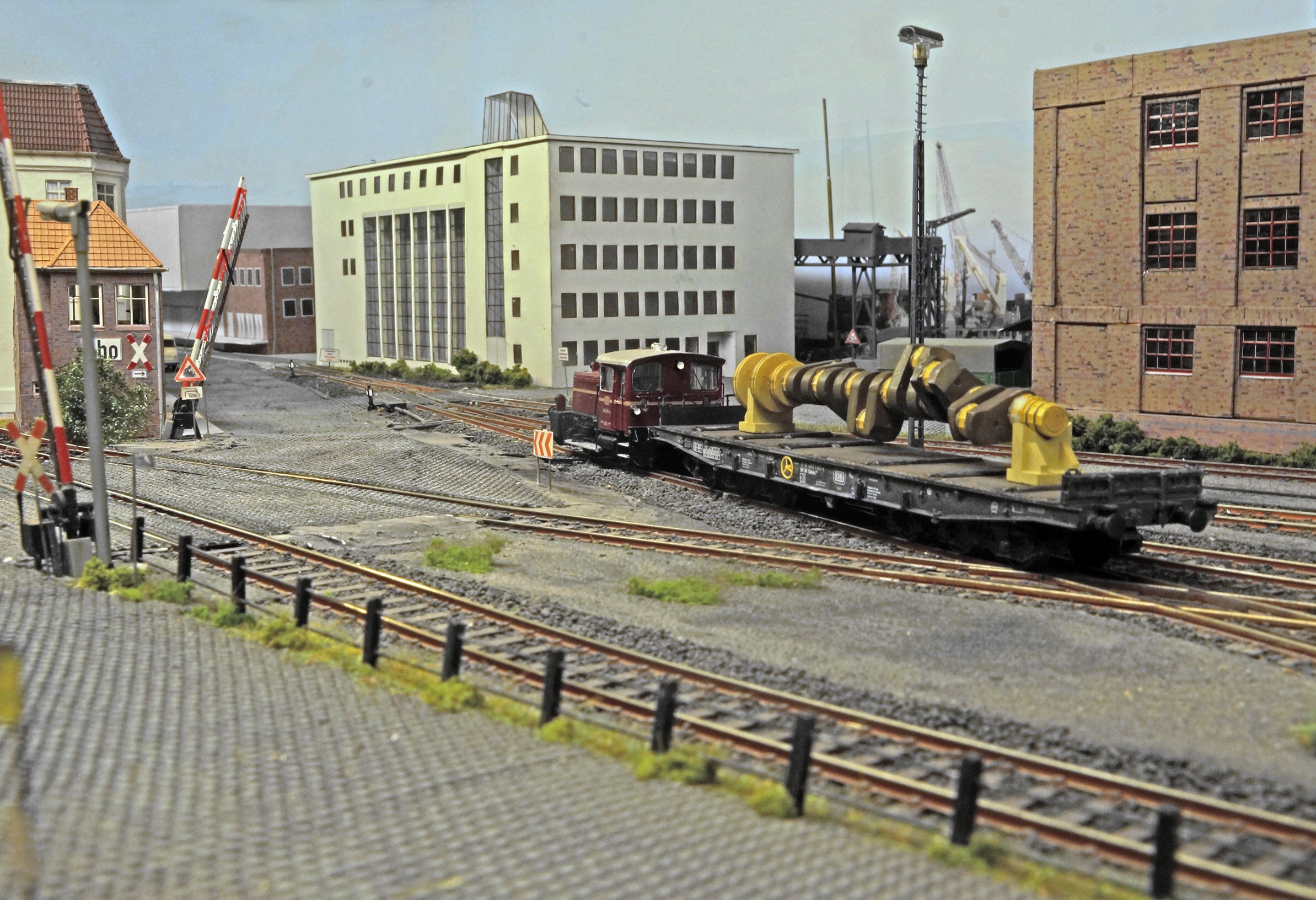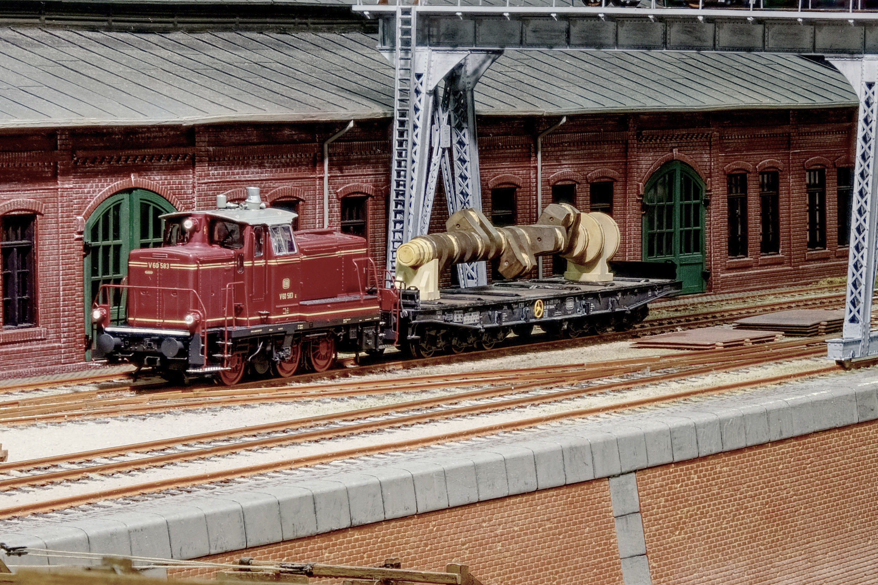 Eine Hagener V60 übernimmt den Transfer der die Fuhre zum Bahnhof Hattingen. Neben unserer Kurbelwelle sehen wir viele andere Fertigprodukte der Hütte. Gewöhnliche Rundstäbe gehören dazu, auch einige Druckbehälter aus dem Schweißbetrieb sind auszumachen.