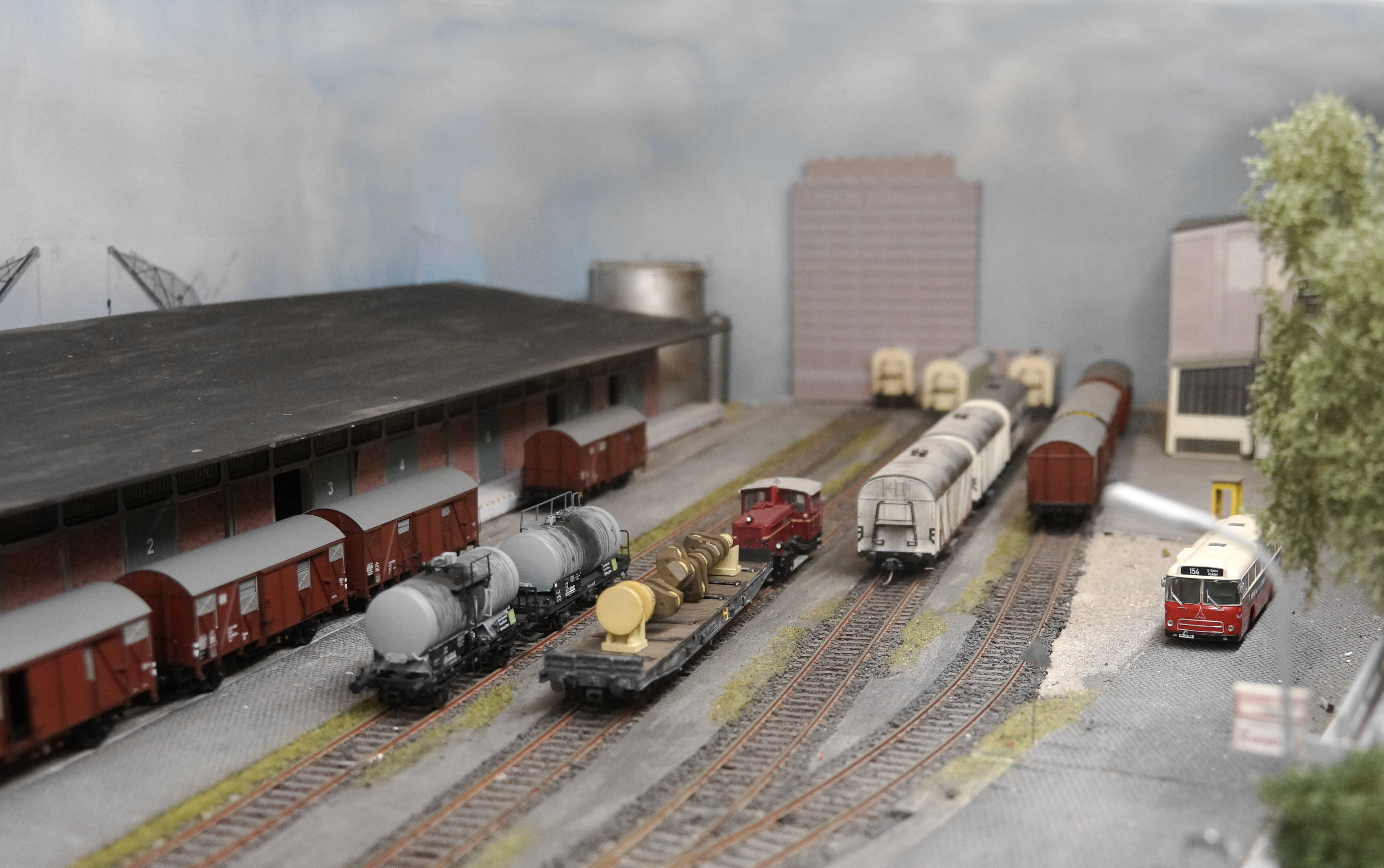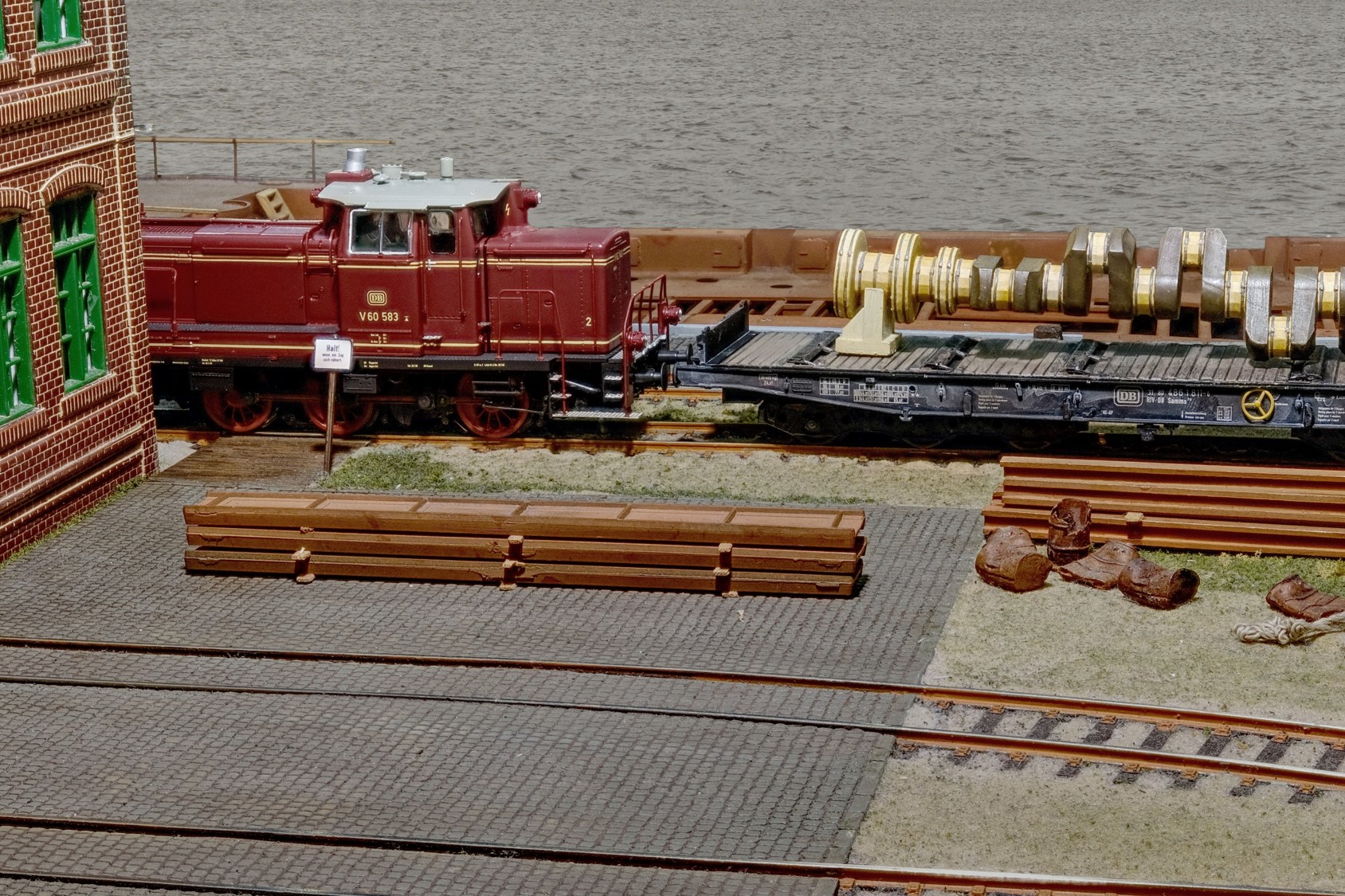 Auf geht’s, die Stangenlok schiebt den Flachwagen in den Übergabebahnhof zur Bundesbahn: