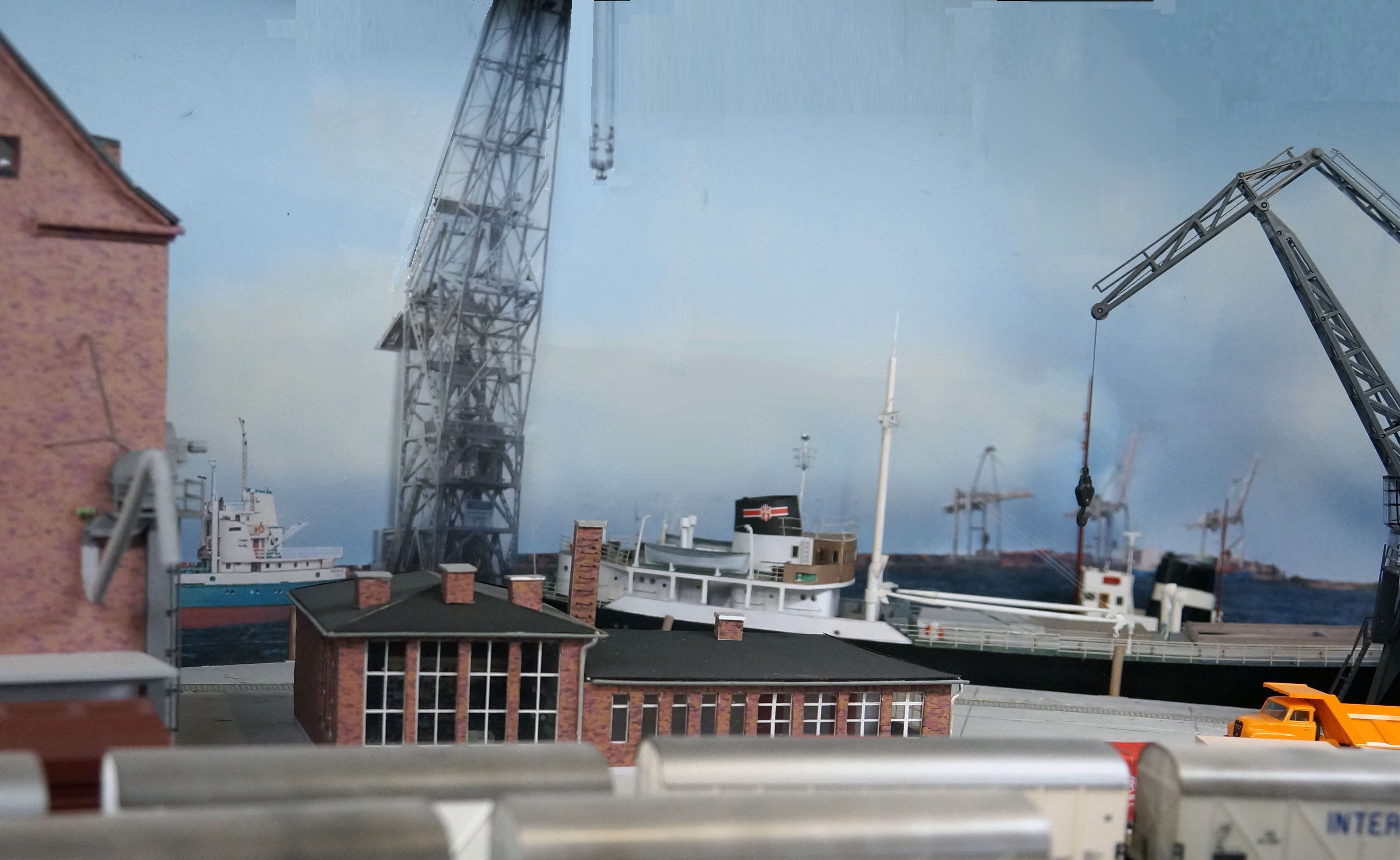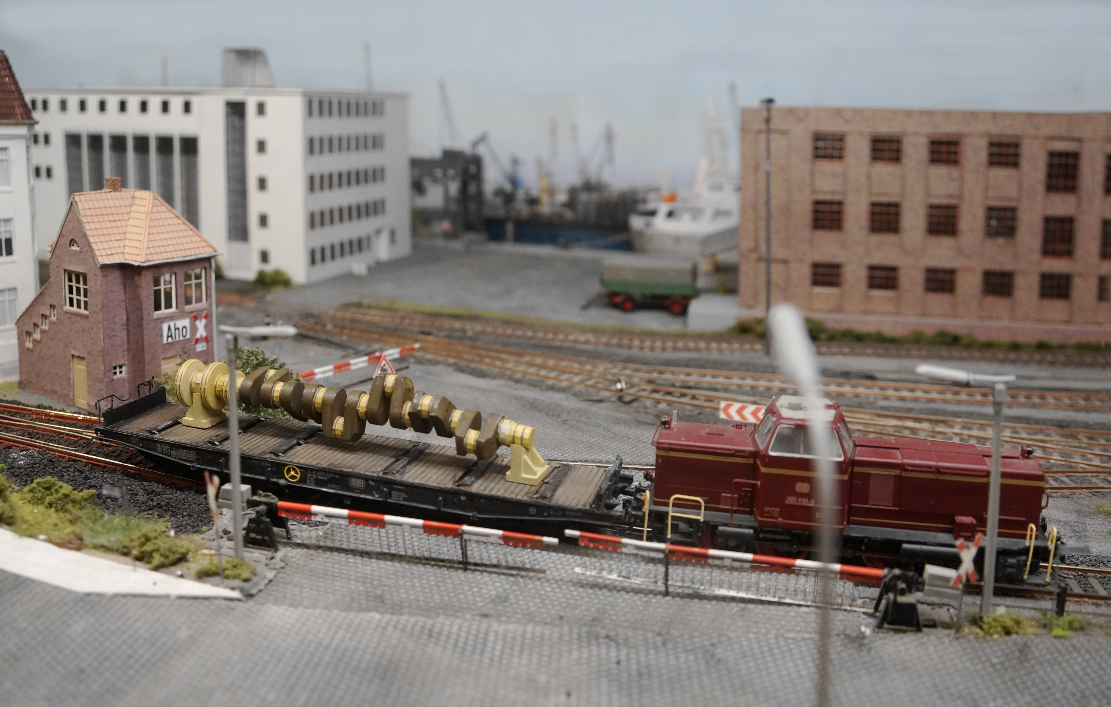 Also haben HaJo Wagner und Peter Lienau die auf der Messe in Friedrichshafen ausgestellte Anlage der IG Kaiserliche Marine genutzt, um die Welle mit dem schicken Hammerkran anzuheben. Das Original stand bis in die 70er Jahre und hatte eine Tragkraft von 150 Tonnen. Das Modell ist voll funktionsfähig und wir hoffen, dass Thorsten uns die Geschichte vom blockierten Drehkranzgetriebe nachsieht :) .