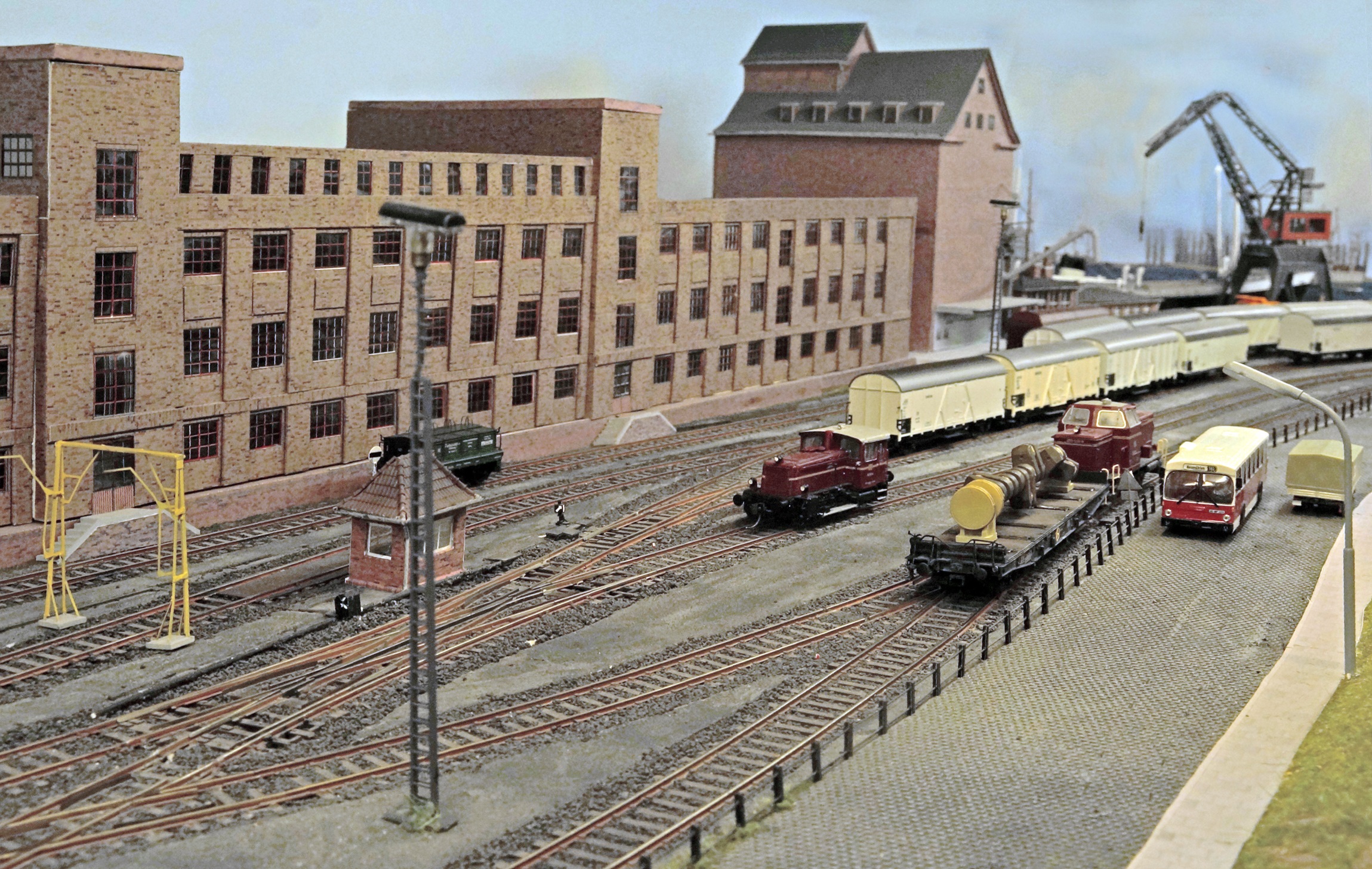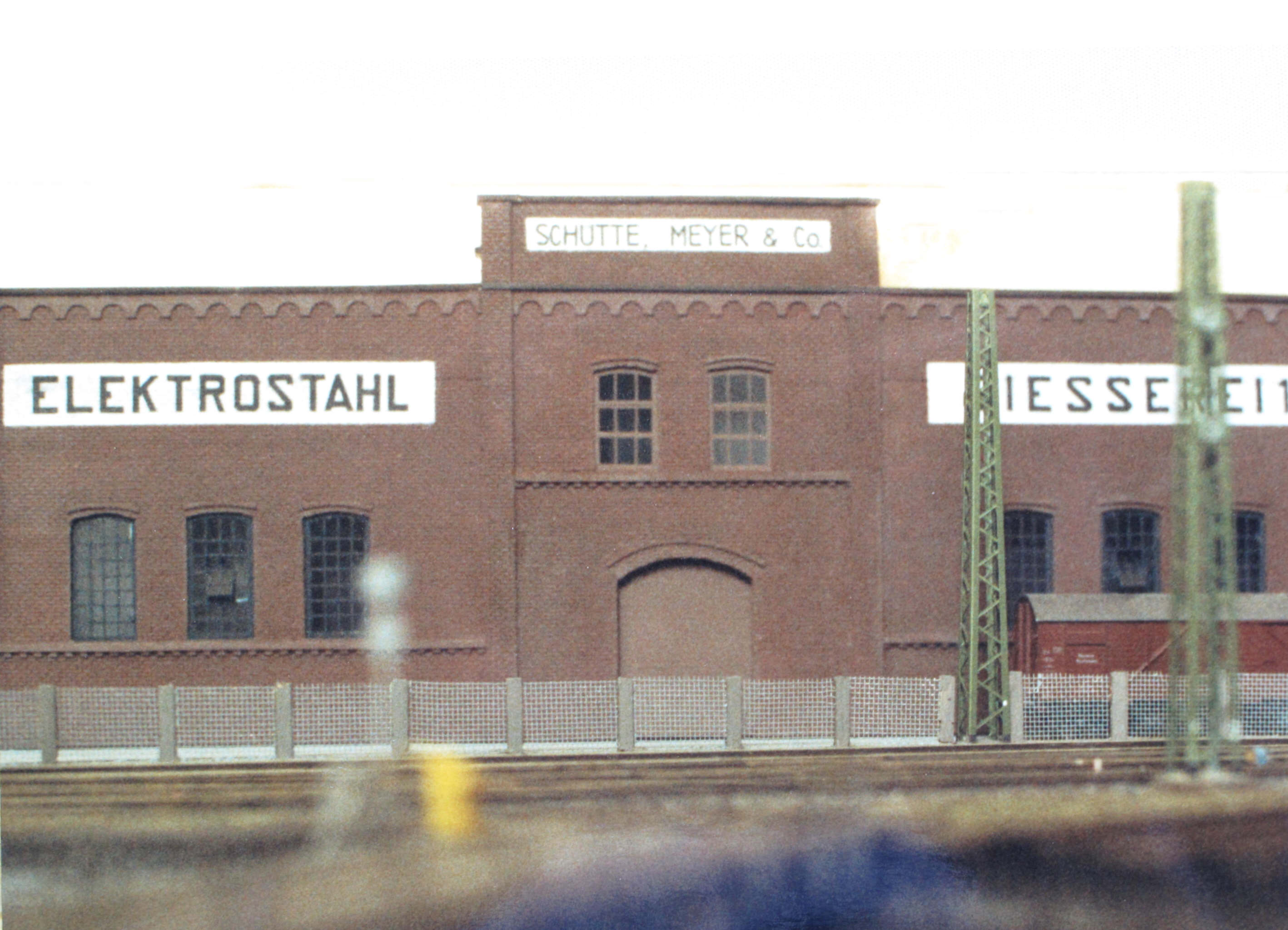 Natürlich hätte man für die Büroszene mit dem Telex auch einfach ein paar Modellmöbel zusammenstellen können. Nun fügte es sich aber wunderbar, dass Andreas Priebe ein 40 Jahre altes Reliefmodell einer Letmather Eisengießerei neu zum Leben erweckt und es im Bahnhof als Modell des Lendringser Eisenwerks verwendet und noch etwas aufhübscht: er erneuert beispielsweise die Fenster und fügt noch kleine Modul-Kästchen für die Innenausstattung hinzu. Hier ein 40 Jahre altes Foto des Ursprungszustands: