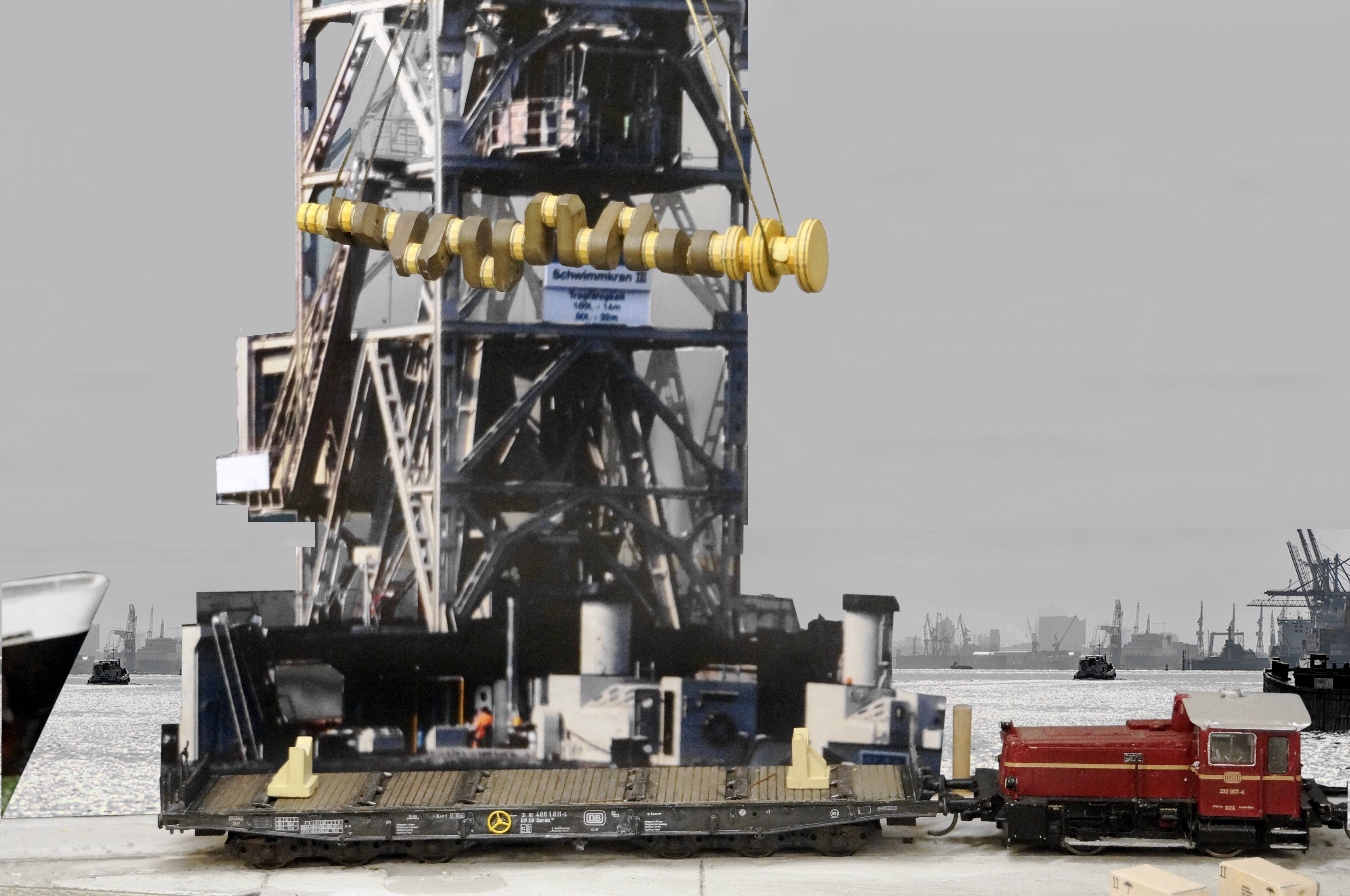 So weit, so gut. Aber was macht man denn nun mit einer hübsch verpackten Kurbelwelle in Hamburg? Ein Tausch in einem Schiff hätte erheblichen Demontageaufwand bedurft. Folglich fielen die vorhandenen Werftmodelle aus. Bei einem Neubau wird der Motor in der Regel als Ganzes eingebaut. Peter hatte „nur“ ein Marineschiff der Bayernklasse, welches bei Vorführungen regelmäßig vom Stapel läuft. Das passt allerdings nicht so ganz in unsere Zeit, die wir gewählt hatten. Nun, wenn man sich über die großen Schiffsdiesel kundig macht, kommt man schnell darauf, dass sie natürlich erst vor Ort in der Werft montiert werden. Insofern war schon mal klar, dass nicht Burmeister&Wain das Ziel war, sondern eine große Werft in ……? Hamburg, na also!