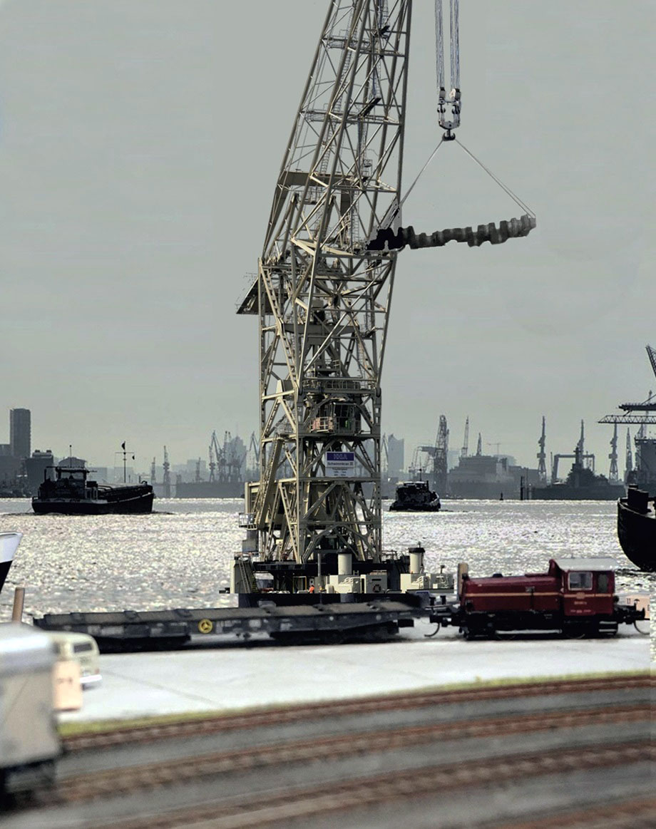 Während der Wagen mit der Kurbelwelle noch rangierte, und den Kaianlagen zugeführt wurde, näherte sich aus Südosten der Schwimmkran HHLA III.