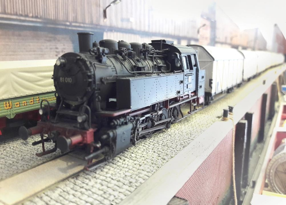 ...während die Leerwagen zum Eislager gedrückt und dort befüllt zu werden. Die 81 hat sich vor den Zug gesetzt, während der Heizer noch anhängt...