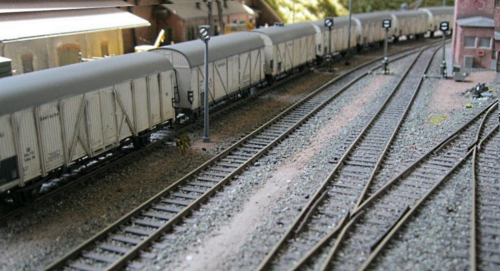 Auf Gleis 4 sehen wir den Zug bei seinem ersten Zwischenhalt. Die Wagenschlange wird gerade abgekuppelt und die Lok wird gleich langsam vorziehen...