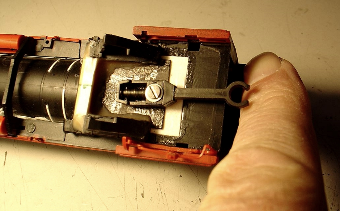 Die Kupplung zwischen Lok und Tender erfolgte durch meine häufig eingebaute “Patent-Schnappkupplung”. Das Foto zeigt die Ausführung hier bei einem anderen Modell.