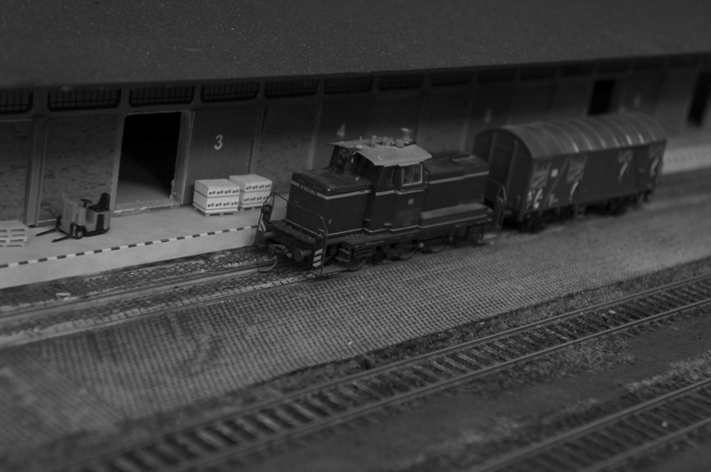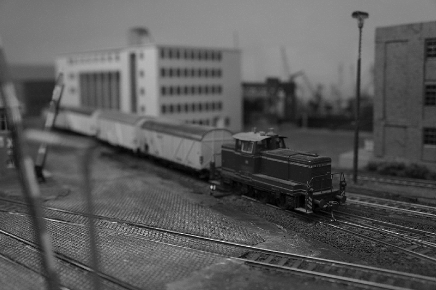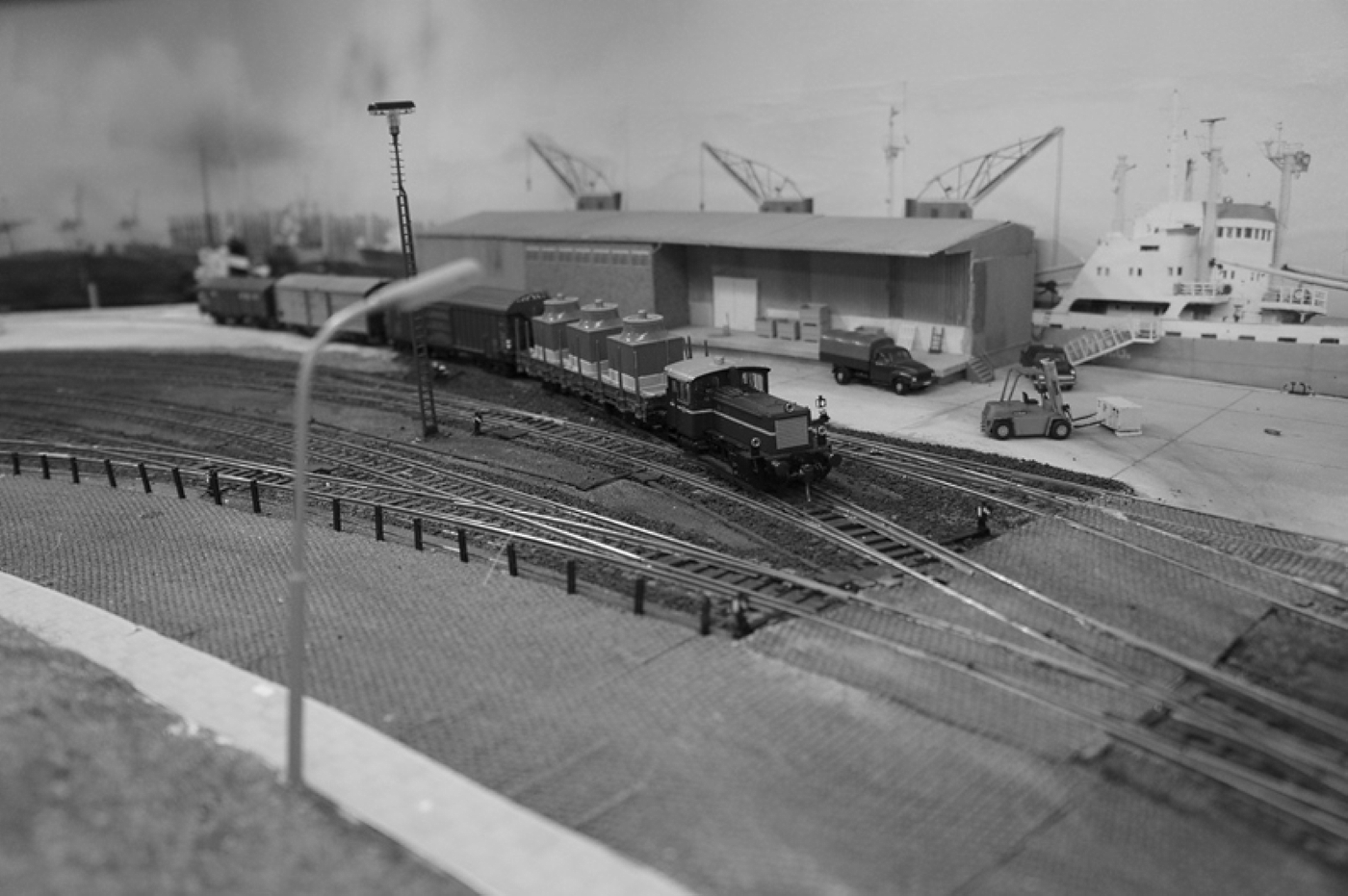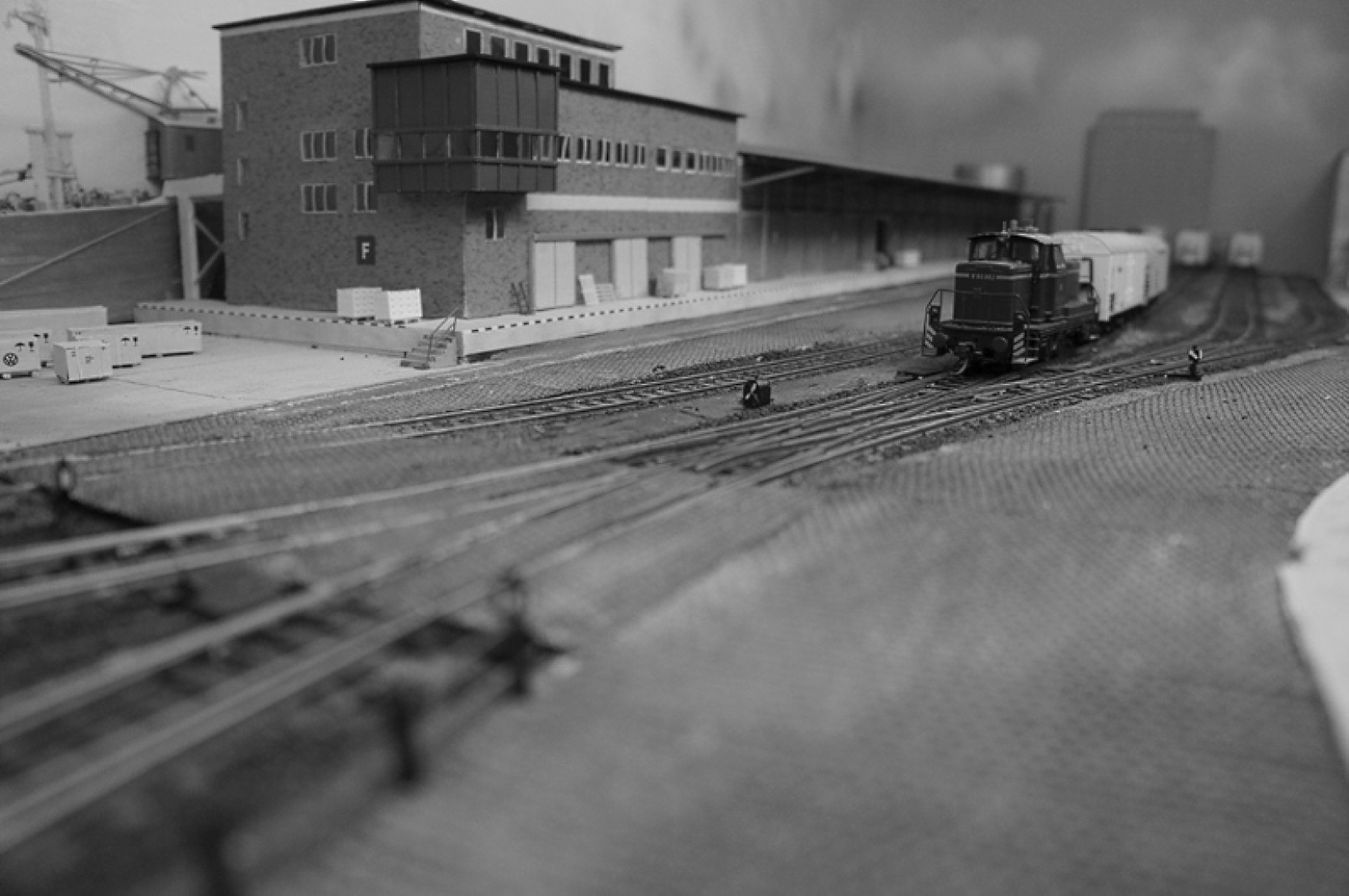 Währenddessen Rangiert eine Köf III des Bw Altona eine Reihe von Wagen, vorbei am Kaispeicher E, an den Kai.