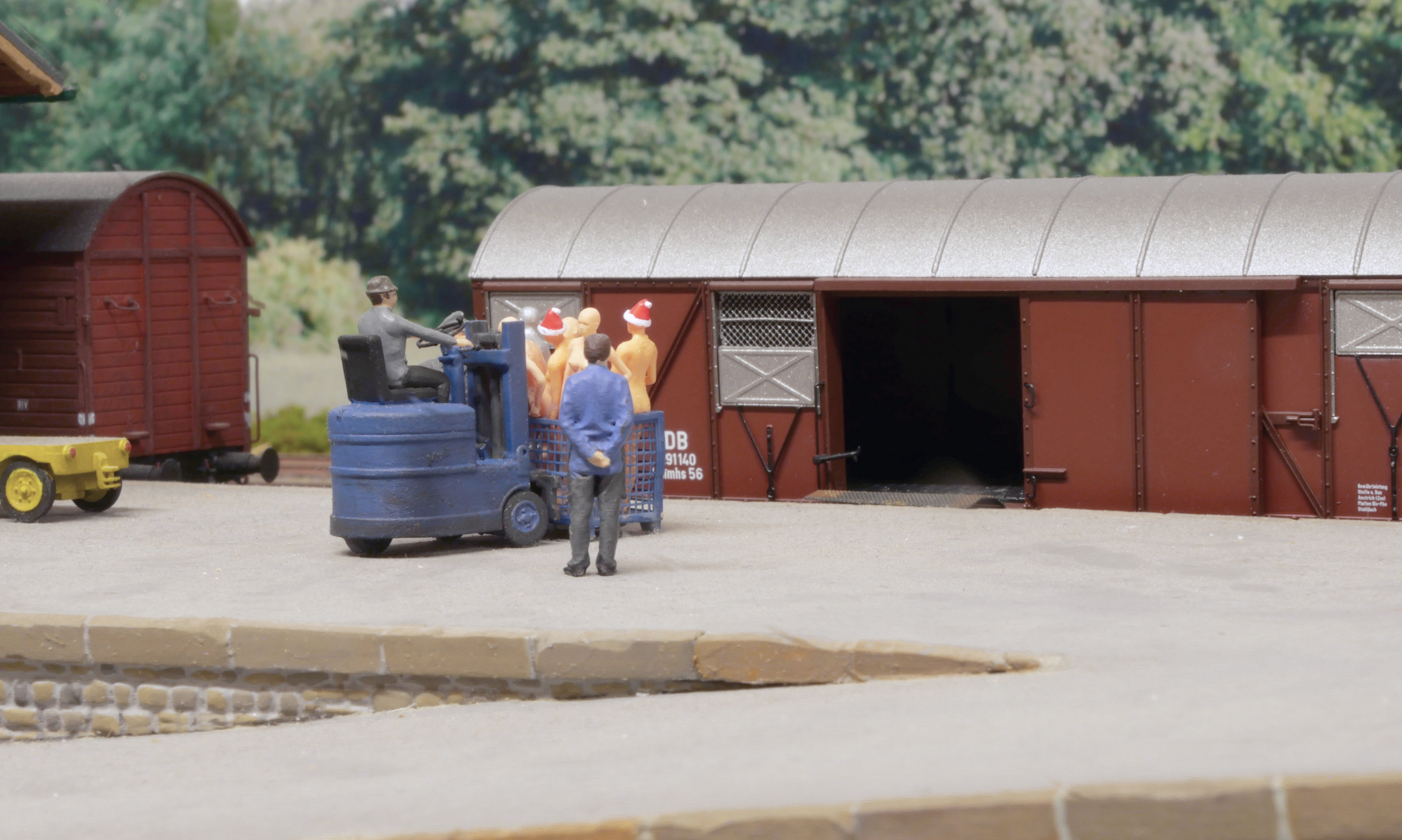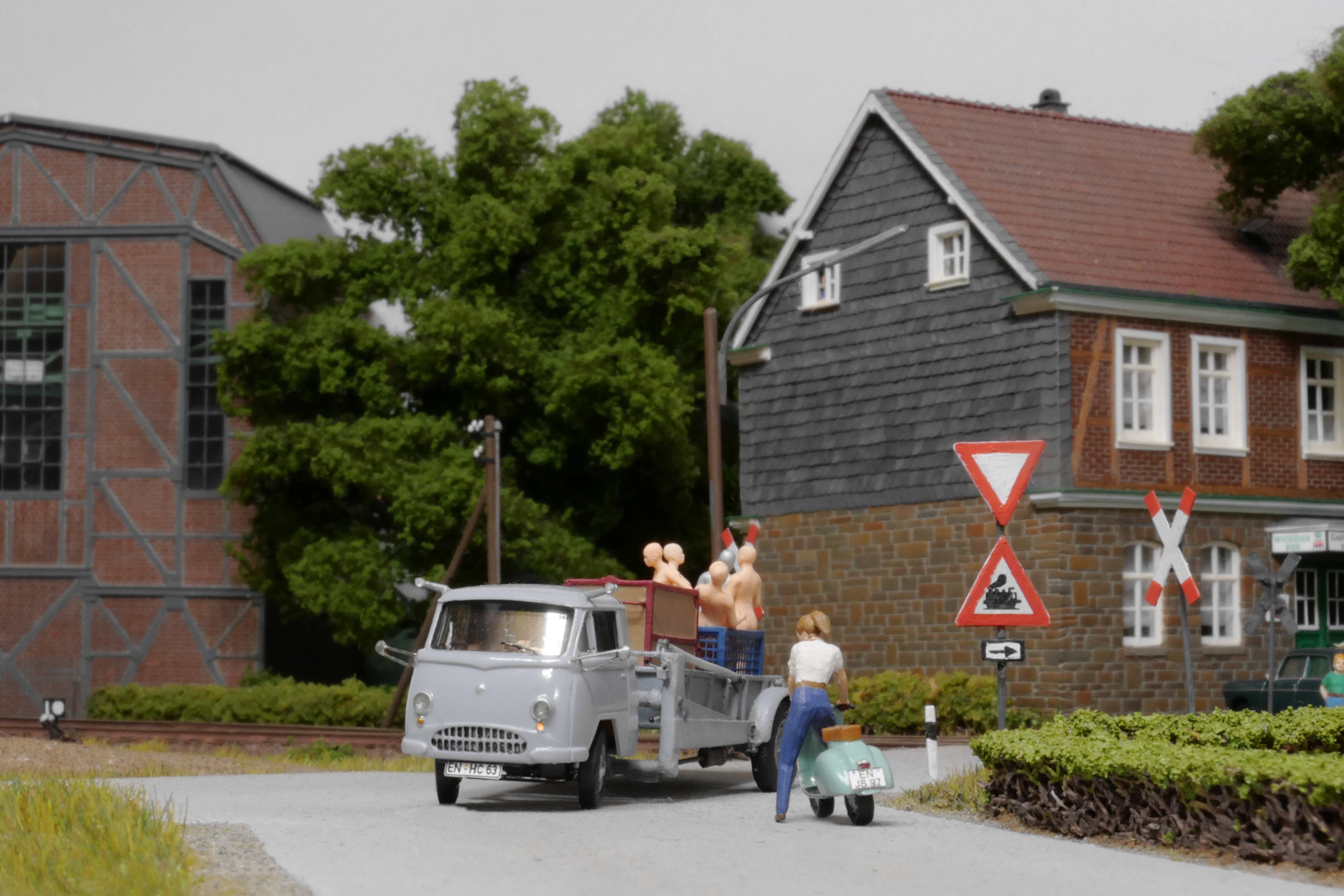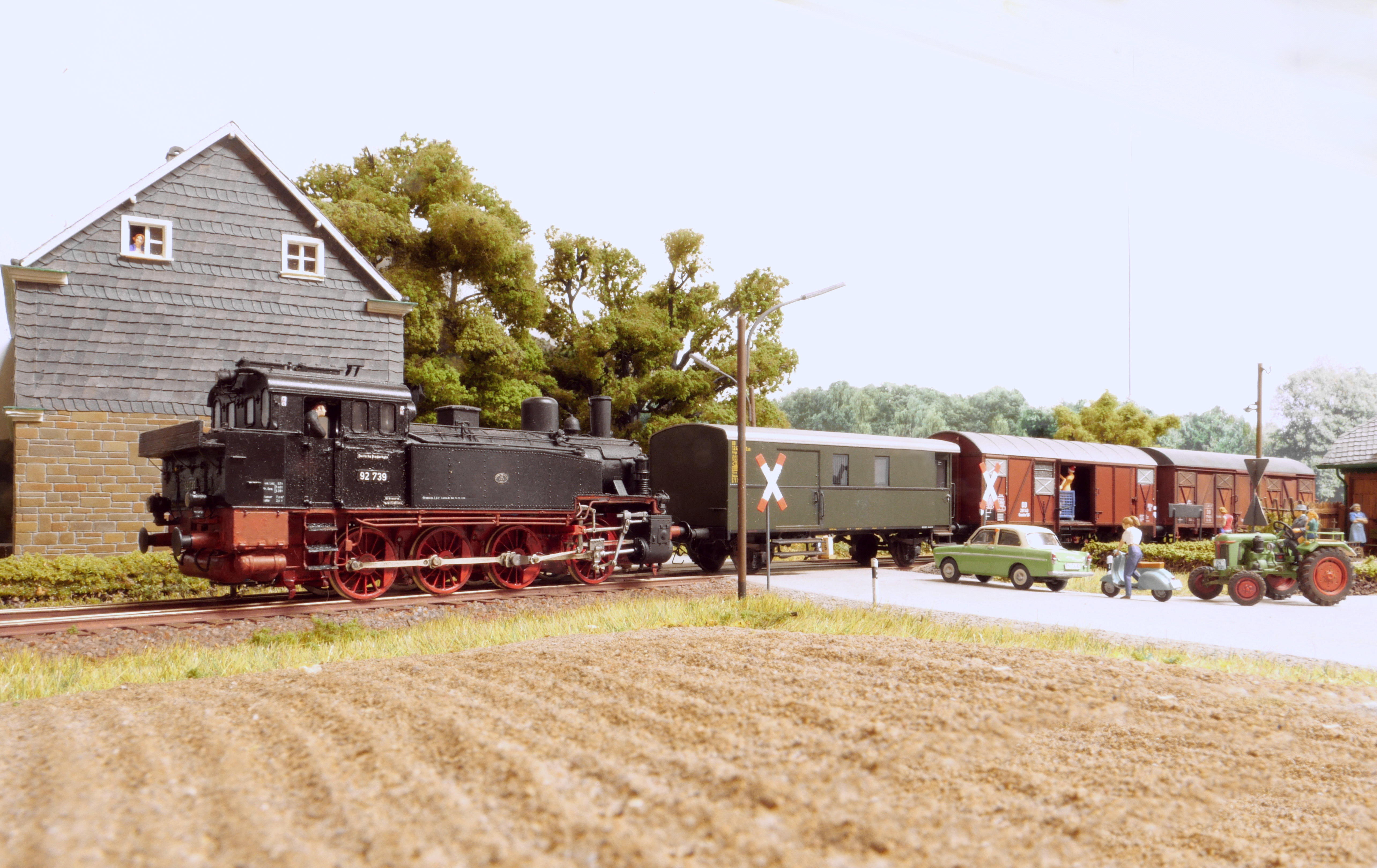 Immerhin, es ist alles verladen, der Ng kann sich auf pünktlich auf die Reise machen. Aber welcher Witzbold hat denn die Tür offen gelassen? Unglaublich, wo doch der Zug in Schrittgeschwindigkeit den unbeschrankten BÜ passiert...