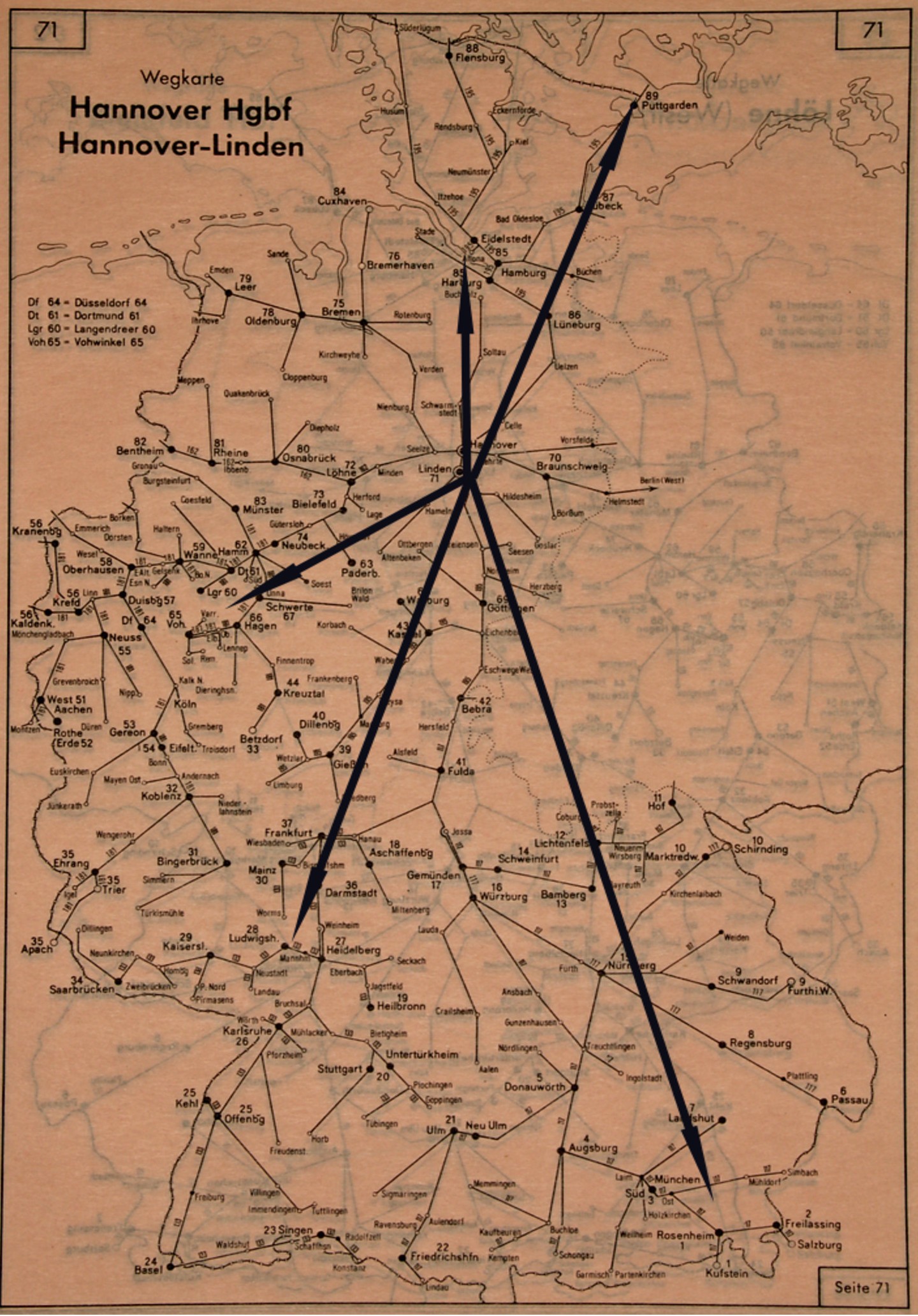Im Rahmen dieser Geschichte werden wir den Überführungsverlauf der Hanomags verfolgen und dokumentieren. Die groben Ziele und Richtungen lassen sich anhand dieser Skizze (Auszug aus dem Güterkursbuch) nachvollziehen: