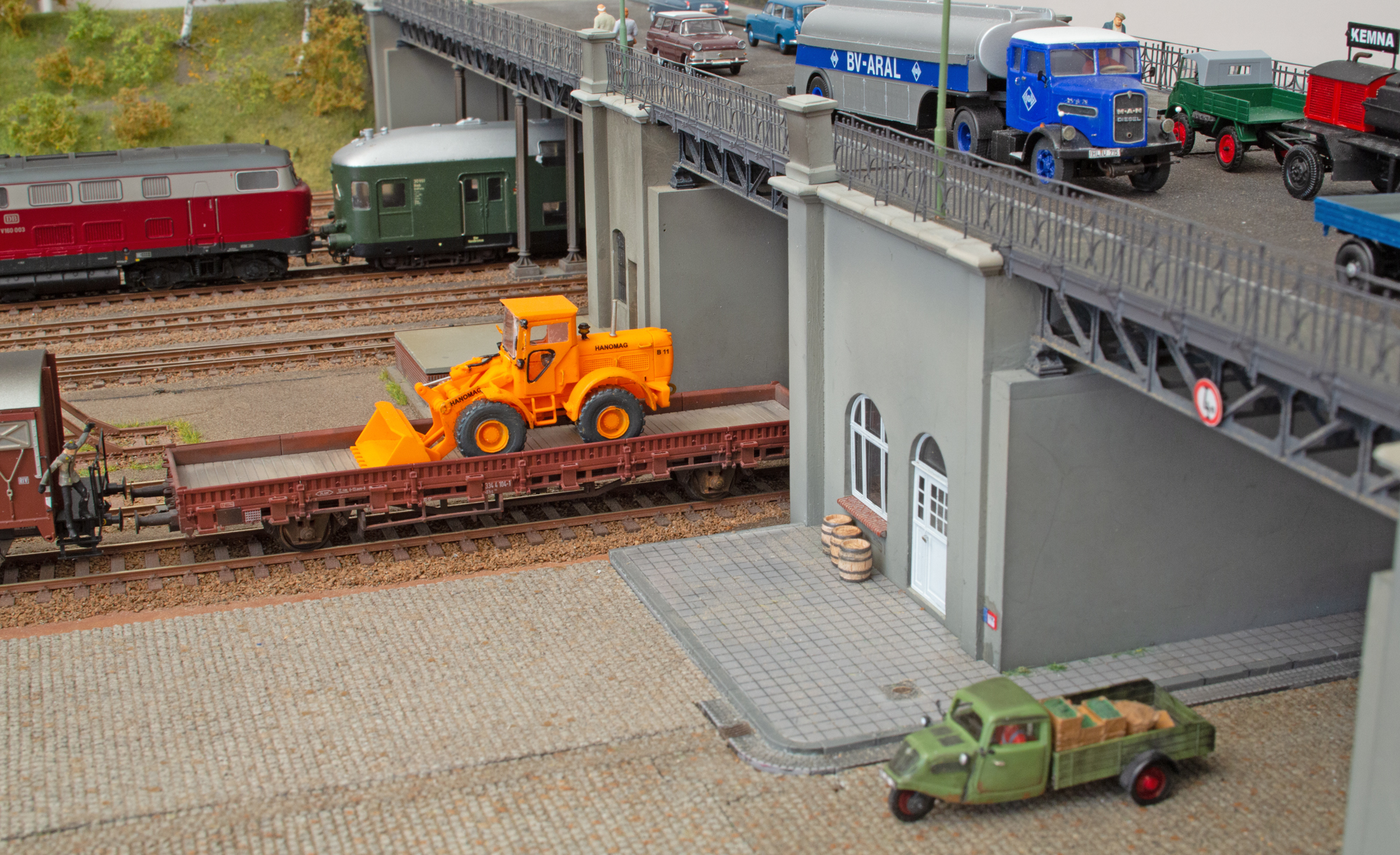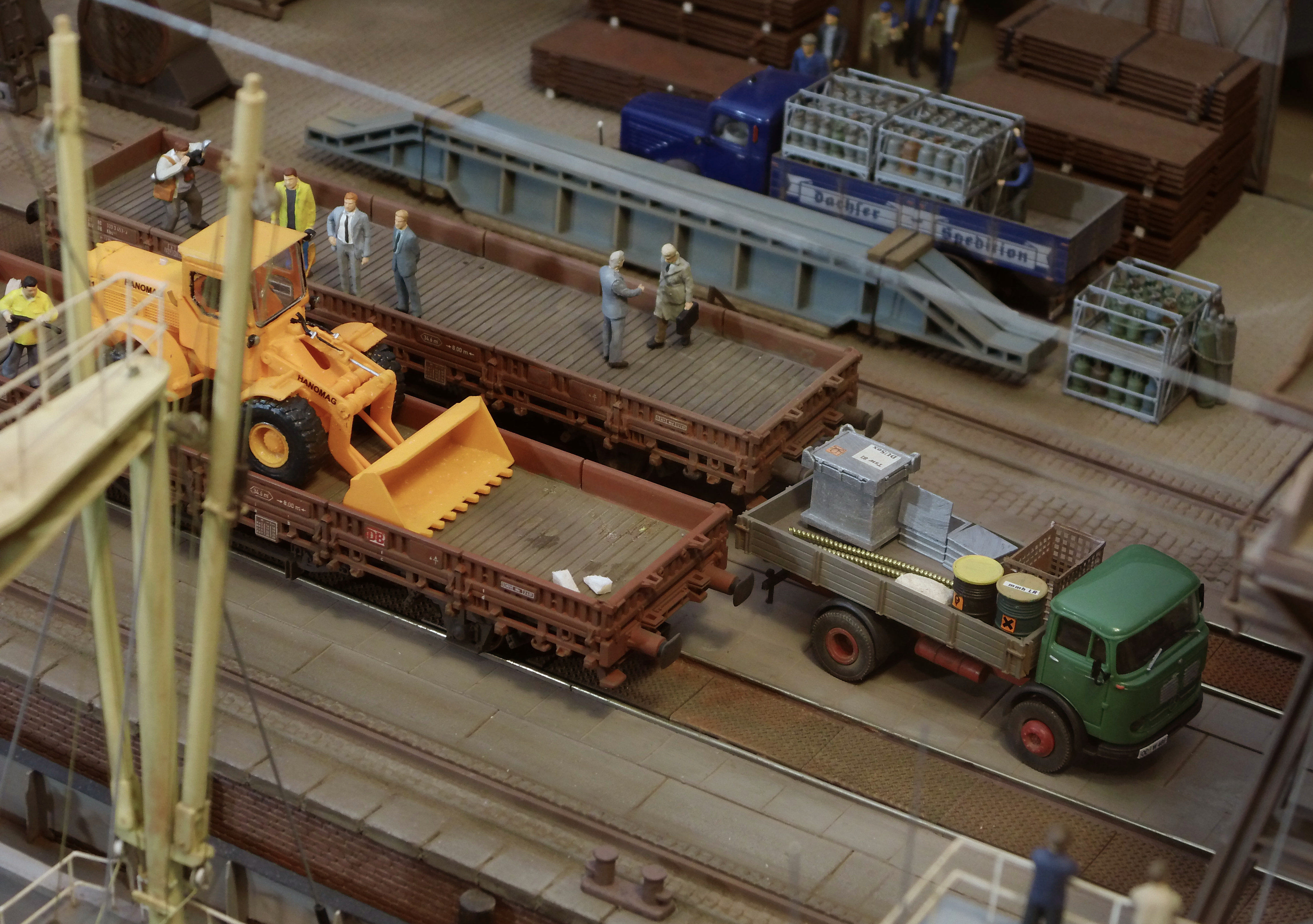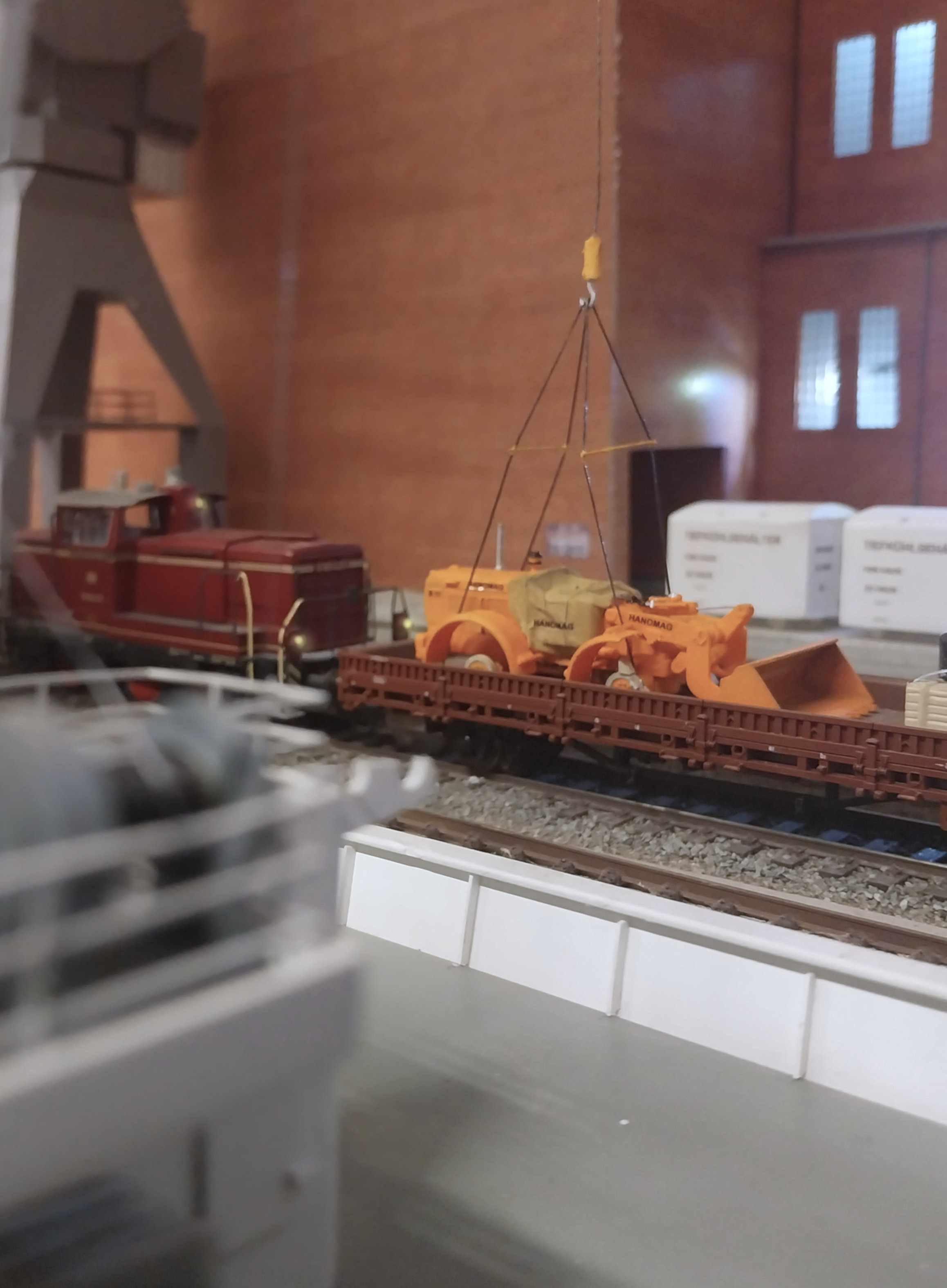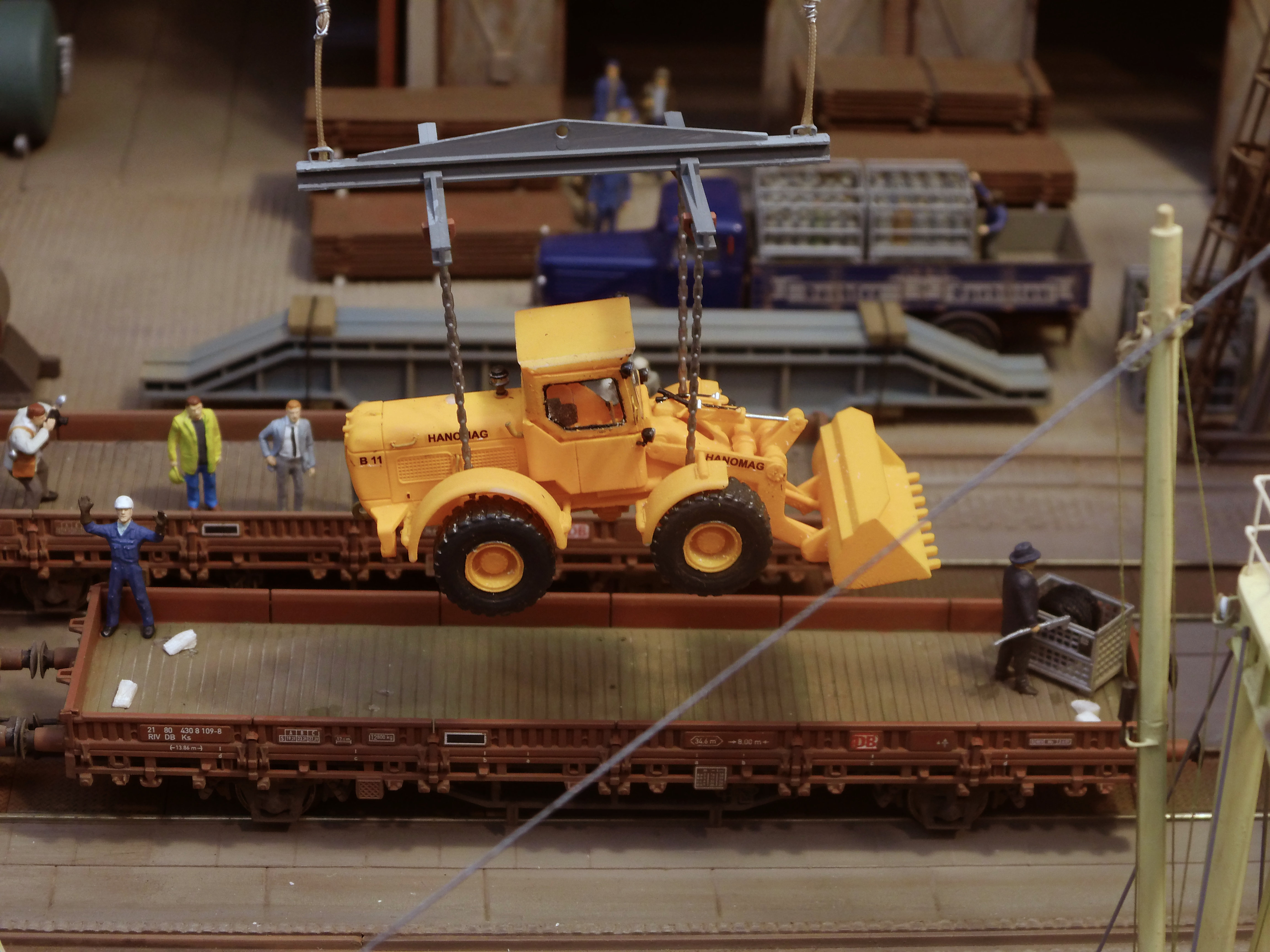 Das Druckerchen produzierte die Einzelteile für die zehn Radlader, das war flott erledigt. Und da ja auch Szenen auf Rampen darzustellen waren, müsste man Flachwagen mit klappbaren Seiten- und Stirnborden gleich mitkonstruieren und bauen. Dafür konnten Hans-Dieter und ich selbst verpflichtet werden. Eine in den Ausmaßen glaubwürdige Halle für die Auslieferszenen war bei Andreas verfügbar, man müsste doch nur ein paar Gleise und ein bisschen Detaillierung drumherum bauen.