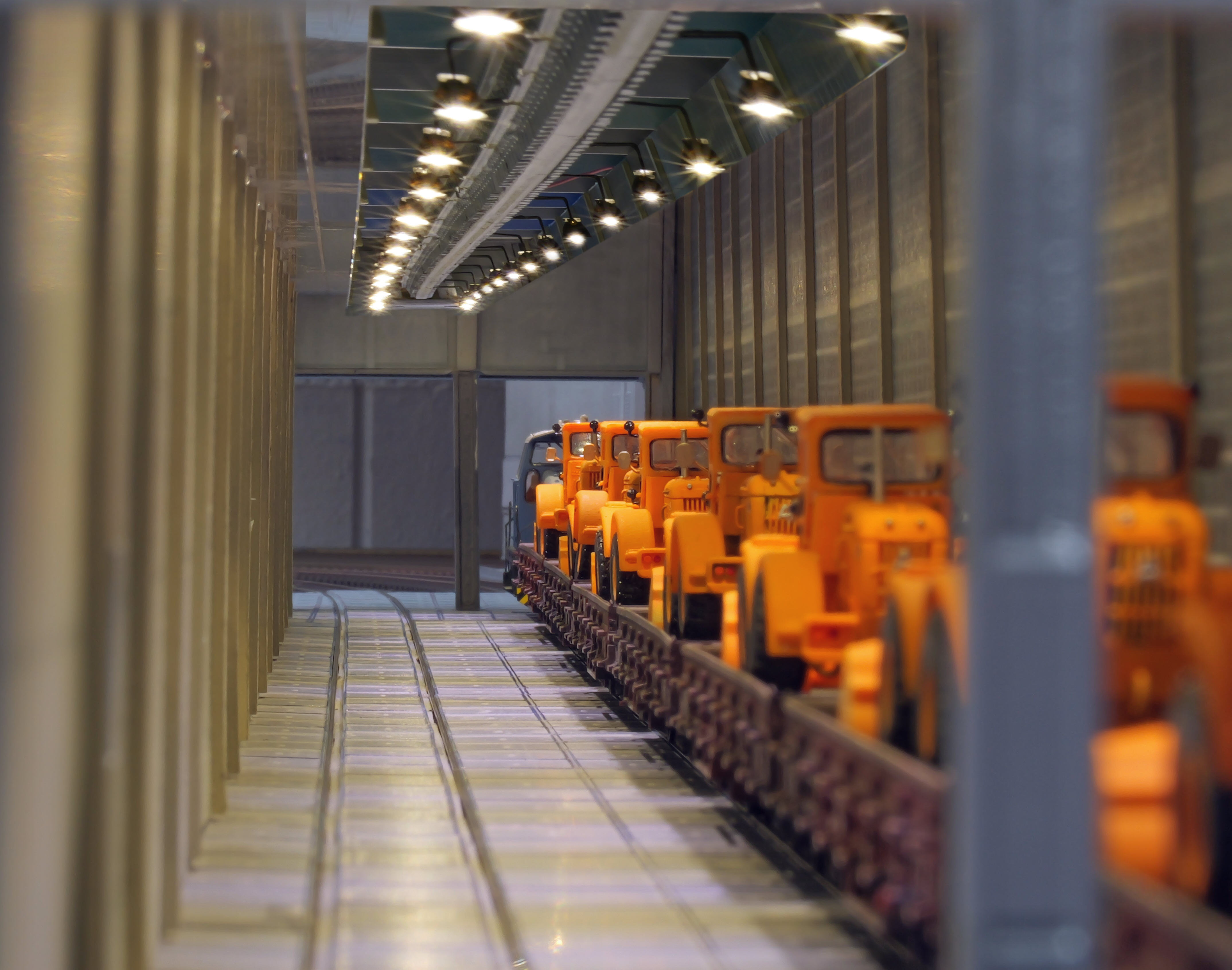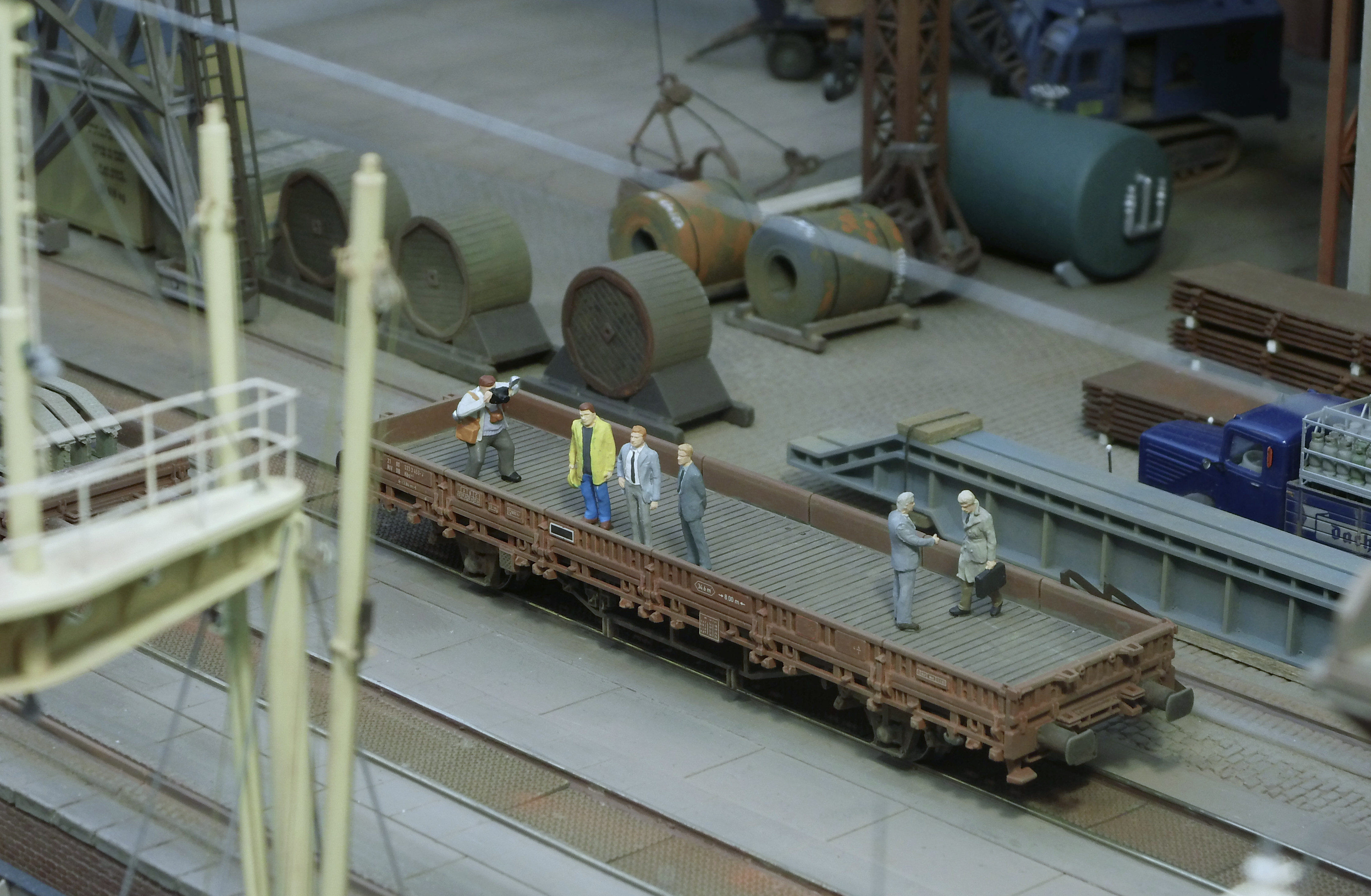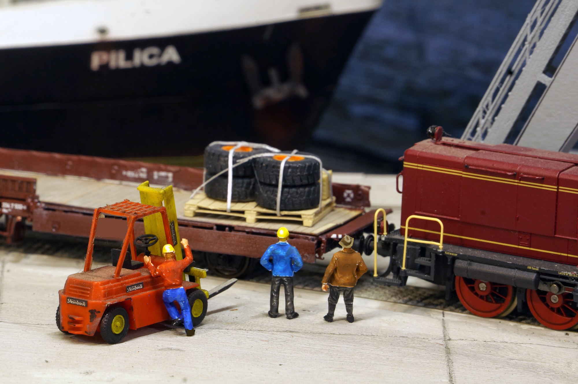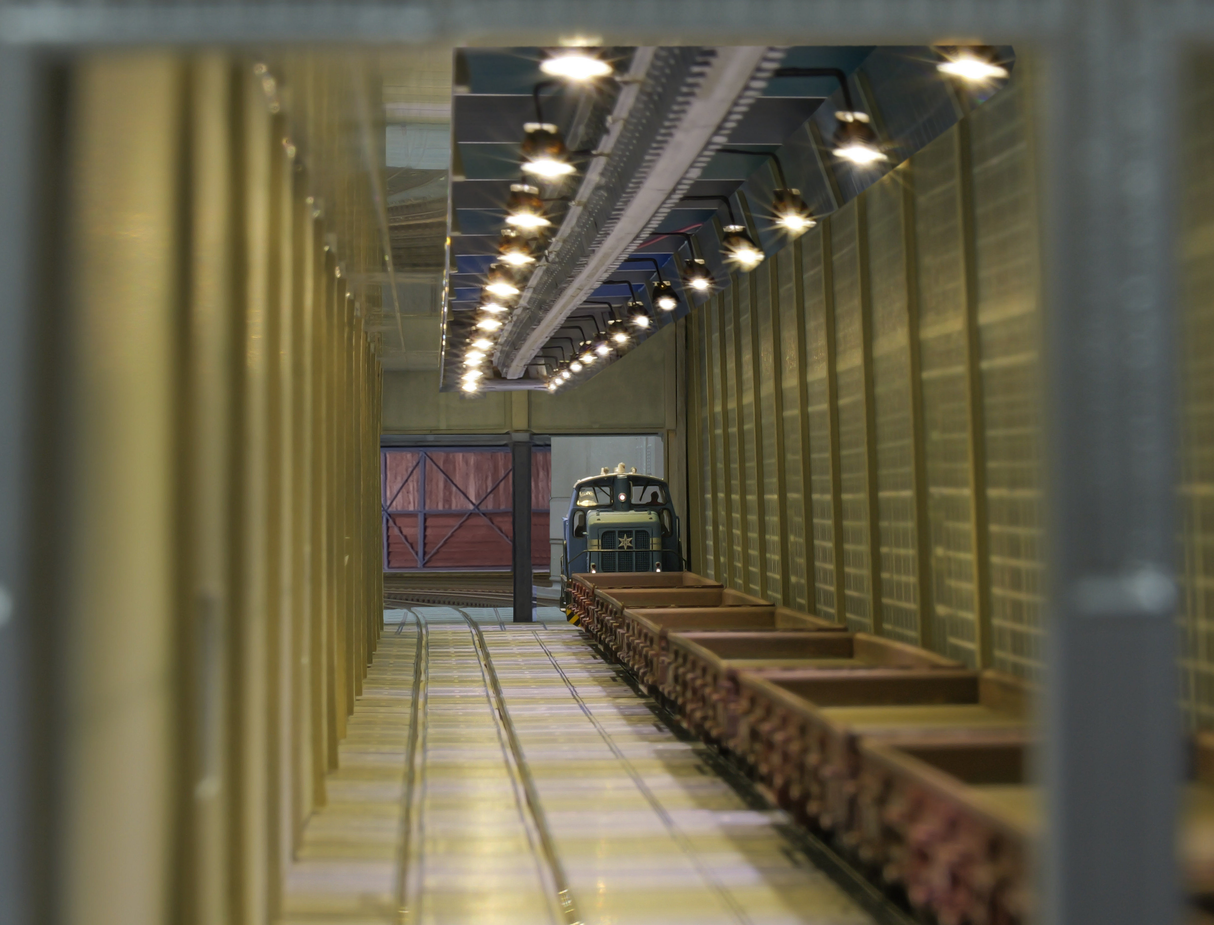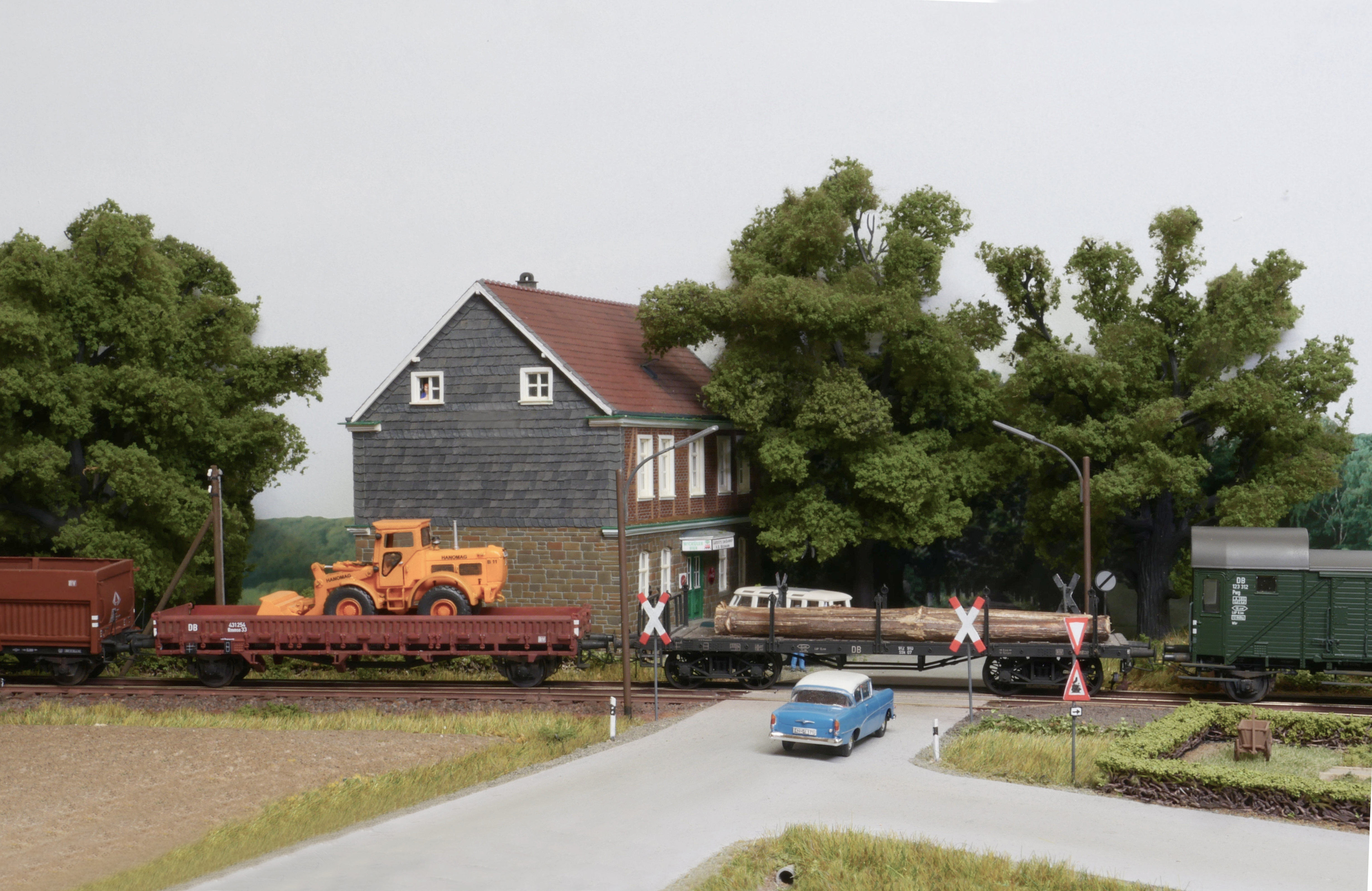 Das Druckerchen produzierte die Einzelteile für die zehn Radlader, das war flott erledigt. Und da ja auch Szenen auf Rampen darzustellen waren, müsste man Flachwagen mit klappbaren Seiten- und Stirnborden gleich mitkonstruieren und bauen. Dafür konnten Hans-Dieter und ich selbst verpflichtet werden. Eine in den Ausmaßen glaubwürdige Halle für die Auslieferszenen war bei Andreas verfügbar, man müsste doch nur ein paar Gleise und ein bisschen Detaillierung drumherum bauen.