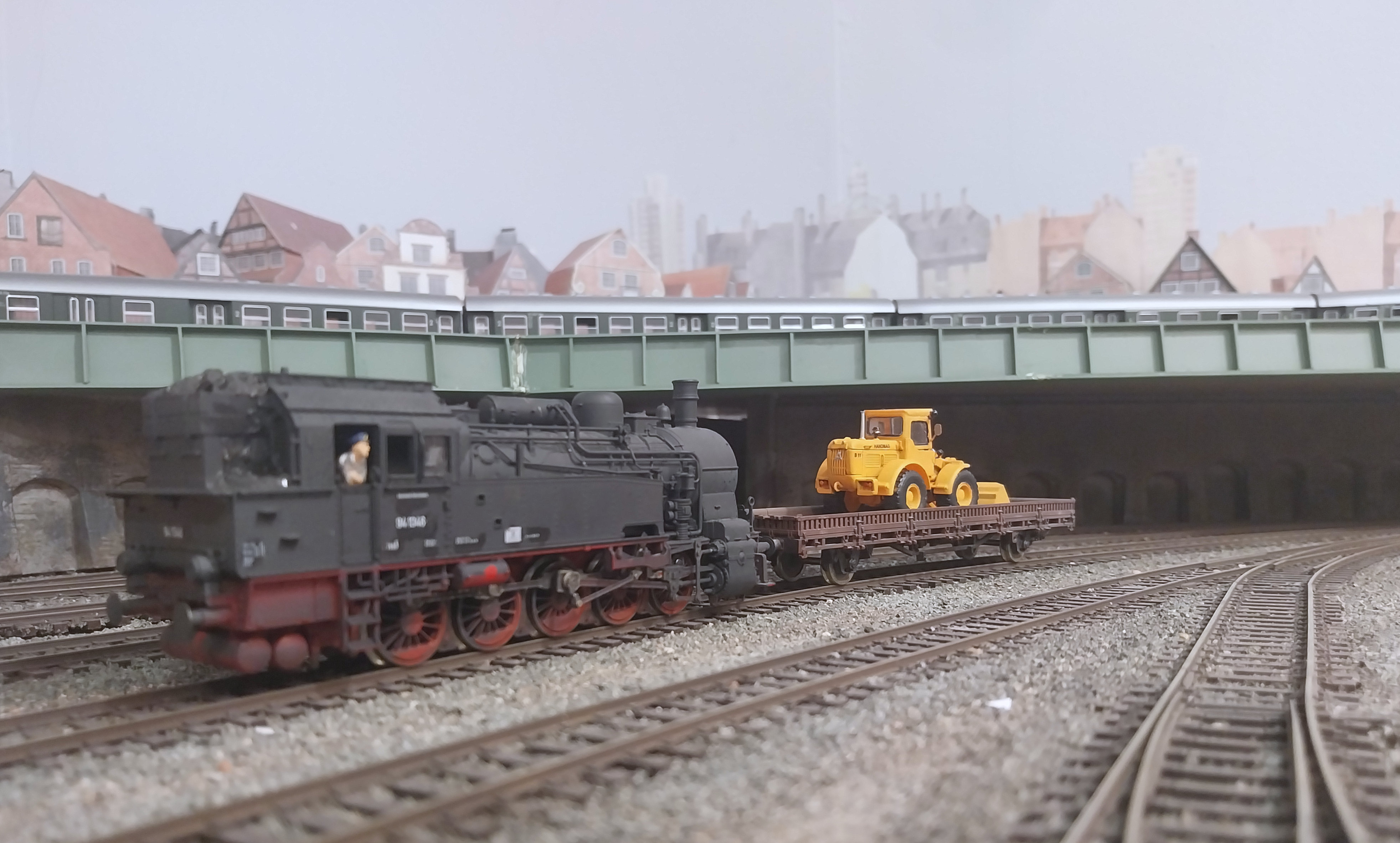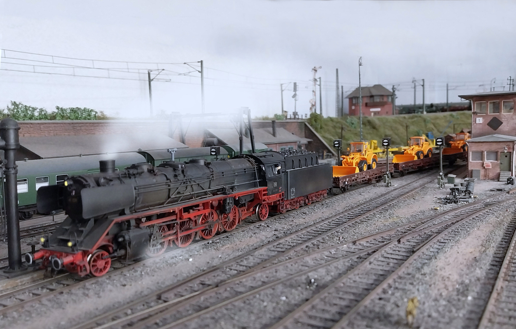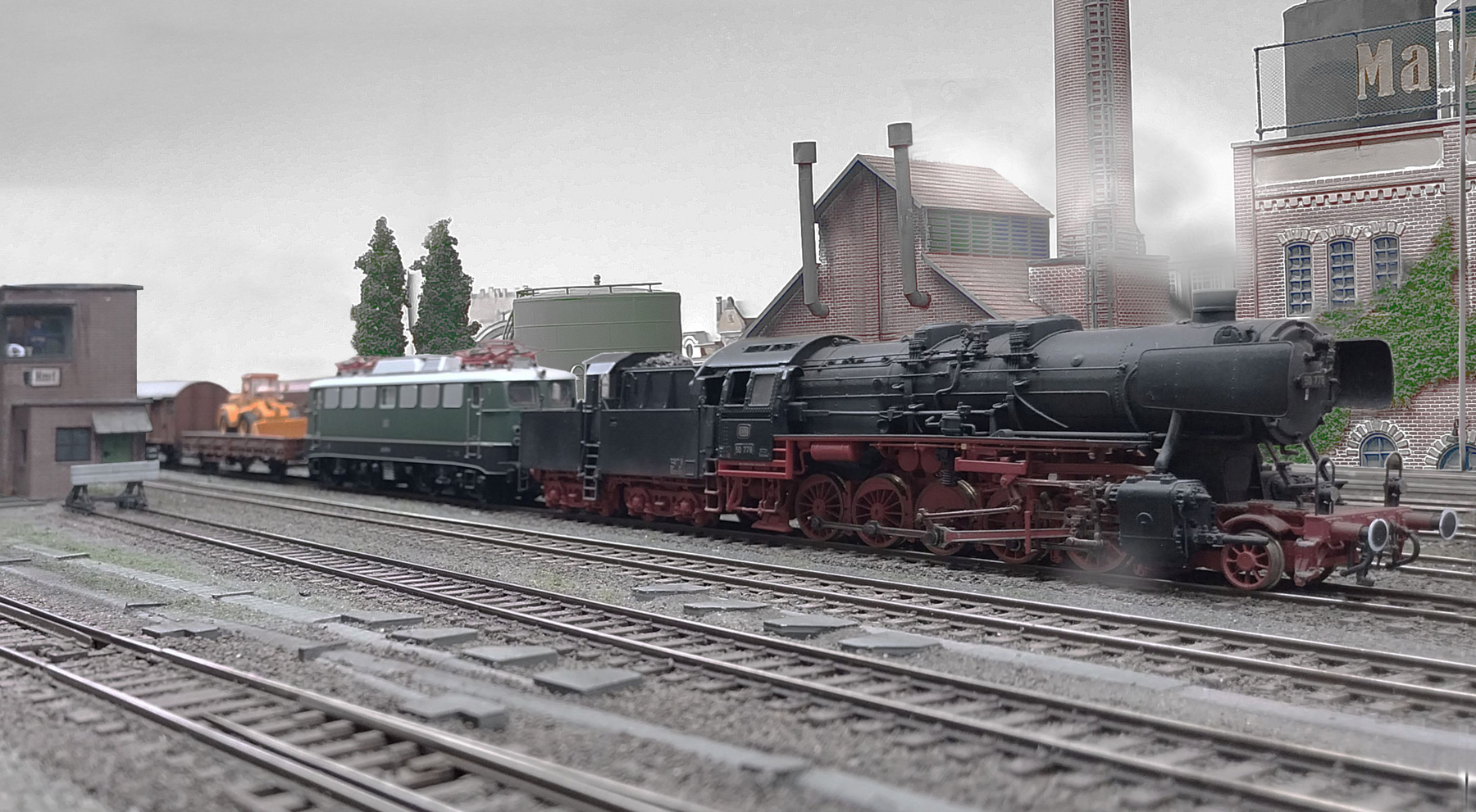Bei der Einfahrt in Murnau wird die Zuglok von einem ortsansässigen Eisenbahnenthusiasten abgelichtet. Im Vordergrund vor dem Lokschuppen wartet schon die Ortslok, eine Freilassinger E60, auf ihre demnächst beginnenden Rangieraufgaben. Auf der Rangierbühne hat sich Rangierer Karl-Heinz entspannt eine Zigarette angezündet und wartet auf die Ankunft des als priorisiert zu behandelnden Flachwagens mit dem B11. Diese Priorisierung hat der Kalksteinbruch-Betreiber schon länger mit dem Bahnhofsvorstand vereinbart. Die Beiden sind Vereinskollegen im lokalen Schützenverein und bei einem Herrengedeckt lässt sich so das ein oder andere besprechen.