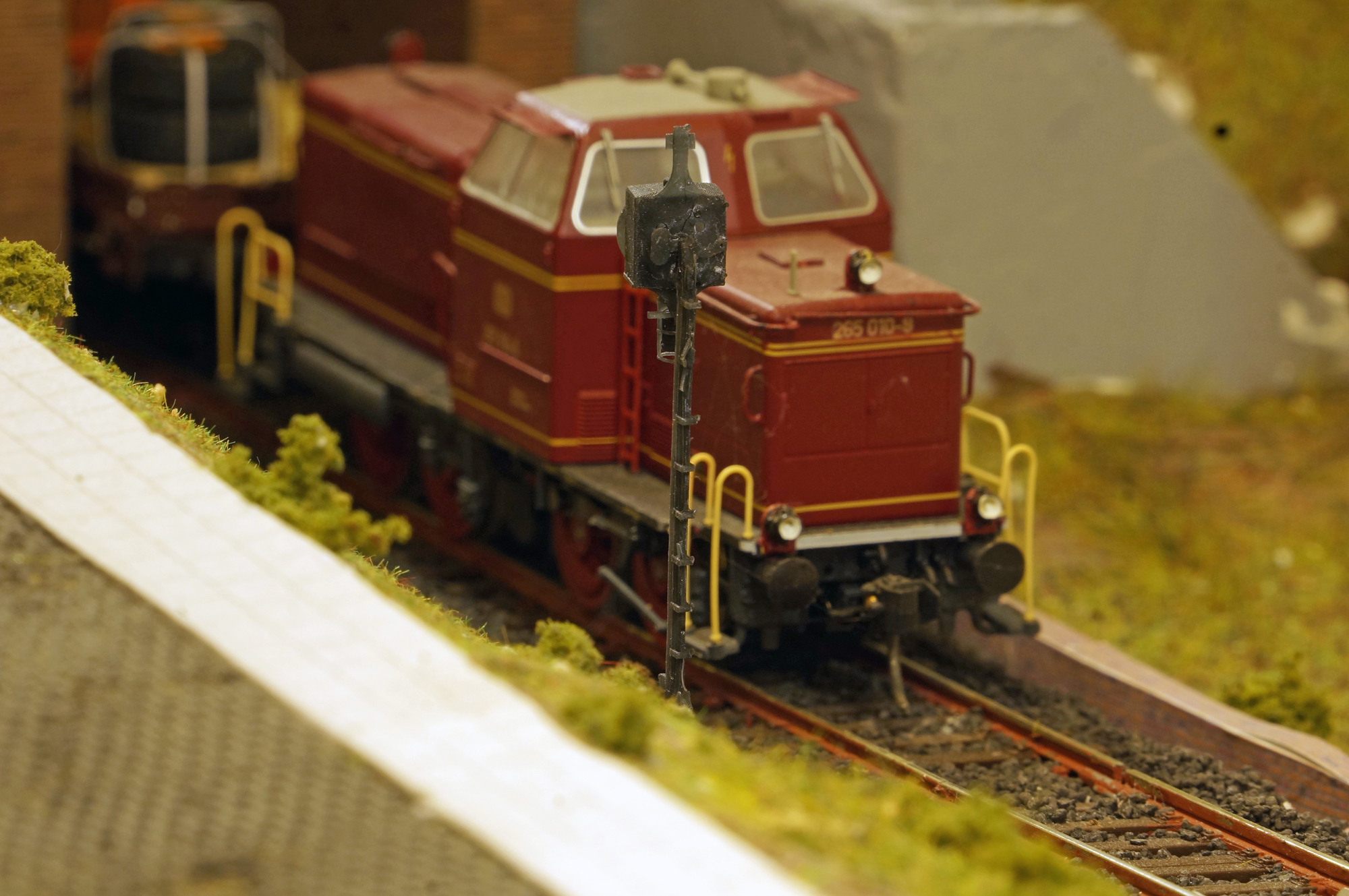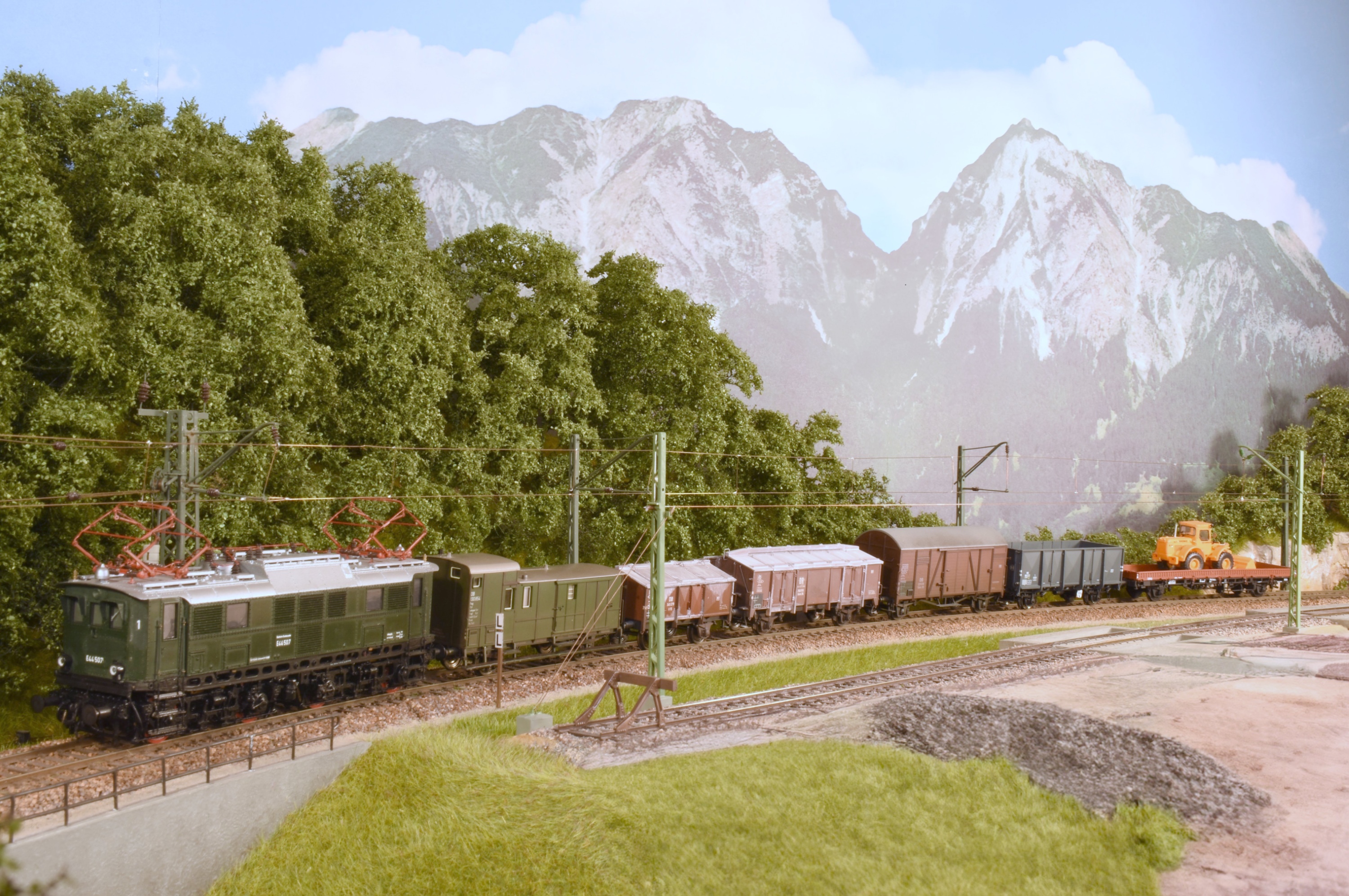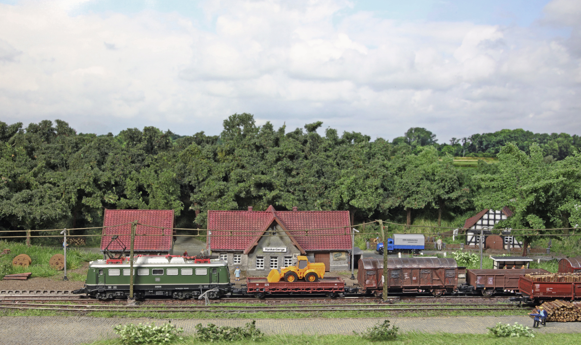 Bei der Einfahrt in Murnau wird die Zuglok von einem ortsansässigen Eisenbahnenthusiasten abgelichtet. Im Vordergrund vor dem Lokschuppen wartet schon die Ortslok, eine Freilassinger E60, auf ihre demnächst beginnenden Rangieraufgaben. Auf der Rangierbühne hat sich Rangierer Karl-Heinz entspannt eine Zigarette angezündet und wartet auf die Ankunft des als priorisiert zu behandelnden Flachwagens mit dem B11. Diese Priorisierung hat der Kalksteinbruch-Betreiber schon länger mit dem Bahnhofsvorstand vereinbart. Die Beiden sind Vereinskollegen im lokalen Schützenverein und bei einem Herrengedeckt lässt sich so das ein oder andere besprechen.