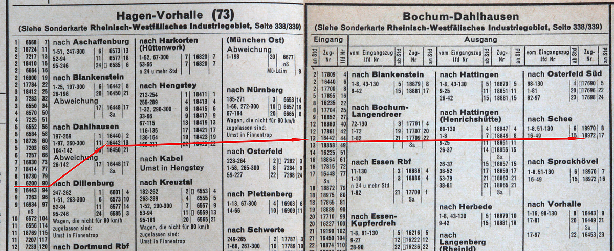Nachdem Brockmöller seine Unterlagen (grafische Bahnhofsfahrordnung und Rangierarbeitsplan) in Augenschein genommen hatte, wurden folgende Abgangszüge für die verschiedenen Wagengruppen festgelegt: