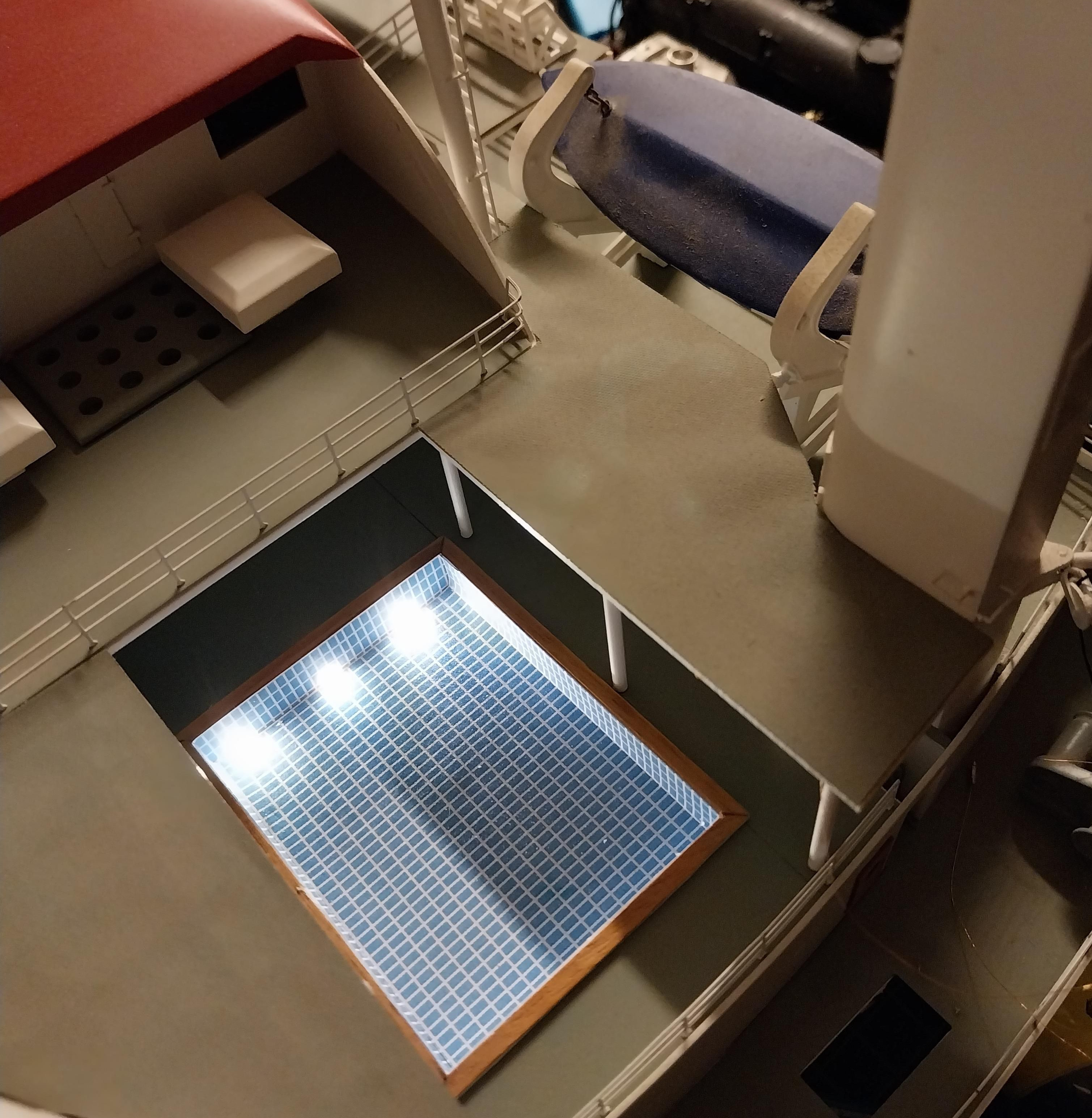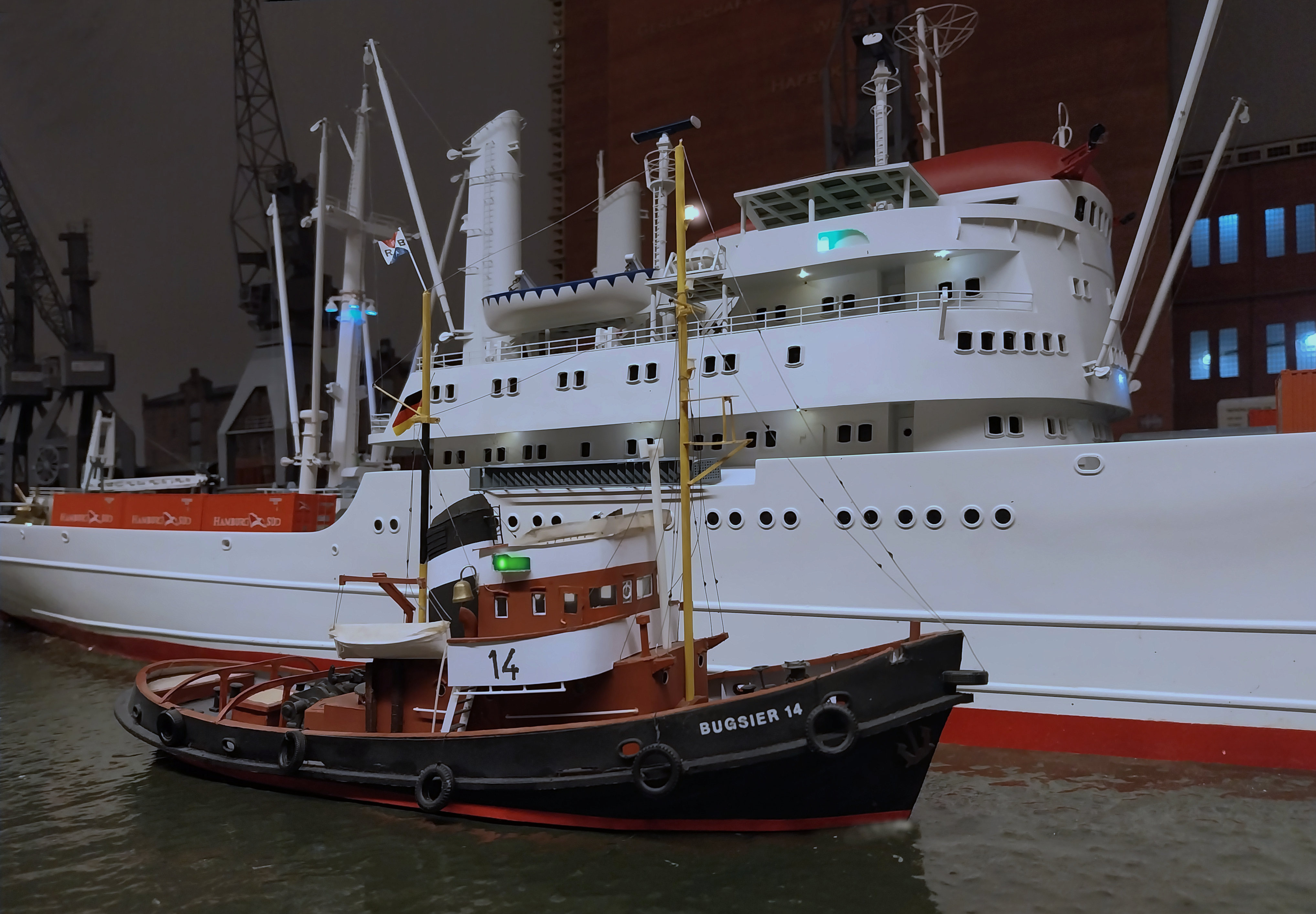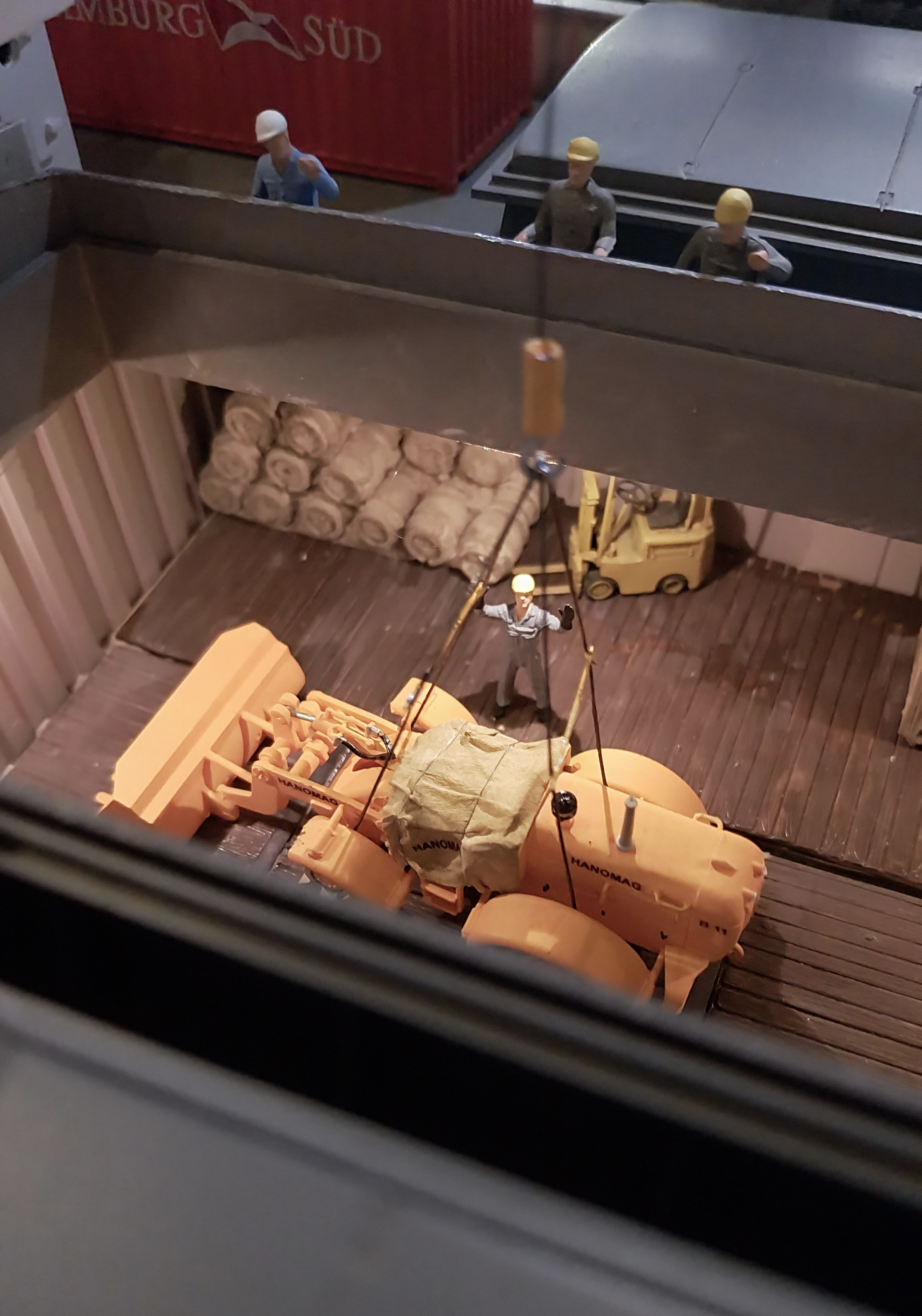 …wer das durch den Lukendeckel ausmessen und einbauen kann, tapeziert auch seinen Hausflur durch den Briefkasten in der Haustür. Natürlich hat unser Quatlitätsbeauftragter MM einer Verladung auf Deck nicht zugestimmt, obwohl die Fixer und Lascher bestellt waren. Also musste in dem Fertigmodell der CAP SAN DIEGO (made bzw. geklebt in China) eine geöffnete Luke her und zwar genau so, wie es 3 Wochen zuvor in der BILD-Zeitung, die von dem Einbringen eines VW-Käfers in das Hamburger Vorbild berichtete, abgebildet war. Abweichungen sind nicht zulässig…..