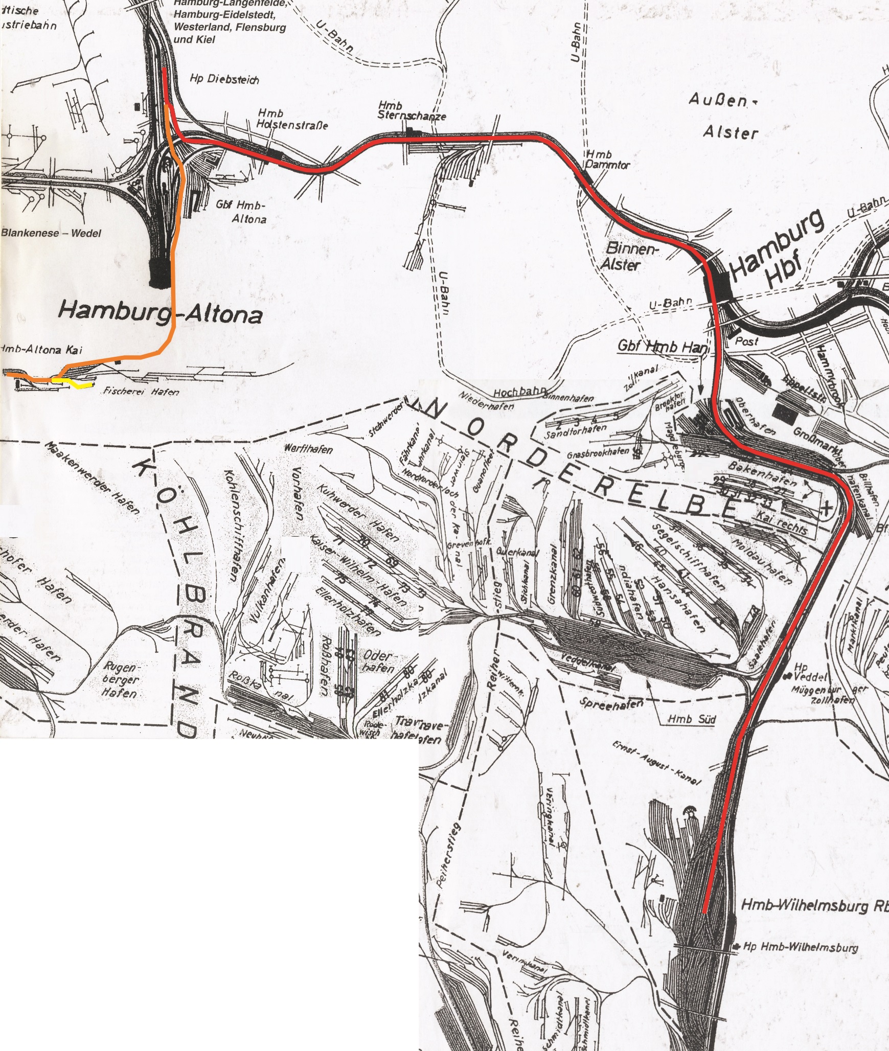 Rot eingezeichnet der Weg unserer Rangierabteilung von Hamburg-Wilhelmsburg über die Veddel zum Kamerunkai