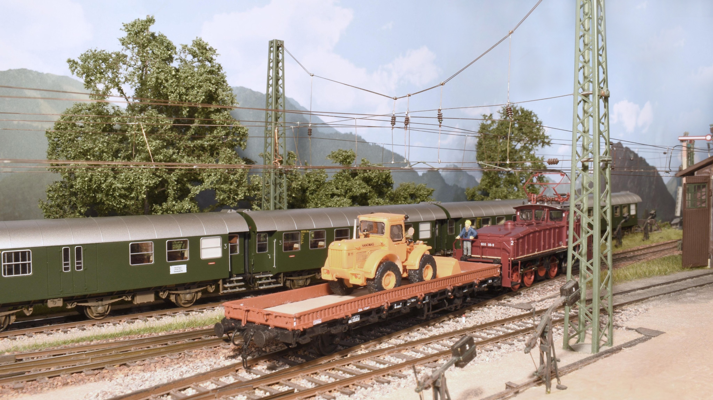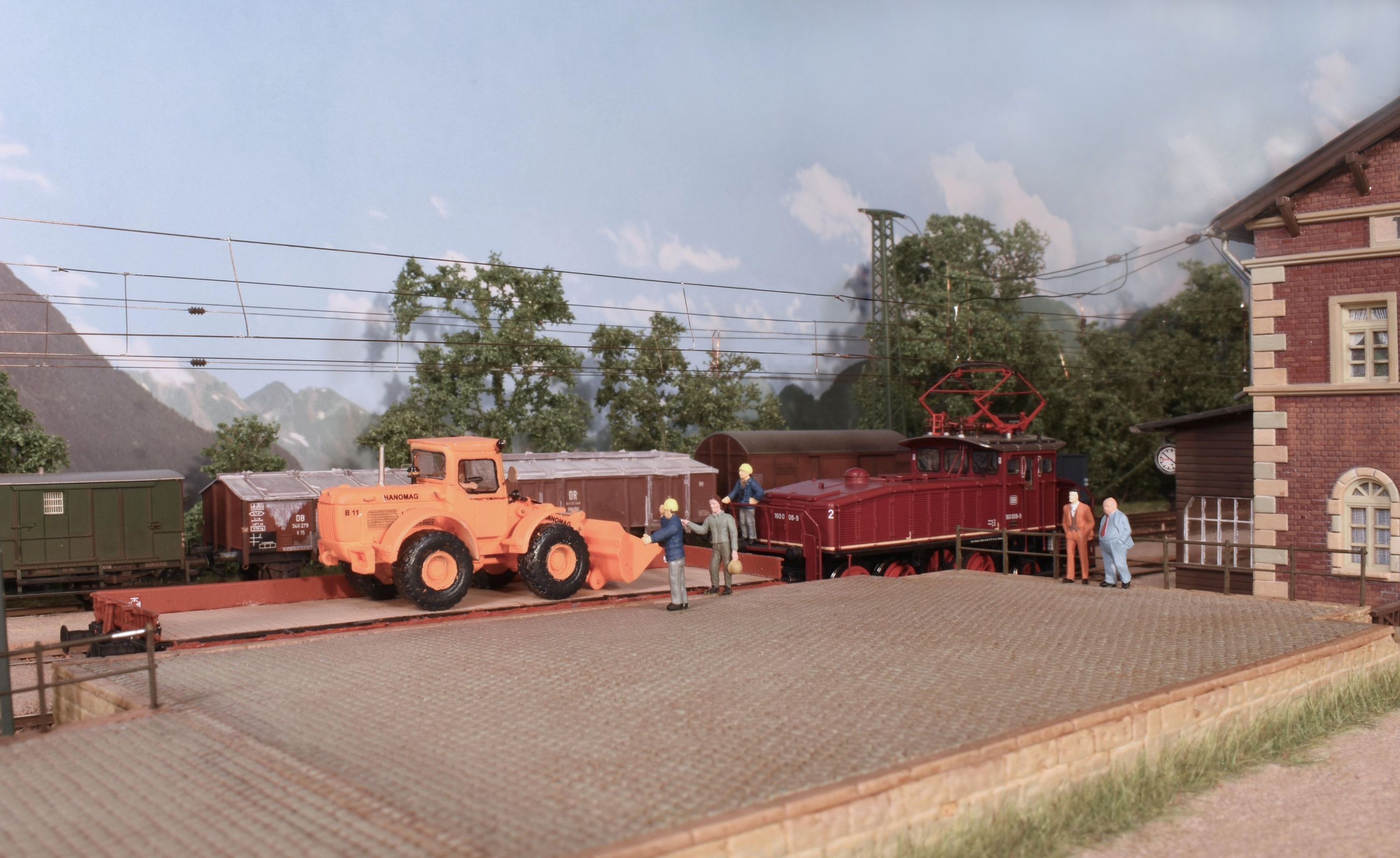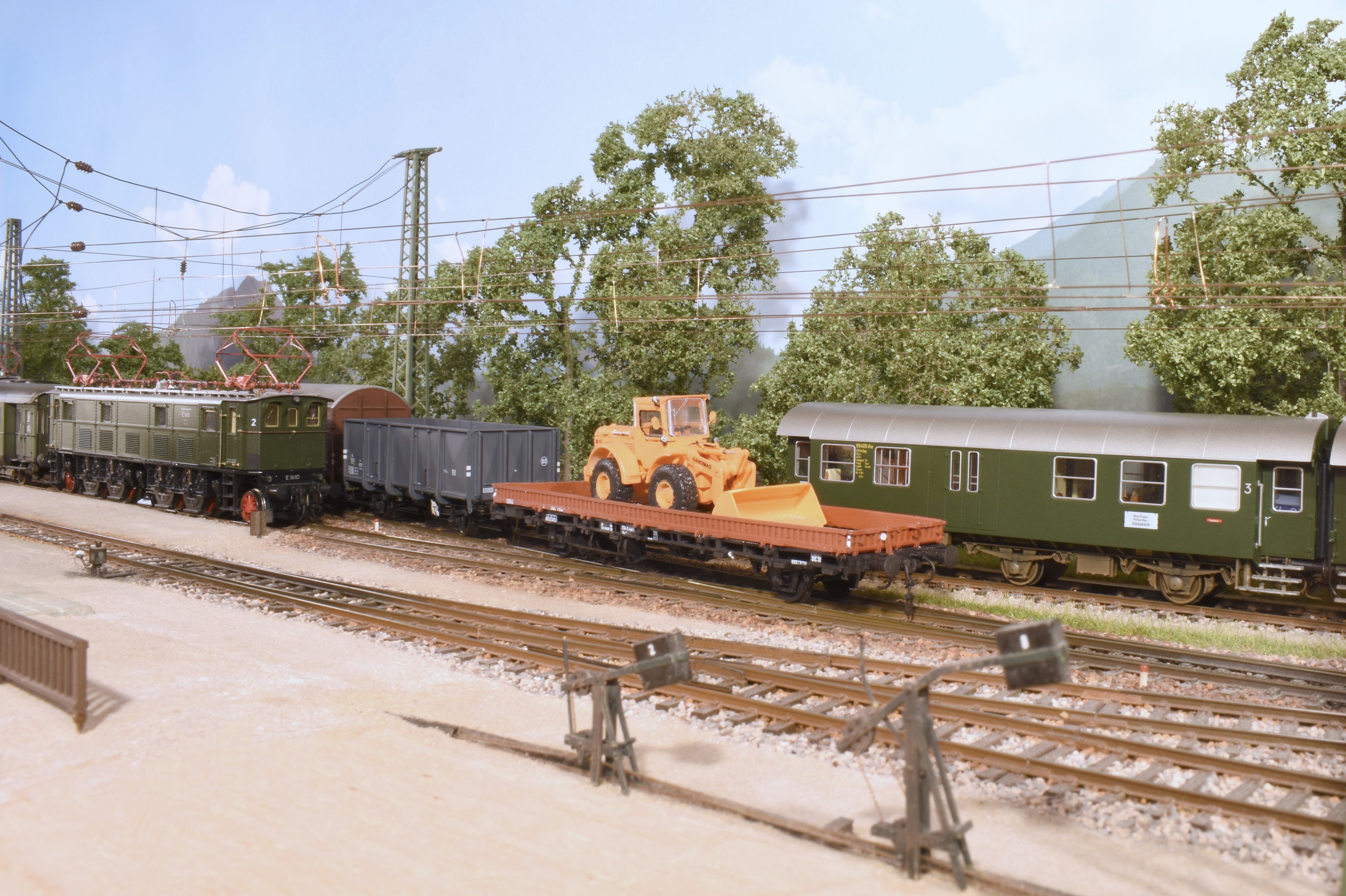 Die Puristen unter den Lesern bitte ich zahlreiche Unzulänglichkeiten bei den Szenen zu entschuldigen. Der Bahnhof Murnau und der Großteil der Fahrzeuge ist in der Epoche 3a (Vorbildzeitraum ca. 1953-55) angesiedelt, weshalb unter Anderem bei den Personenwagen bitte nicht so genau auf die Klassenziffern geschaut werden sollte. Die Rangierlok 160 (E60) und der Flachwagen hingegen sind schon Epoche-4-beschriftet und wurden mir für diesen Teil der Beitragsfolge zusammen mit dem Radlader zur Verfügung gestellt.