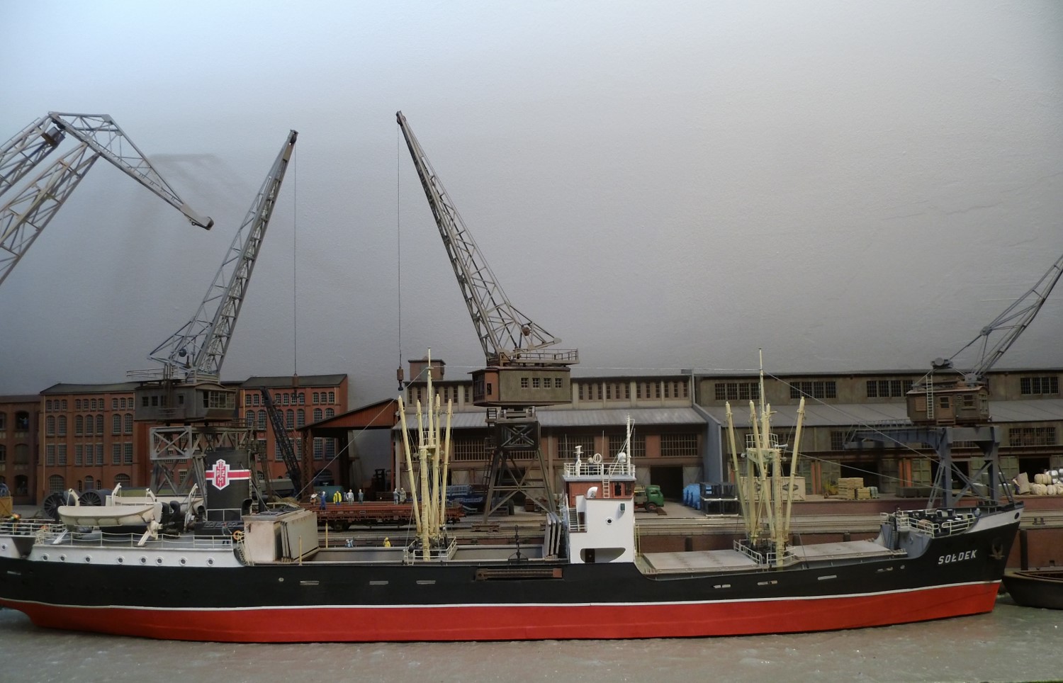 Dort liegt die SOLDEK, ein polnischer Frachter, der als Nachkriegsprogramm mit 28 Schwesterschiffen aufgelegt wurde. Während weltweit Großdieselmotore in der Schifffahrt „state-of-art“ waren, baute Polen weiterhin Schiffe mit kohlebefeuerten Dampfkesseln, wohl aus Gründen der eigenen Kohleförderung und damit reichlich heimisch vorhandenen Brennstoffs. Diese Schiffe waren bis 1980 auf den Meeren unterwegs. Dampfschiffe waren, wenn auch nicht mehr überwiegend, jedoch immer noch in Hamburg anzutreffen.