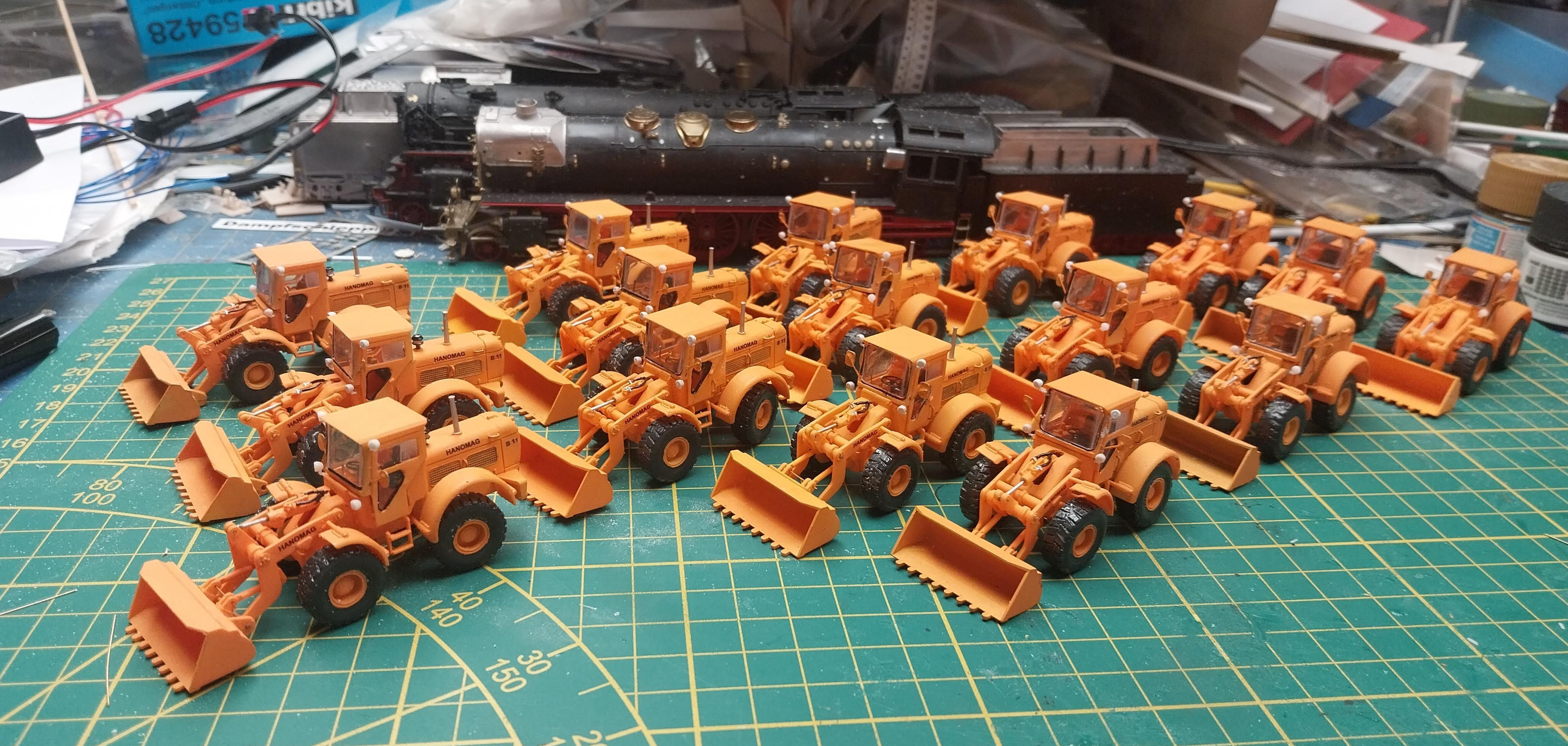 ….ja, ja, es sind nur 16 Maschinen sichtbar, weil 2 nur abgeplant wurden und bereits auf dem Weg nach Vilsheim waren. Einer war bereits in Berlin und das „Urmodell“ bei seinem Schöpfer. Ich habe aufgehört zu zählen, meine aber, dass es 80 Bohrungen pro Radlader waren. Vom ursprünglichen Wiking (s. Vergleichsbild Michael Böttcher) blieb außer Schaufel und etwas Torso nicht viel übrig. Dass ich mich auch da mit der Umbauzeit völlig verschätzt habe, brauch ich nun wirklich nicht zu erwähnen. Der Spott war mir gewiss….