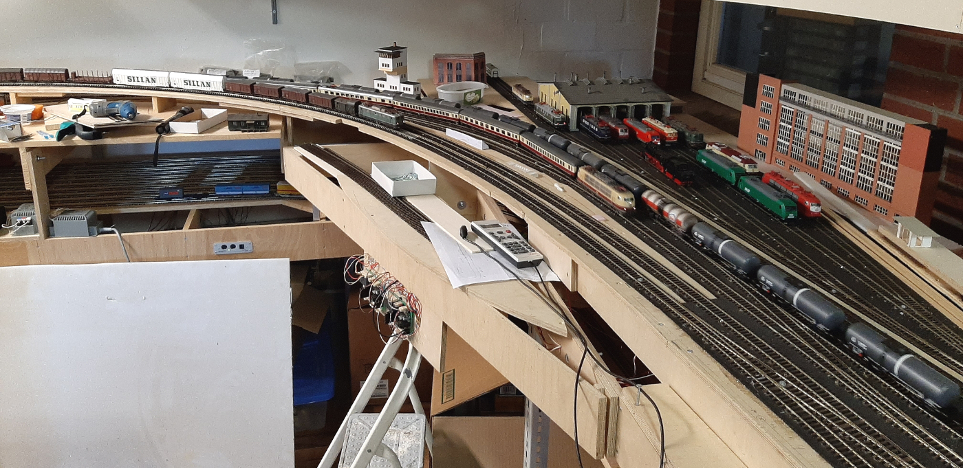 Bisher konnte der Bahnhof nur von einer Strecke aus bedient werden. Jetzt sind auch parallele Aus- und Einfahrten auf beiden Strecken möglich. Und da bei mir die Anlage - auch während der Bauphase - immer betriebsbereit ist, kann ich in diesem Bereich nun auch Erkenntnisse hinsichtlich der Funktion und Betriebssicherheit aller Weichen und Gleisabschnitte gewinnen.