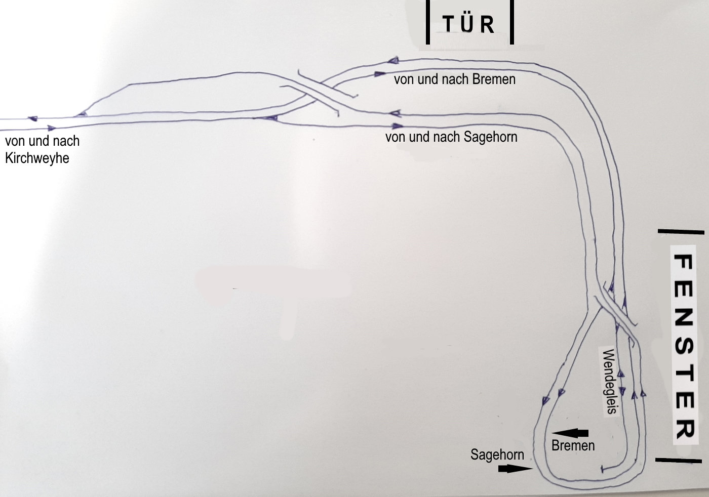 Die beiden Kehrgleise für die Strecken nach Bremen bzw. nach Sagehorn sind jeweils so lang, dass dort gut 2 lange Züge hintereinander abgespeichert werden können. Damit ist ein einfahrender Zug Richtung Bremen oder Sagehorn nicht sofort wieder sichtbar. Selbst auf der eng getakteten Rollbahn war zwar permanent Betrieb, aber die Züge fuhren nun nicht durchweg im Blockabstand. Somit stellt sich für den Betrachter der Galeriestrecke das Bild so dar, dass es immer wieder Pausen zwischen den Zugfahrten gibt. Das Wendegleis im bremischen Streckenast sorgt noch für zusätzliche Betriebsmöglichkeiten, denn hier können Wendezüge oder längere Triebwageneinheiten zwischengespeichert werden. Auch das Gleis ist so lang, dass dort final 2 Zugeinheiten hintereinander Platz finden. Die Illusion einer interessanten Zugfolge ist im Personen- und Güterverkehr damit gegeben. Auch wird das Auge des Betrachters durch den gleichzeitigen Betrieb auf der unteren Ebene zusätzlich abgelenkt.