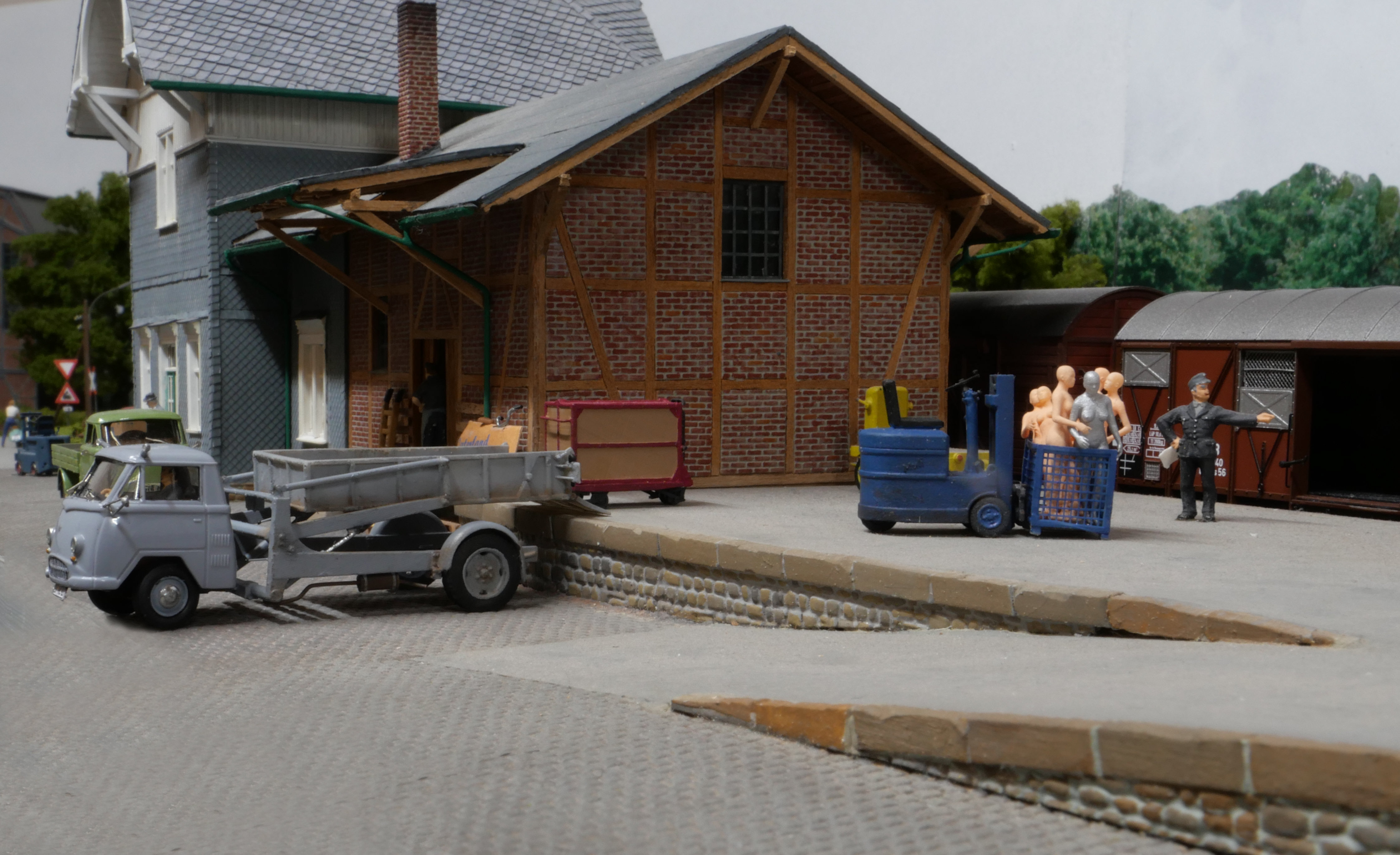 Immerhin, es ist alles verladen, der Ng kann sich auf pünktlich auf die Reise machen. Aber welcher Witzbold hat denn die Tür offen gelassen? Unglaublich, wo doch der Zug in Schrittgeschwindigkeit den unbeschrankten BÜ passiert...