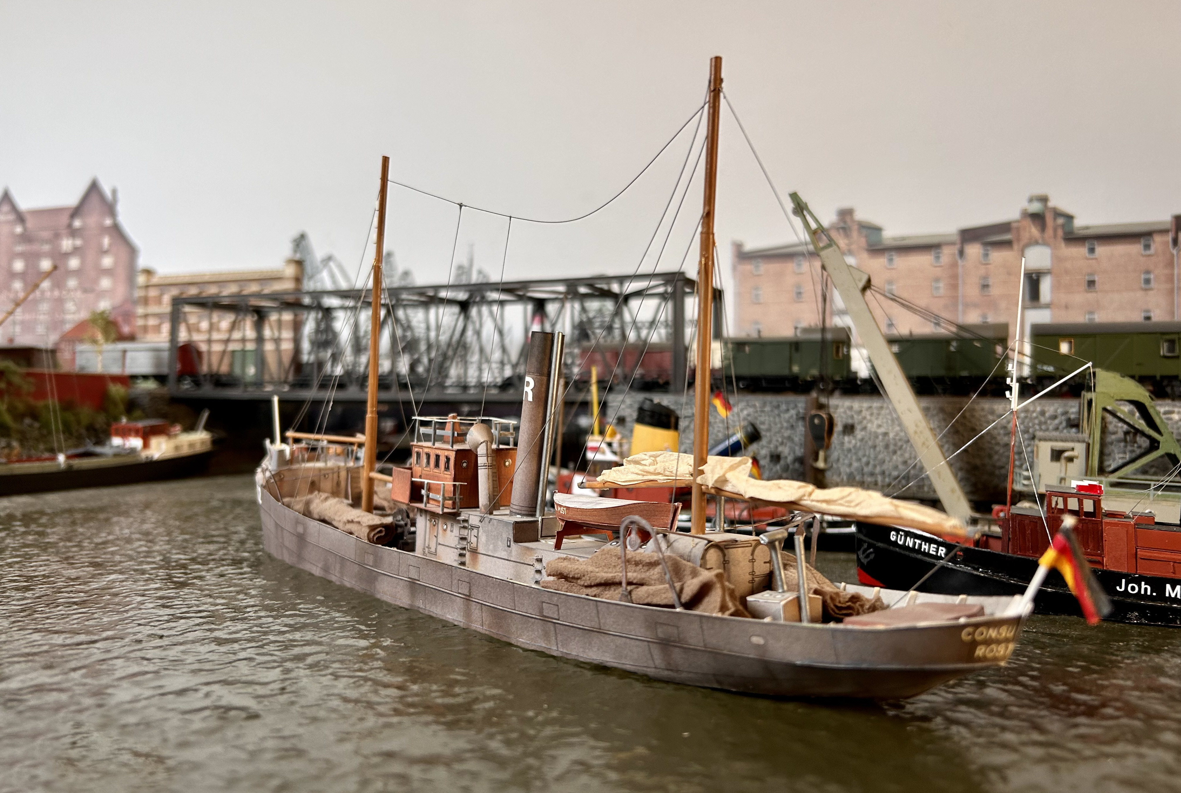 Ohne auf Details eingehen zu wollen, möchte ich aber zumindest die Hauptakteure nennen mit der Hoffnung, keinen vergessen zu haben. Los gings mit der Idee (Manfred/Heino/Hajo) über die Anlagen von Manfreds Silschede/Schee über Günthers Brebeck und Heinos (AG Oyten um Klaus) Hafenstadt im Norden und Klaus Eckermanns Modul "Dielingen" zu meinem Hafen, Vorbildrecherchen per Buchfahrplänen von Michael Böttcher, die herrlichen Telexe, die uns unser Freund Fred Sonnenrein auf Originalpapier ausgedruckt hat, die "Beratung vor Ort" durch Jürgen Danner, die Original-G+H-Paletten, die Manfred nach meinen Maßen gezeichnet und Andreas gedruckt hat, die Suche nach dem richtigen Material für die Steinwolle etc......, die Werftarbeiter mit ihren zahlreichen "Nachtschichten", die dem einfachen Kartonmodell ein Unterwasserschiff spendiert haben, den Photoshoppern Heino und Manfred..... und sicherlich noch einige mehr, die ich jetzt vergessen habe.