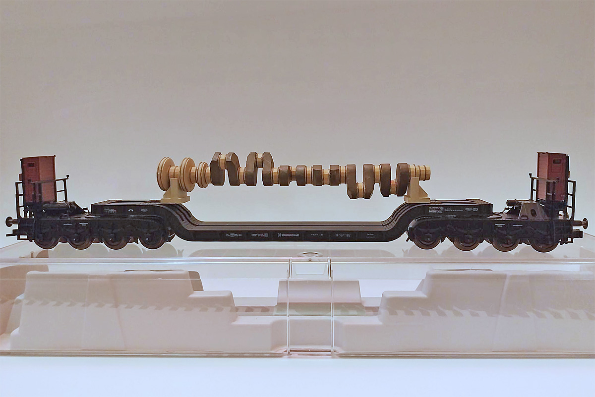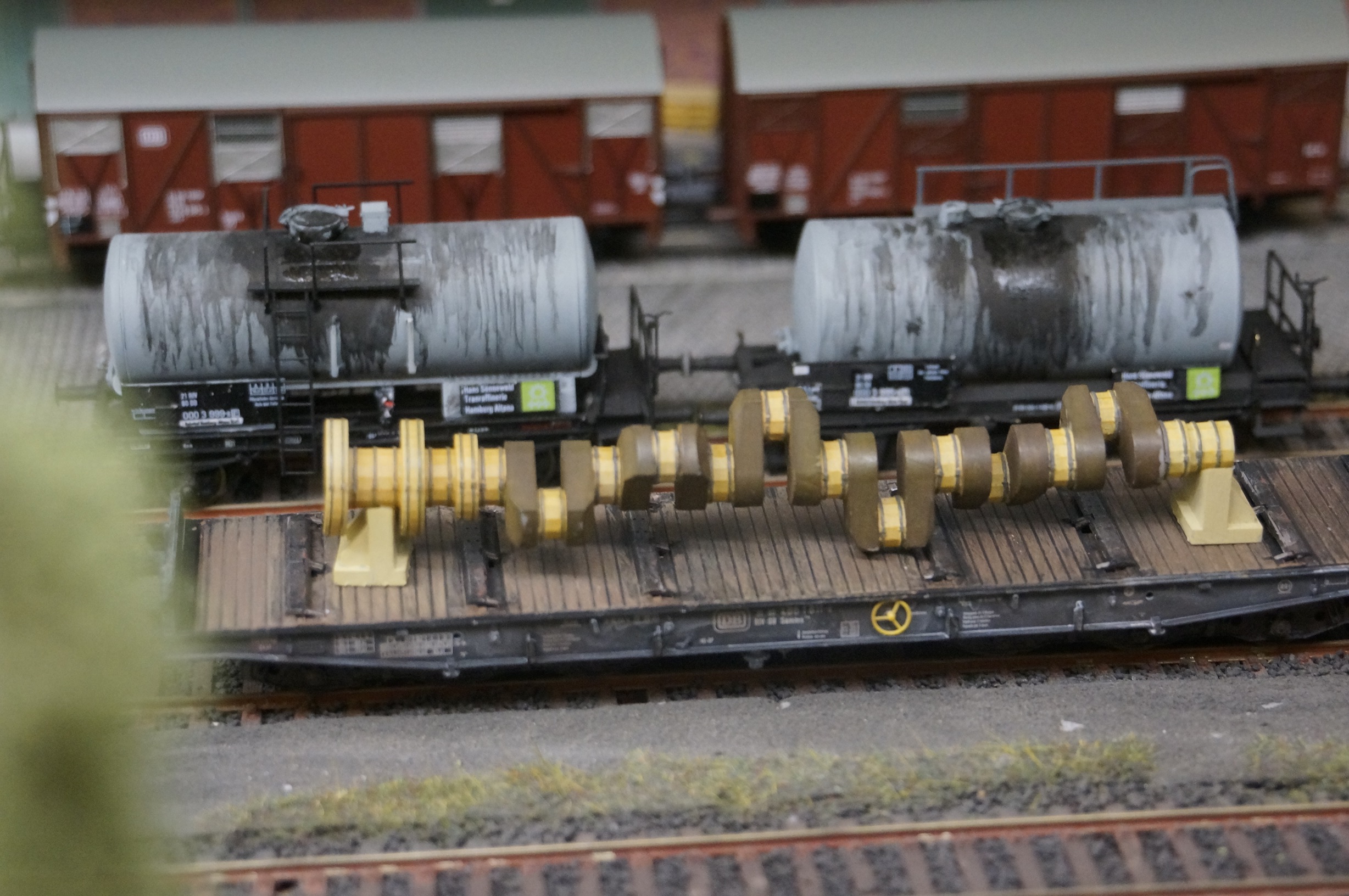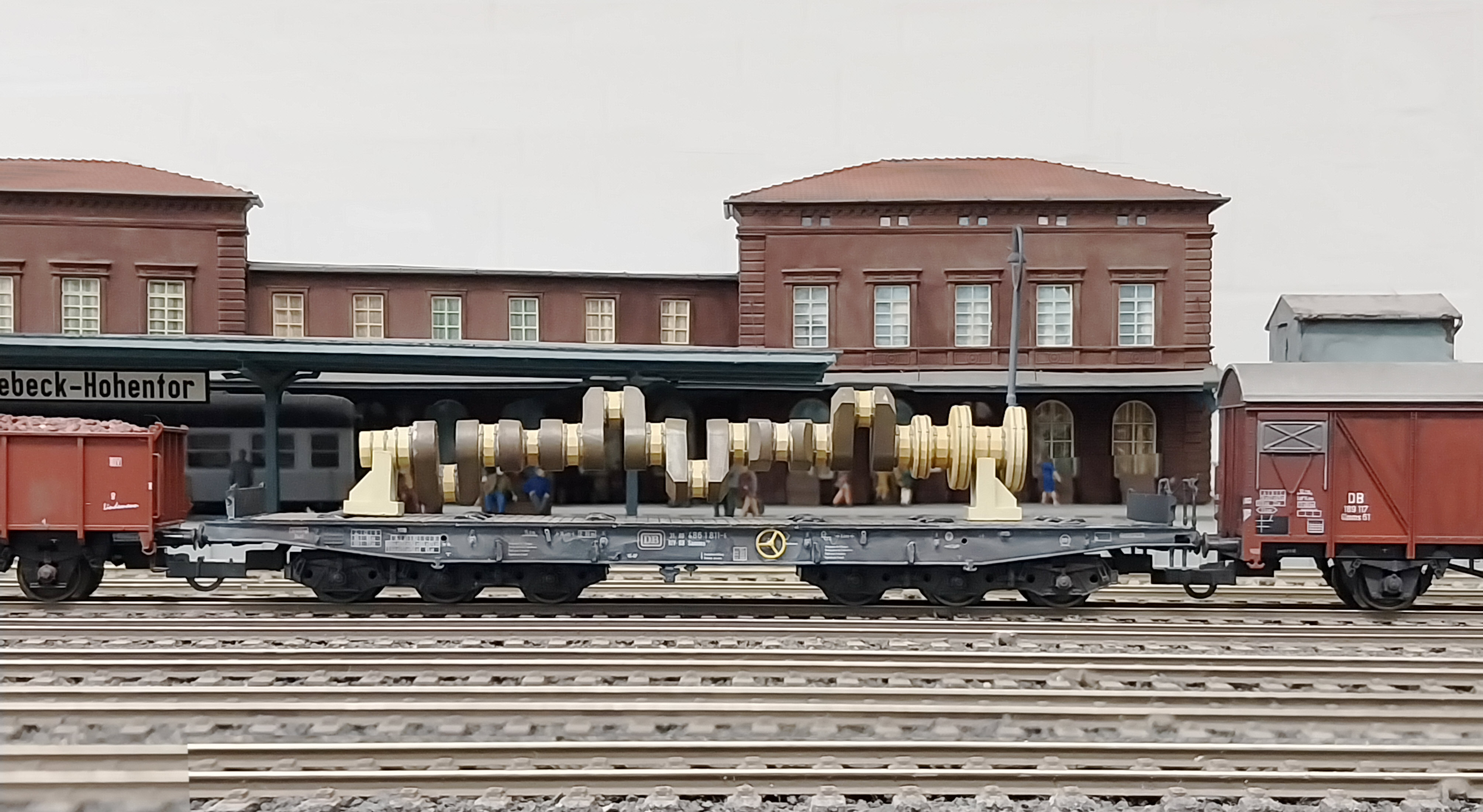 Fangen wir mit der Masse der Welle an: anhand des Volumens und des spezifischen Gewichts mag die Welle runde 35 Tonnen plus Verpackung wiegen. Da wird’s mit 4-achsigen Wagen schon eng. Also mussten Schwerlastwagen ran. Das wunderschöne Fleischmannmodell (Tieflader) hatte ein zu kurzes Bett, wie aufwändige Vorversuche ergaben: