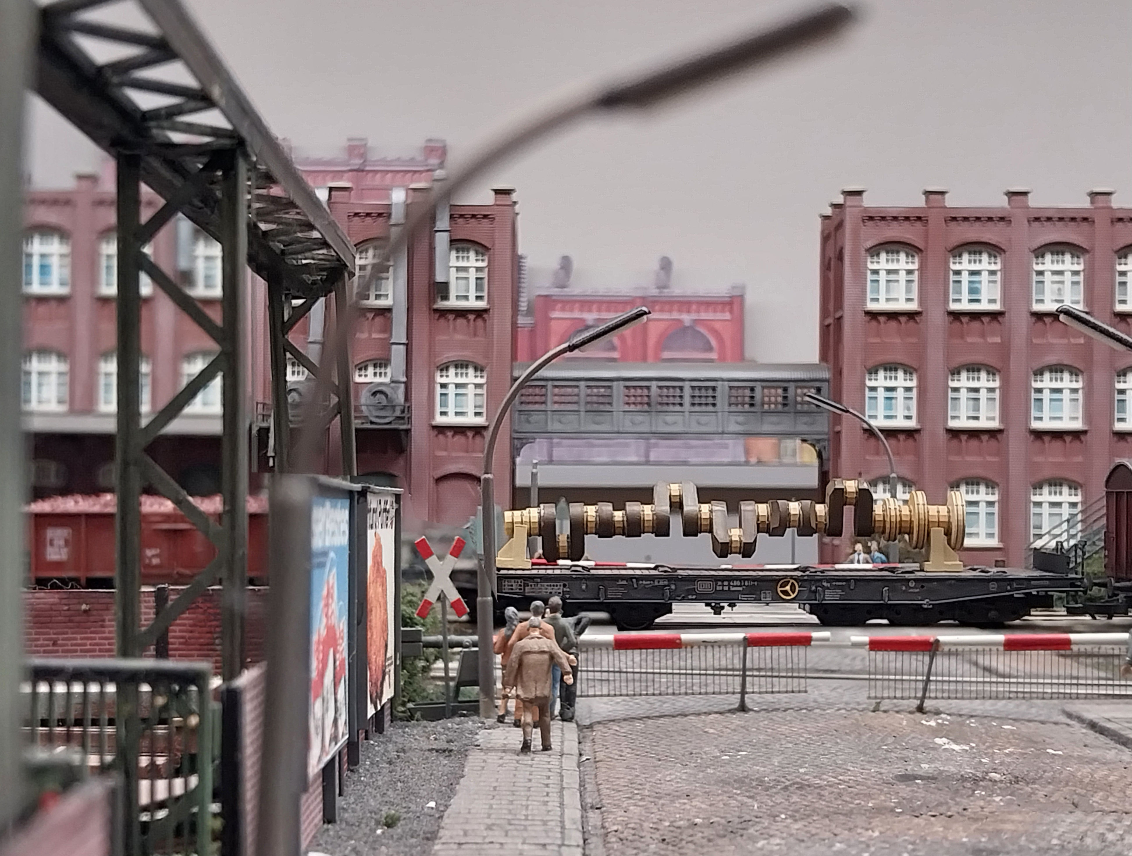 Noch einmal passiert die Kurbelwelle also den Ort ihrer Entstehung; im Vordergrund übrigens noch ein weiteres, eindrucksvolles Großritzel auf einem preußischen Tieflader.