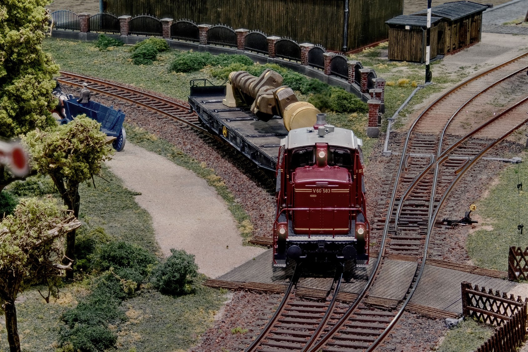 Auf geht’s, die Stangenlok schiebt den Flachwagen in den Übergabebahnhof zur Bundesbahn: