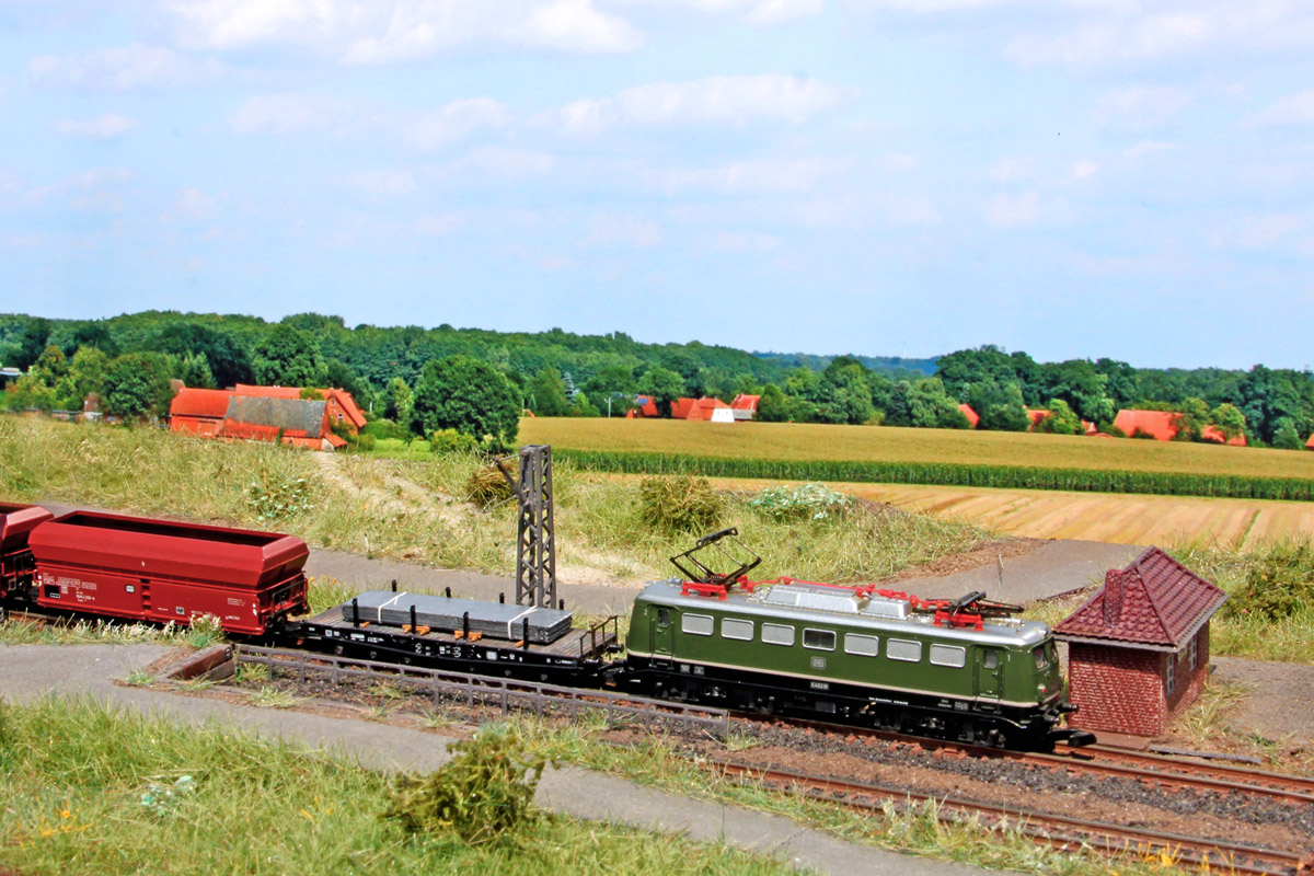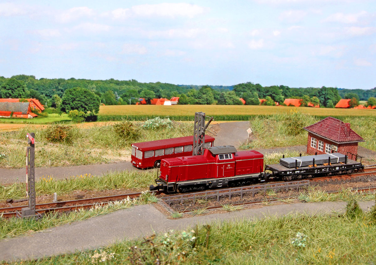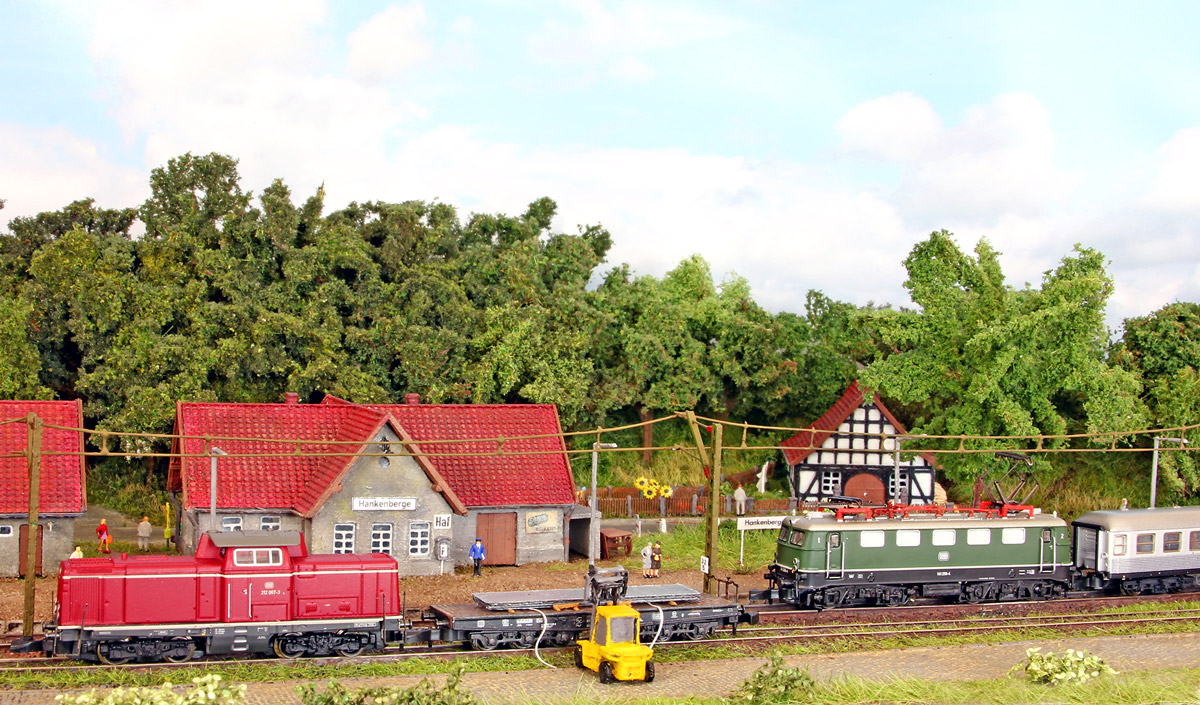 Im Hintergrund rauscht gerade D739 von Bielefeld nach Hamburg Altona seinem nächsten Halt Leese-Stolzenau entgegen, der Lokführer will los, schließlich müssen sie zum Umsetzen erst noch nach Windheim: "So, hinter dem da können wir auf Strecke, ist das Holz da hintendrauf noch fest?? Wenn der Schnellzug durch ist, schließ mal Weiche auf, ich zieh dann vor..." "...jo Meister..."